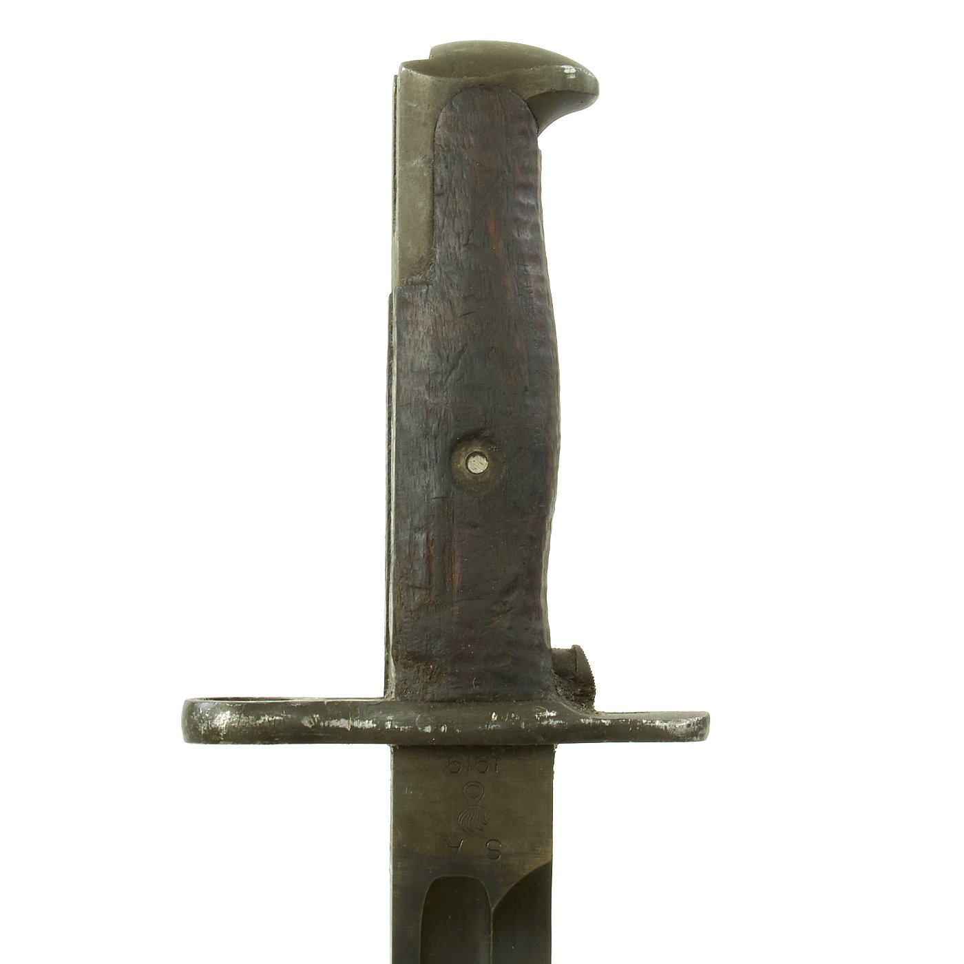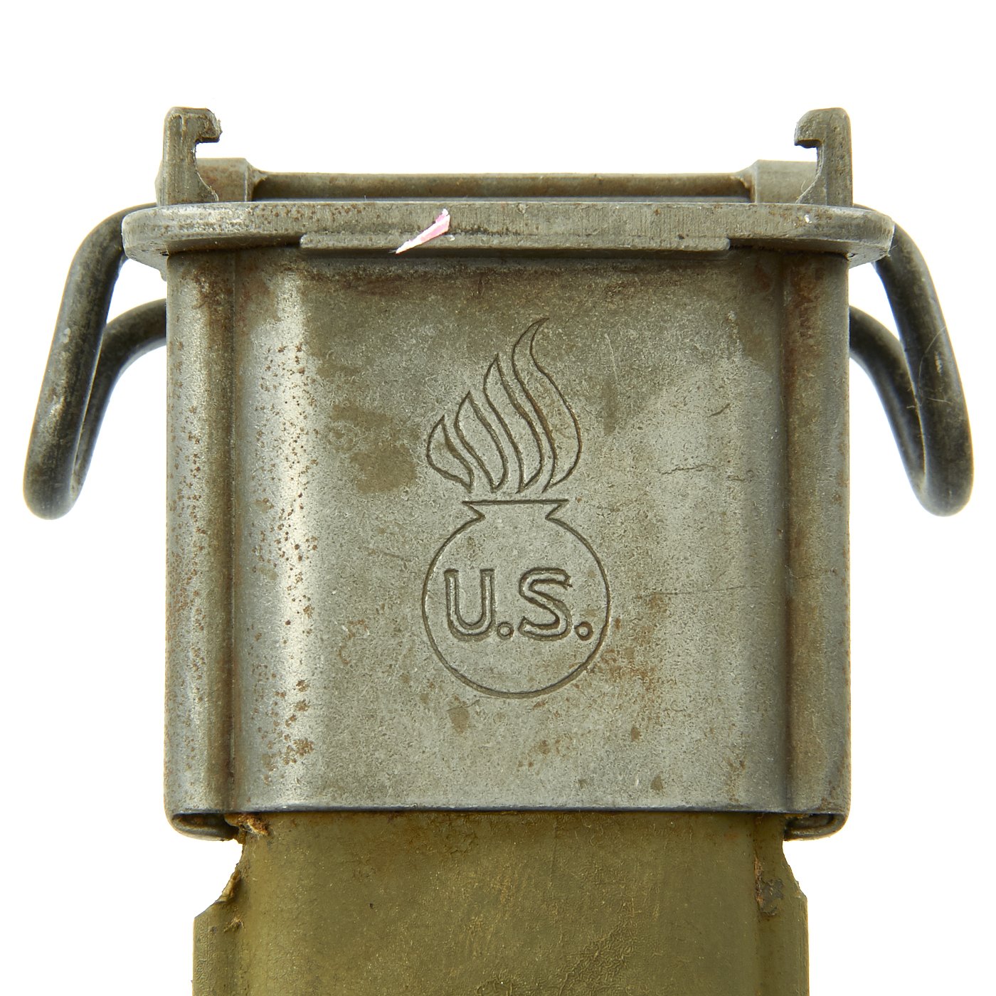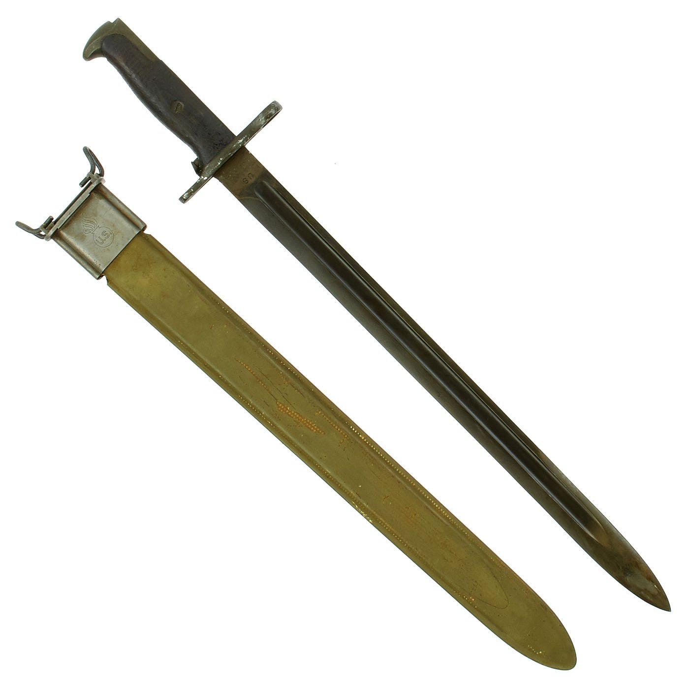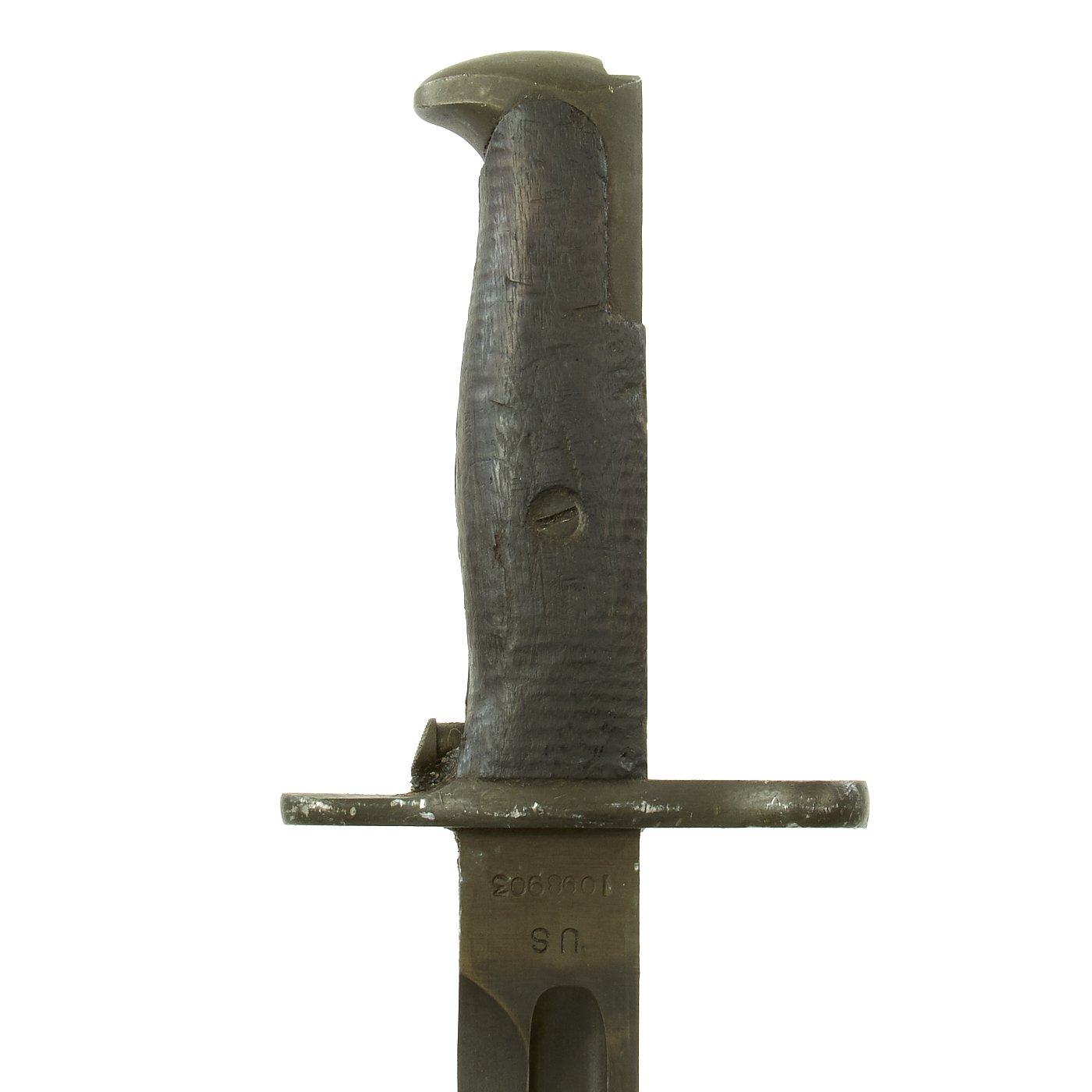 Original Item: Only One Available. This is an excellent condition U.S. M1905 bayonet dated 1906, originally made before WWI for the M1903 Springfield Rifle. It was then updated and reissued in WWII for the M1 Garand Rifle. It is fitted with a WWII Issue M3 fiberglass scabbard. The Garand was designed to take the same blade bayonet as the M1903 Springfield rifle, so at the beginning of the war they were issued with bayonets originally made for those rifles. Later in 1942 to keep up with wartime production, new orders for M1905 bayonets were placed, which had plastic ribbed grips. These were also sometimes fitted to M1905 bayonets made previously that had damage to their wooden grips, however this example still has the original grips.