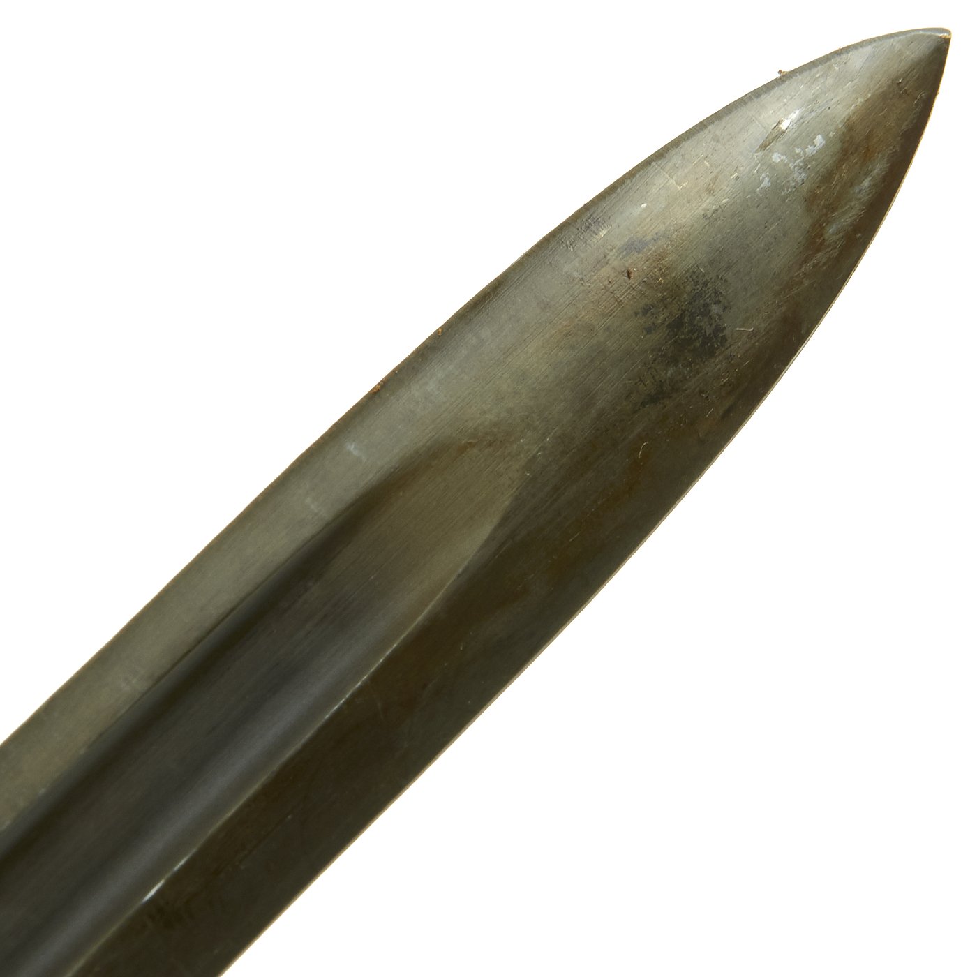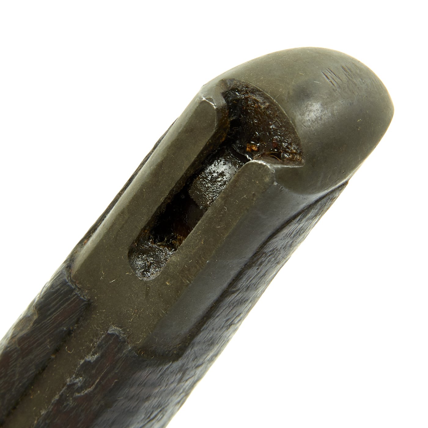 In 1943, the specification for bayonets was changed to have a 10 inch blade, and many M1905 bayonets were shortened to this length. This bayonet however is still in the original configuration, which is rare to find on the market today. It looks to still have the original WWI Era blued finish, and was not parkerized for WWII