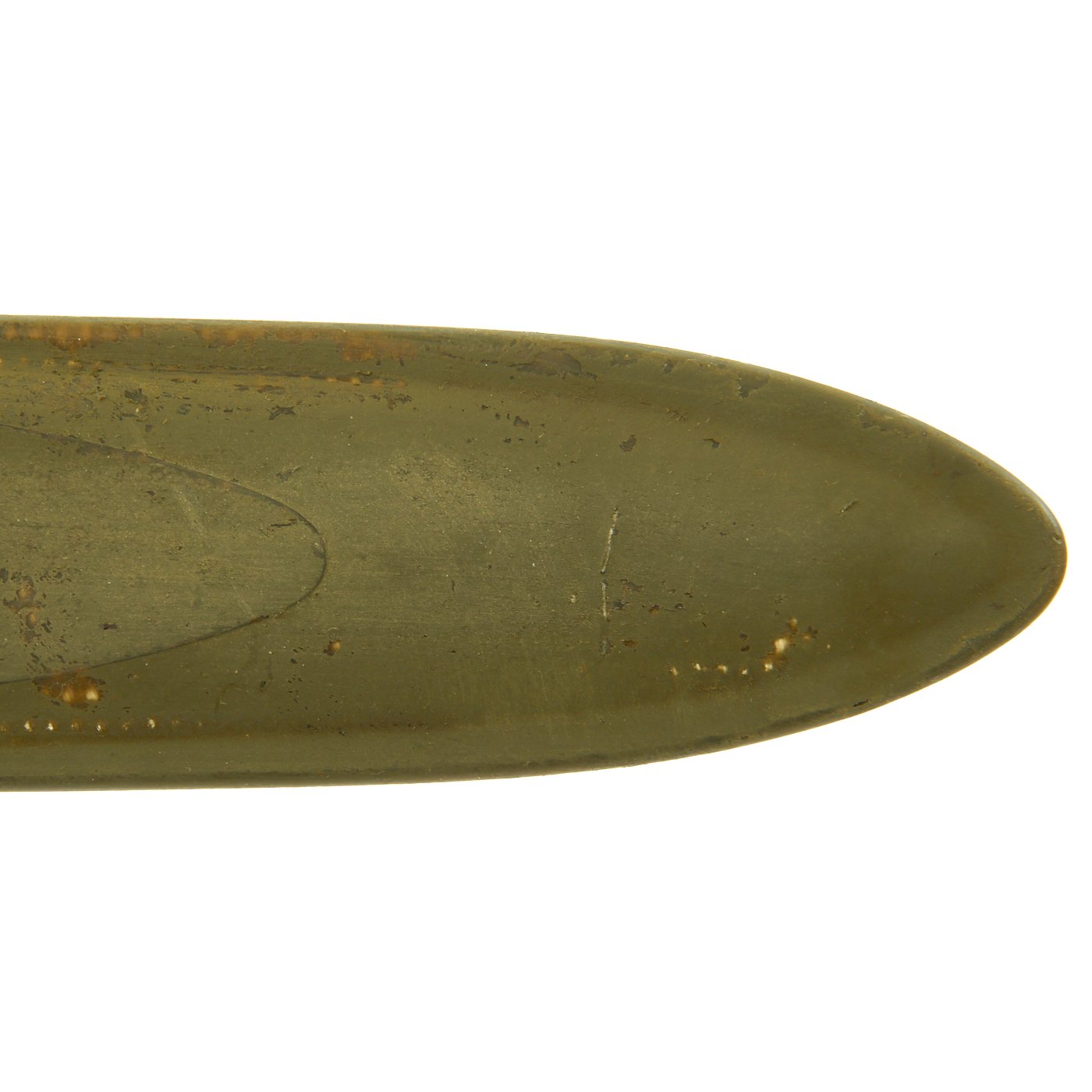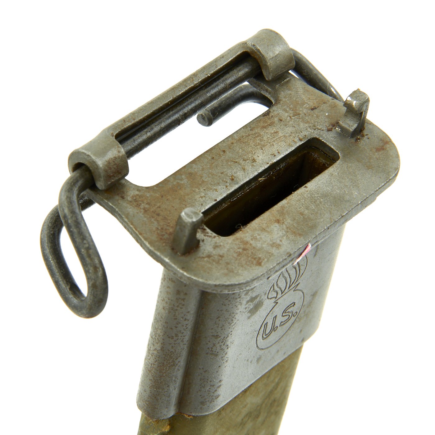 The original M3 Fiberglass scabbard is marked U.S. on the parkerized steel throat over the "Flaming Bomb", and is in very condition. The V P marking on the underside of the metal throat lip indicates manufacture by Victory Plastics, a division of Beckwith Manufacturing, who produced a variety of fiberglass scabbards during the war. The throat is in great shape, and most of the paint on the fiberglass body is still present, though it doe show wear through in places.