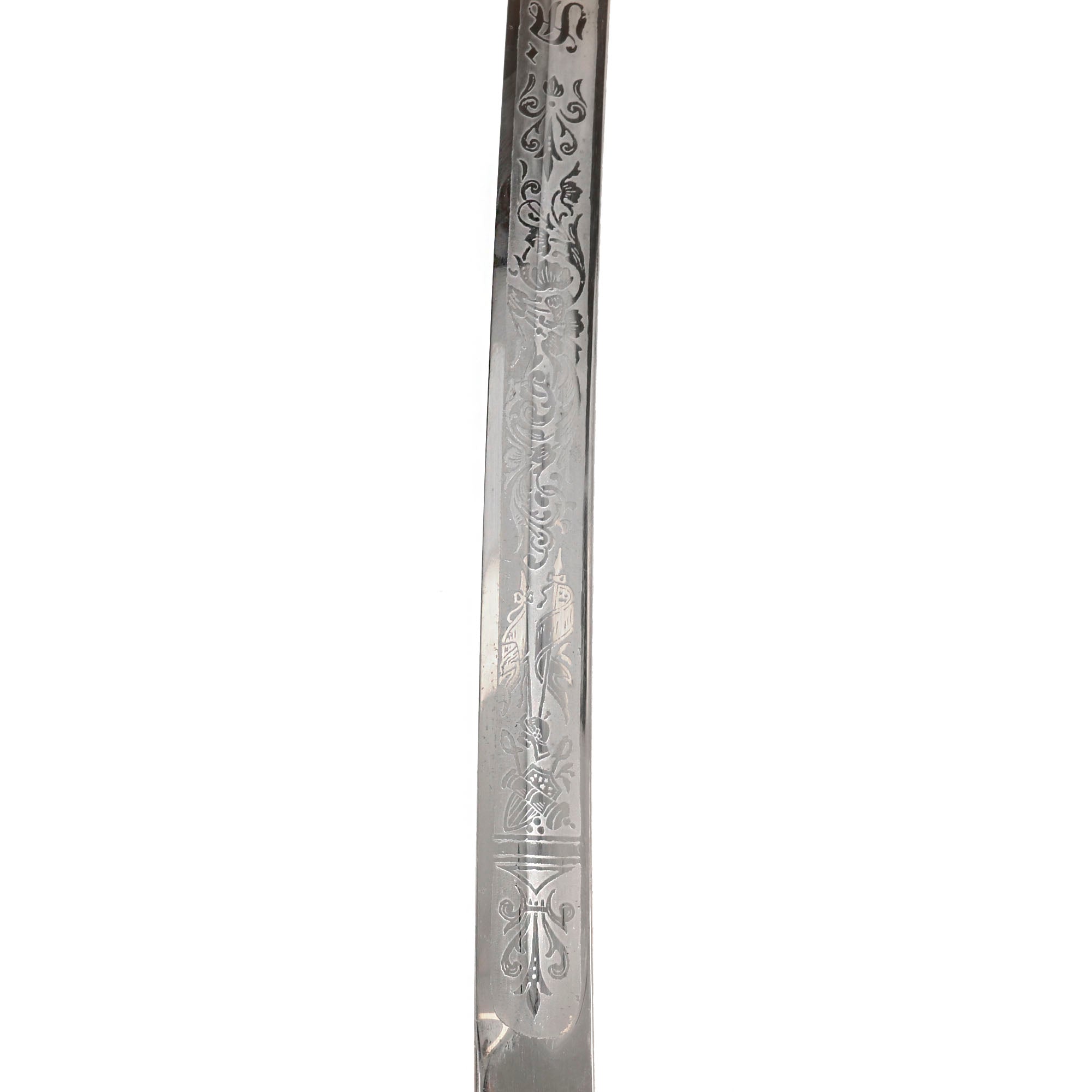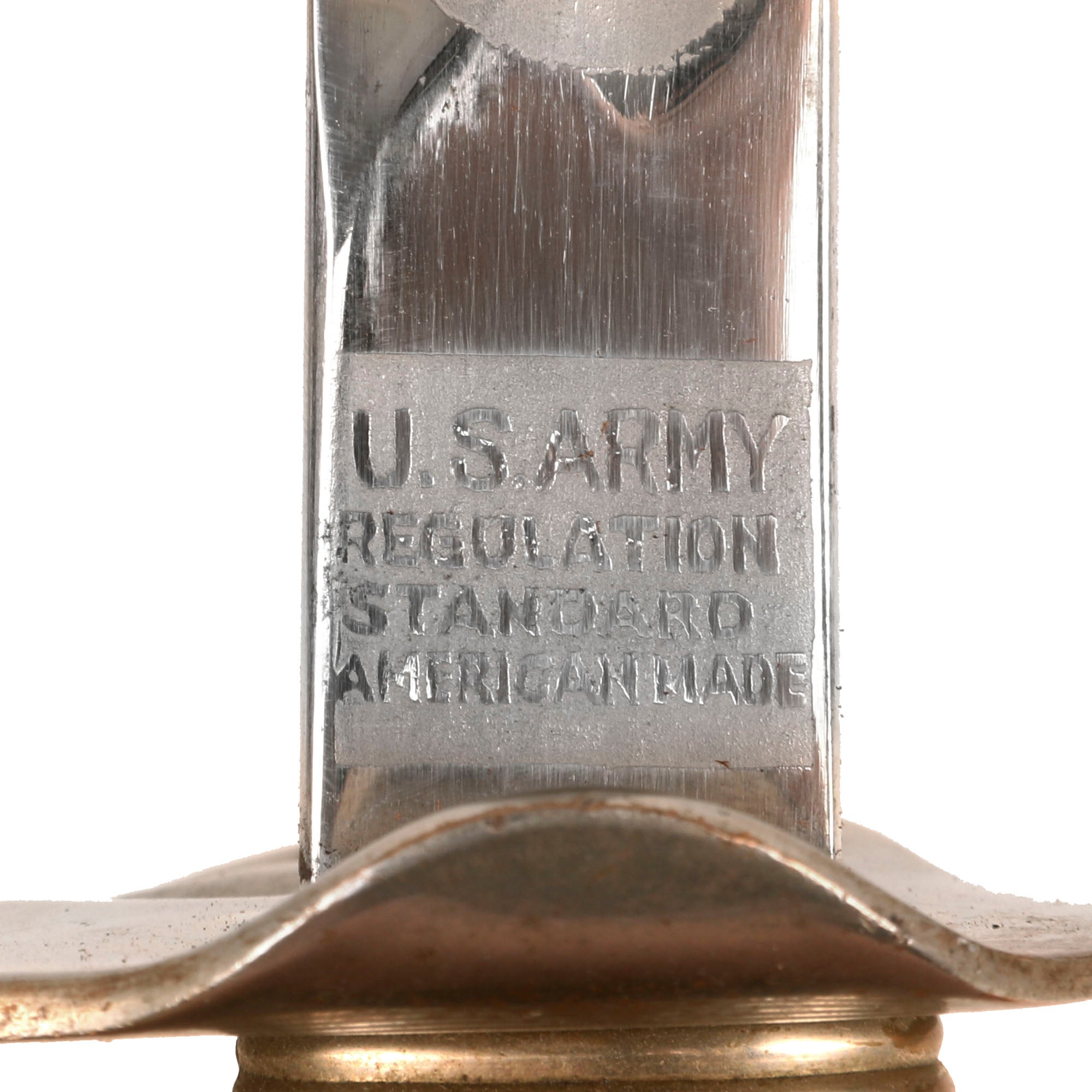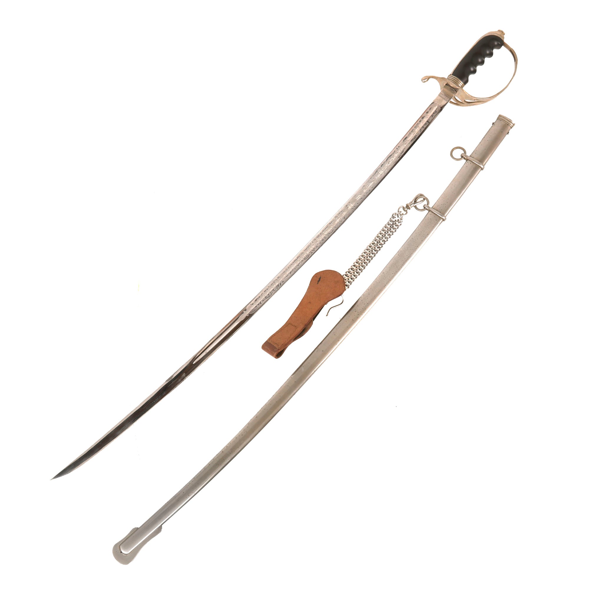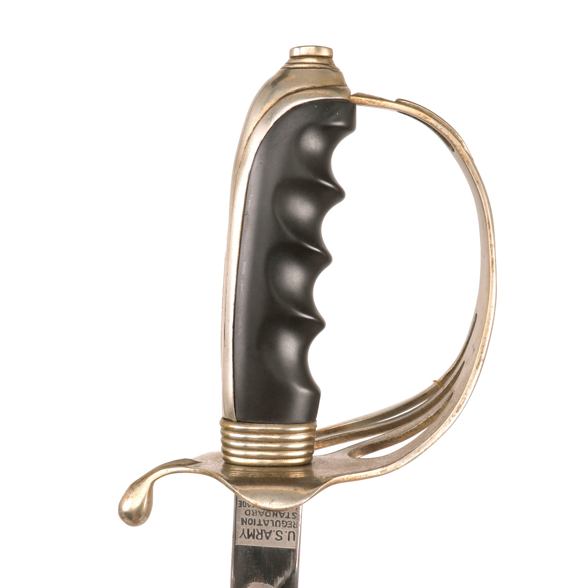 Original Item: Only One Available. The Model 1902 Army Officers' Saber is the current sword used by officers of the United States Army. The official nomenclature for the current regulation U.S. Army saber is “saber for all officers, Model 1902”. It was adopted on July 17, 1902 by authority of General Order No. 81. The M1902 saber was authorized for all officers, both infantry and cavalry, with the exception of Chaplains. The lightly curved blade measures between 30-34 inches long with weights initially specified by the U.S. Army to be between 20.2 and 22.8 ounces (573 to 647 grams) and a point of balance of 3.25 inches from the hilt as specified for infantry sabers.