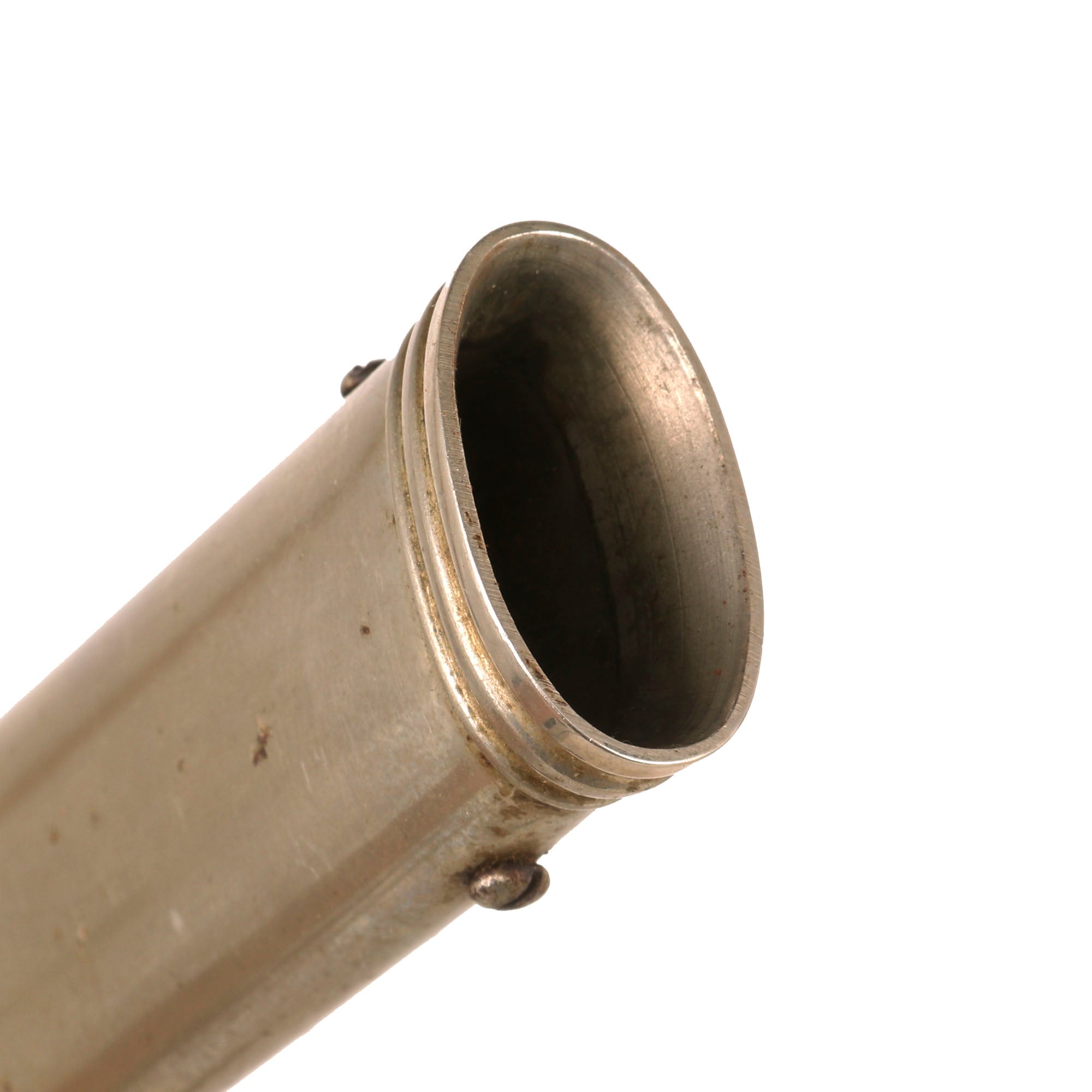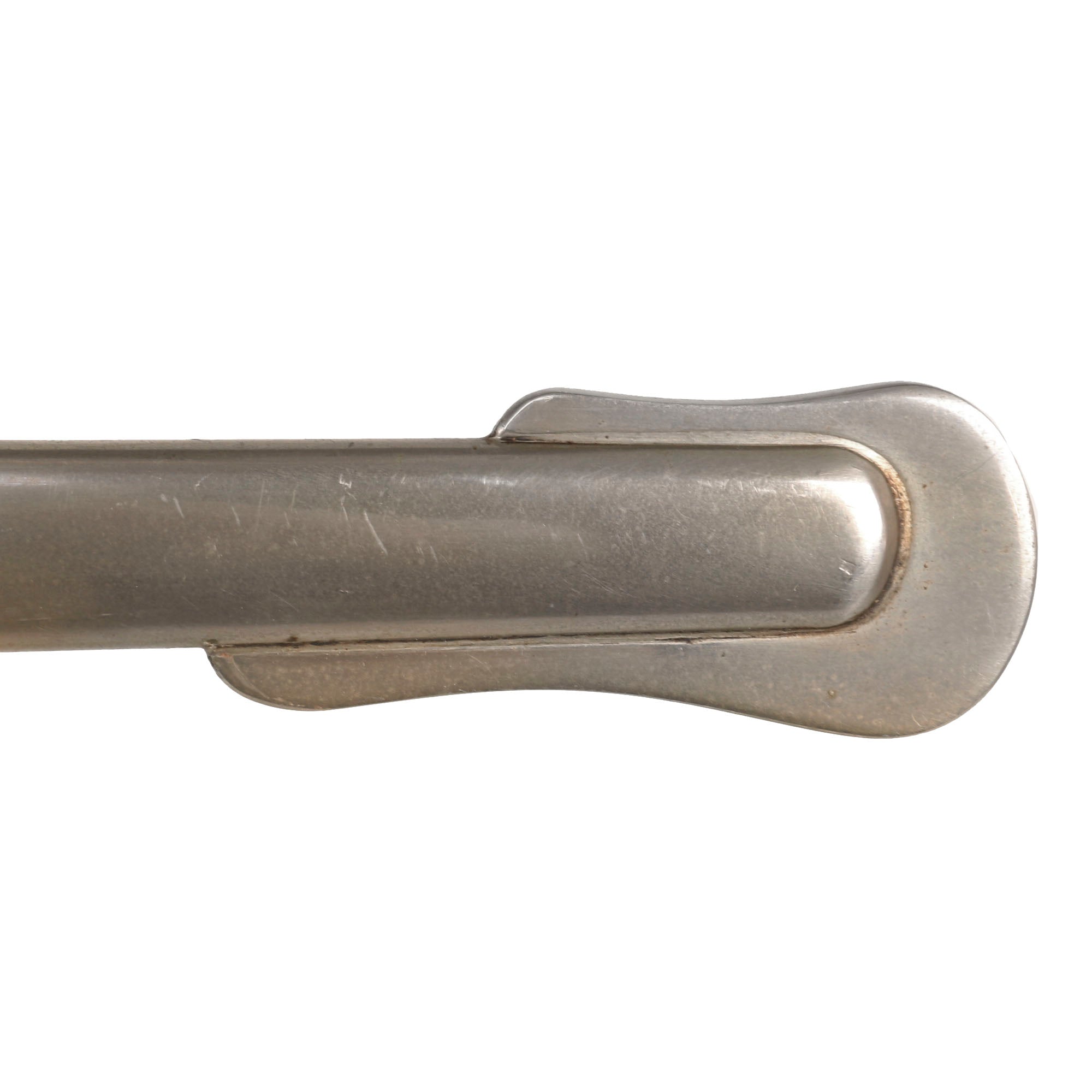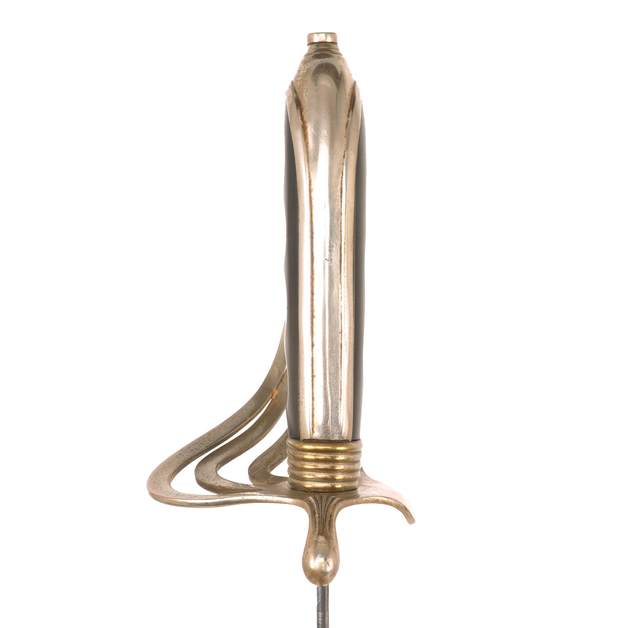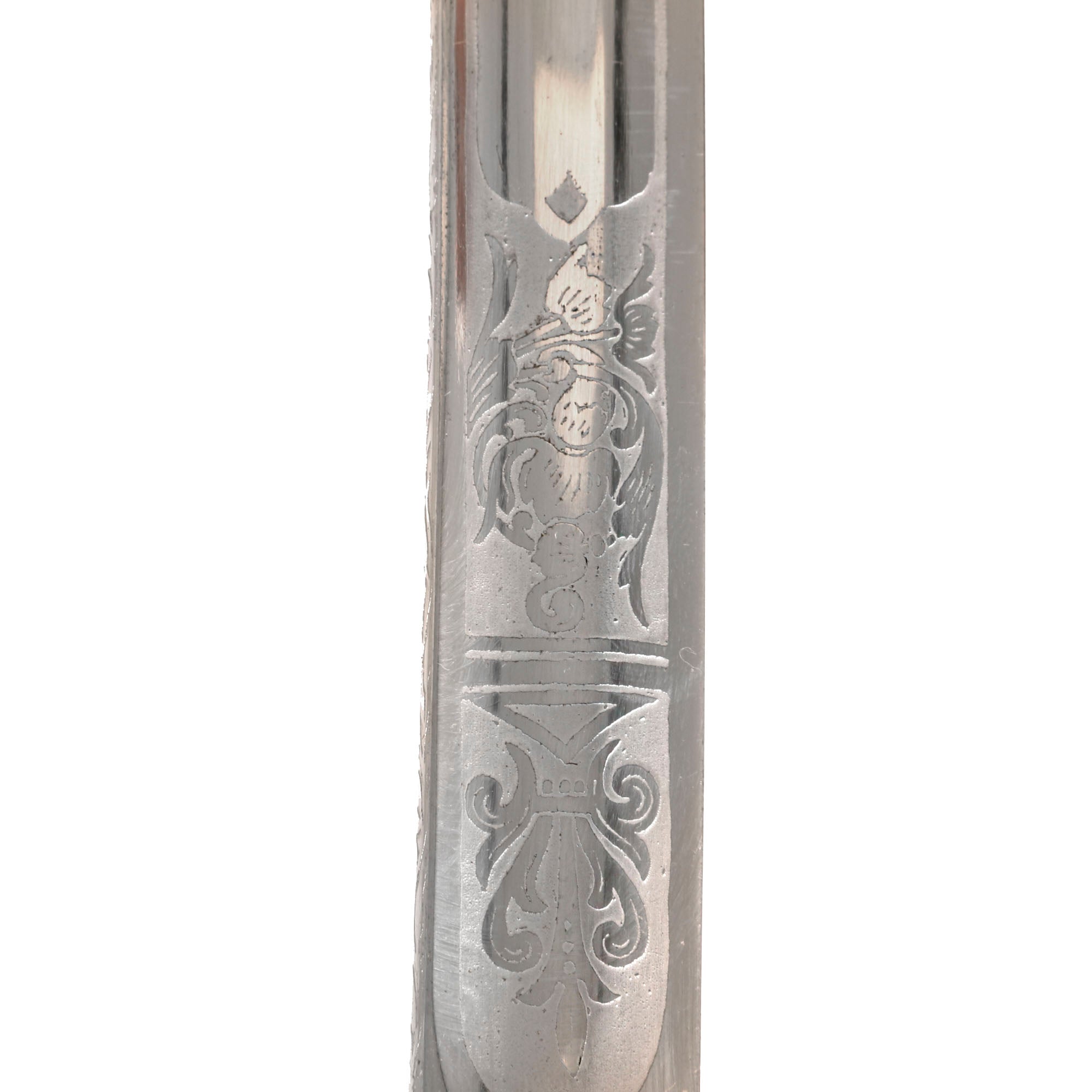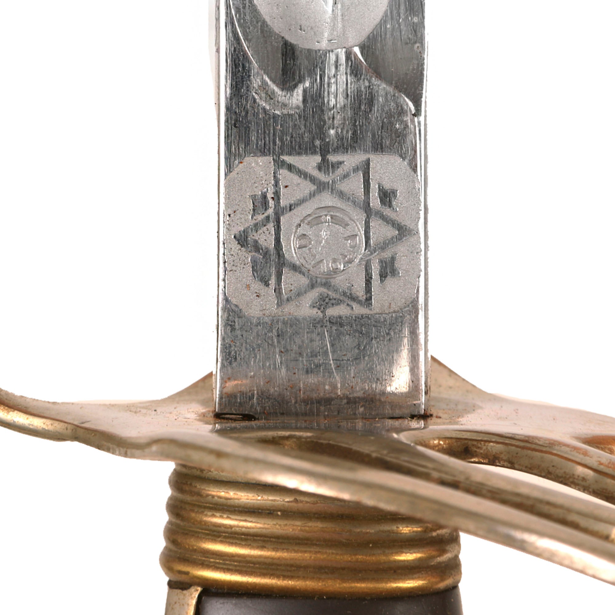And on the reverse with the common PROVED insignia. Condition is good, without any serious wear to the plating, and the etching is very well-retained. The leather blade buffer is gone. The original hanger is retained on the scabbard, and is marked RUST PROOF FRANCE.