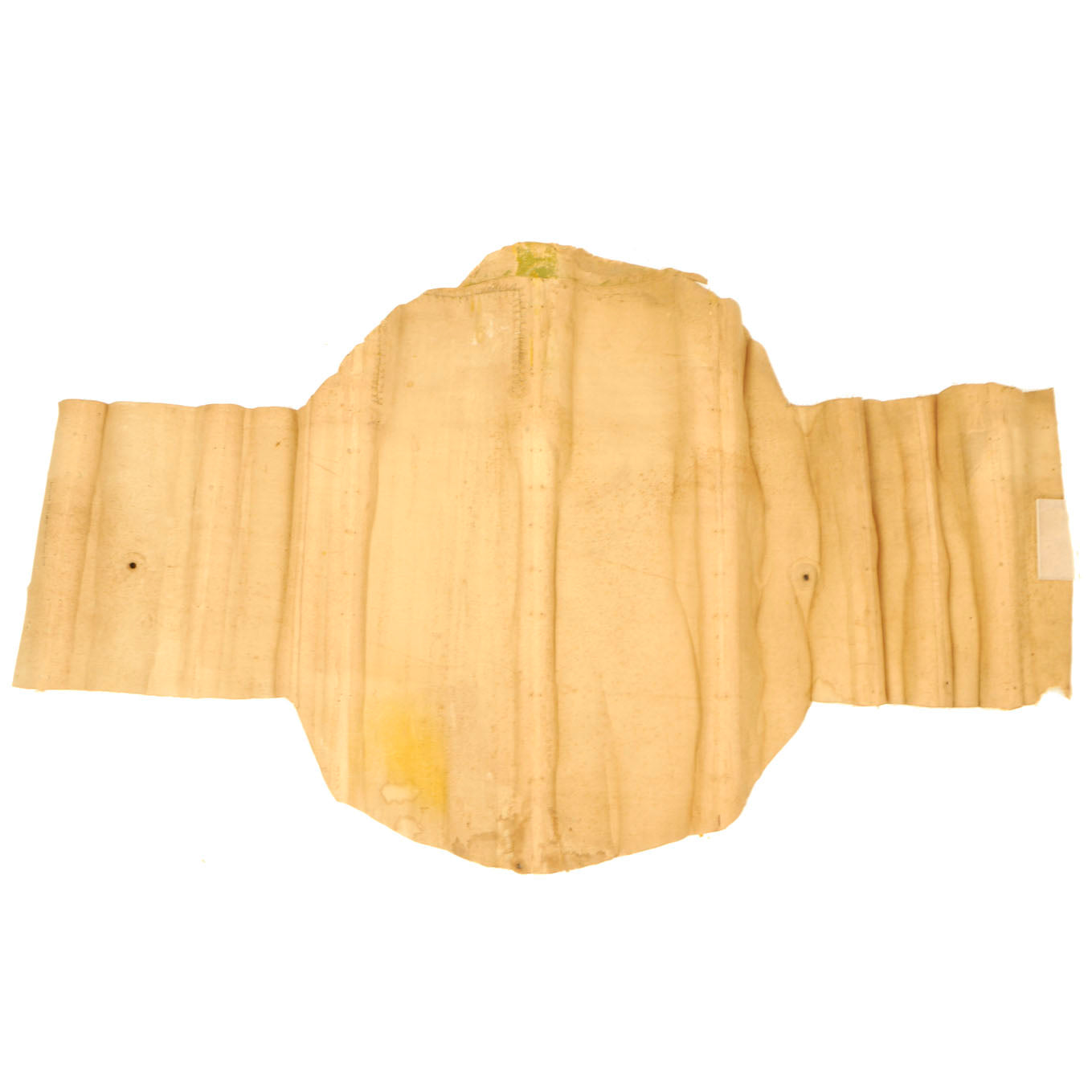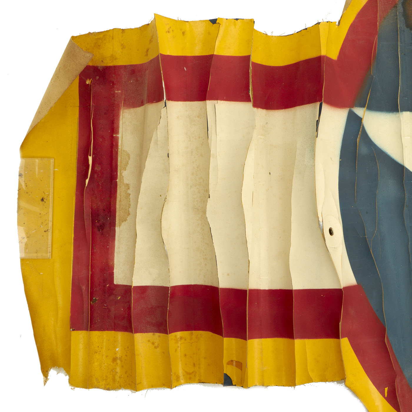 Original Item: Only One Piece Available. Now this is an interesting item to behold. It is a 60 inch long piece of material cut from a Boeing-Stearman training airplane! The canvas type material features an all yellow surface paint with the all white 5 pointed star with a blue painted circle and with a white rectangle on both sides of the circle. This symbol with the all white star generally signifies use within the U.S. Navy.