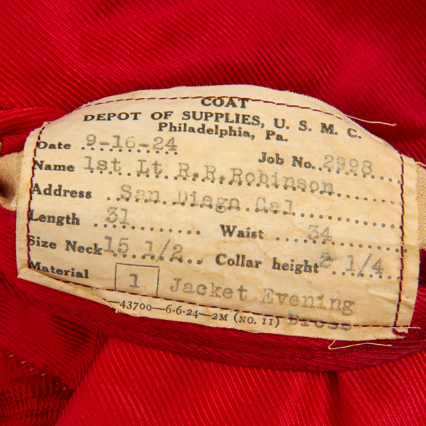 This uniform set belonged to Colonel Ralph R. Robinson. Colonel Robinson first enlisted in the Marine Corps as a Private on May 24, 1917 and soon after left for Marine Corps Officers Training in October 1917 to receive his Commission. During WWI he is seen serving with the 1st Machine Gun Replacement Battalion and the 5th Marines. After the war he is seen serving with the 63rd Company of the 8th Regiment in Haiti. He served in various positions throughout his career as a Marine, one of which was being a part of the Marine Detachment aboard the USS Maryland during the Japanese attack at Pearl Harbor in December of 1941! We can’t pinpoint exactly where he was for the attack but he is seen being a part of the Detachment in November 1941 up until January 1942 when the USS Maryland was cleared for sea duty after damage sustained during the attack. We concluded that his service in the Marine Corps ended some time in the early stages of the Korean War due to him being seen as mustering with an Air Wing unit in 1950.