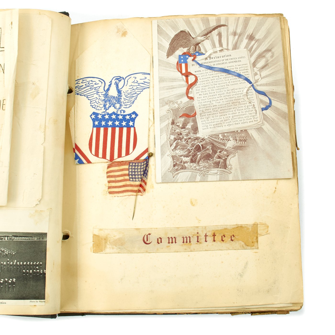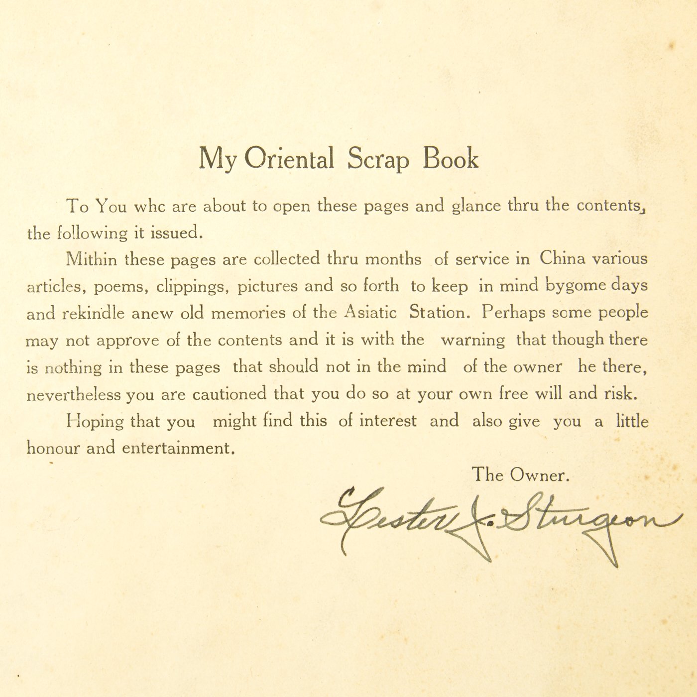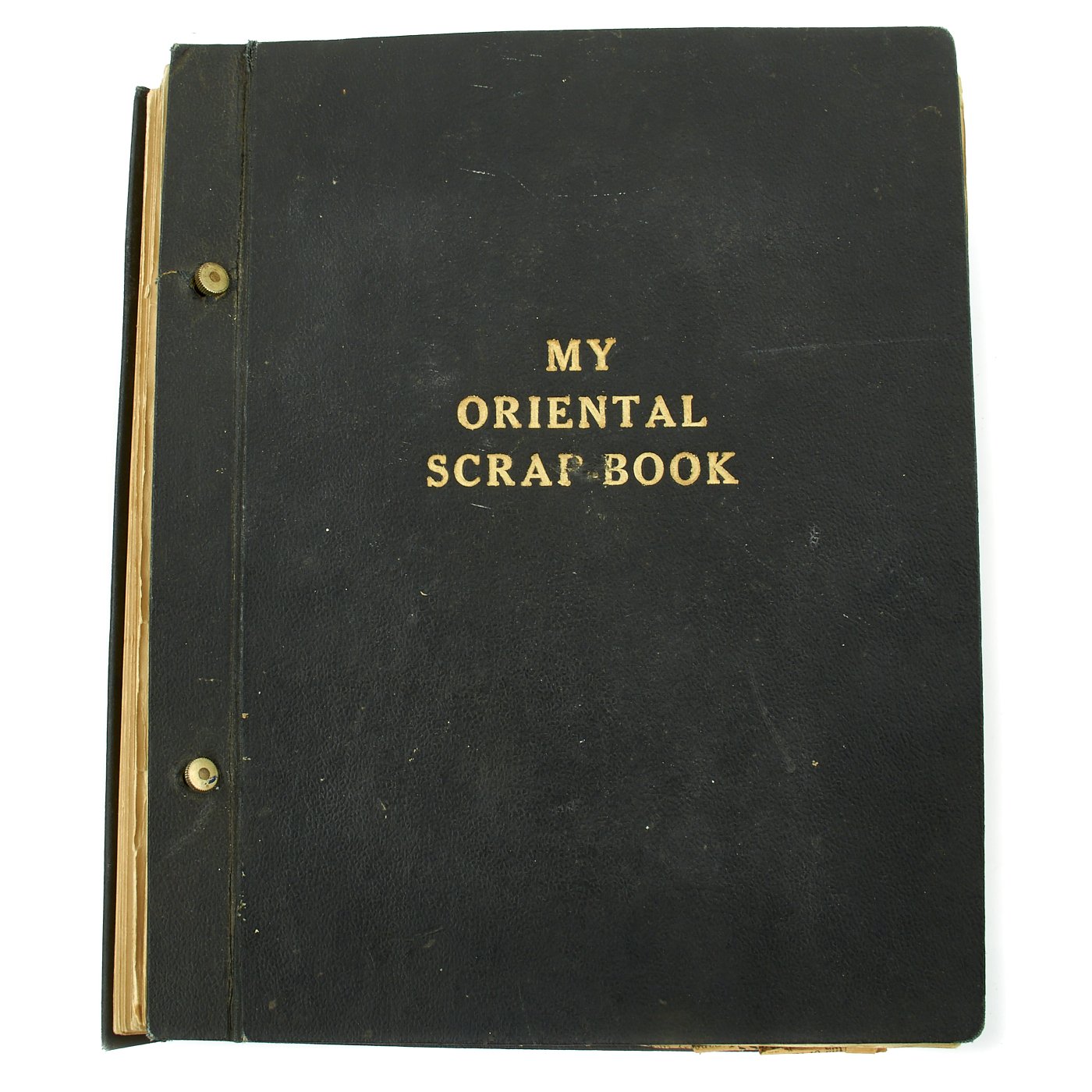 The scrap book cover is titled on the cover MY ORIENTAL SCRAPBOOK. Inside it features newspaper clippings, correspondence, magazine clippings, orders, brochures, currency and so much more.