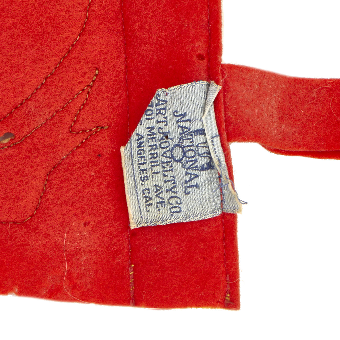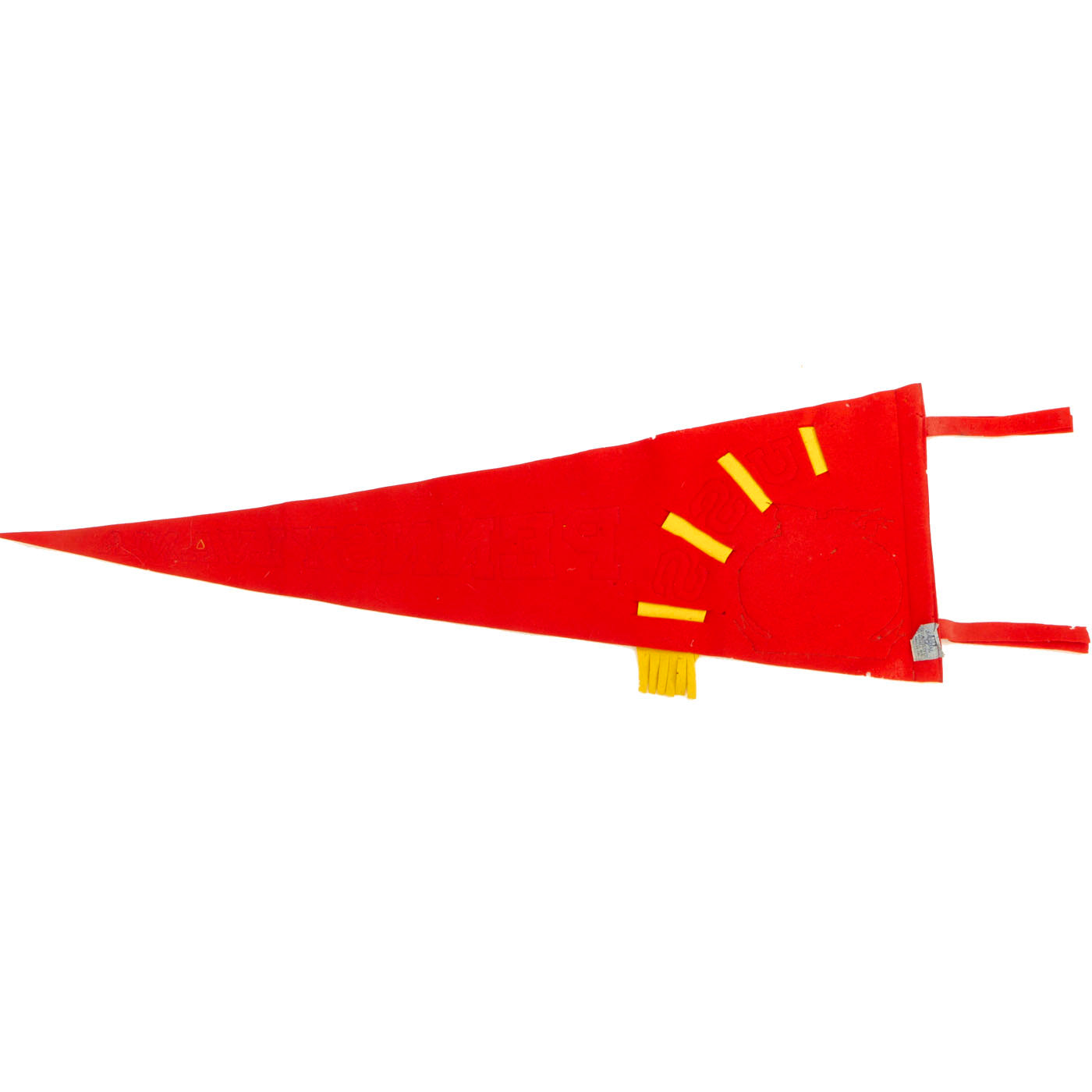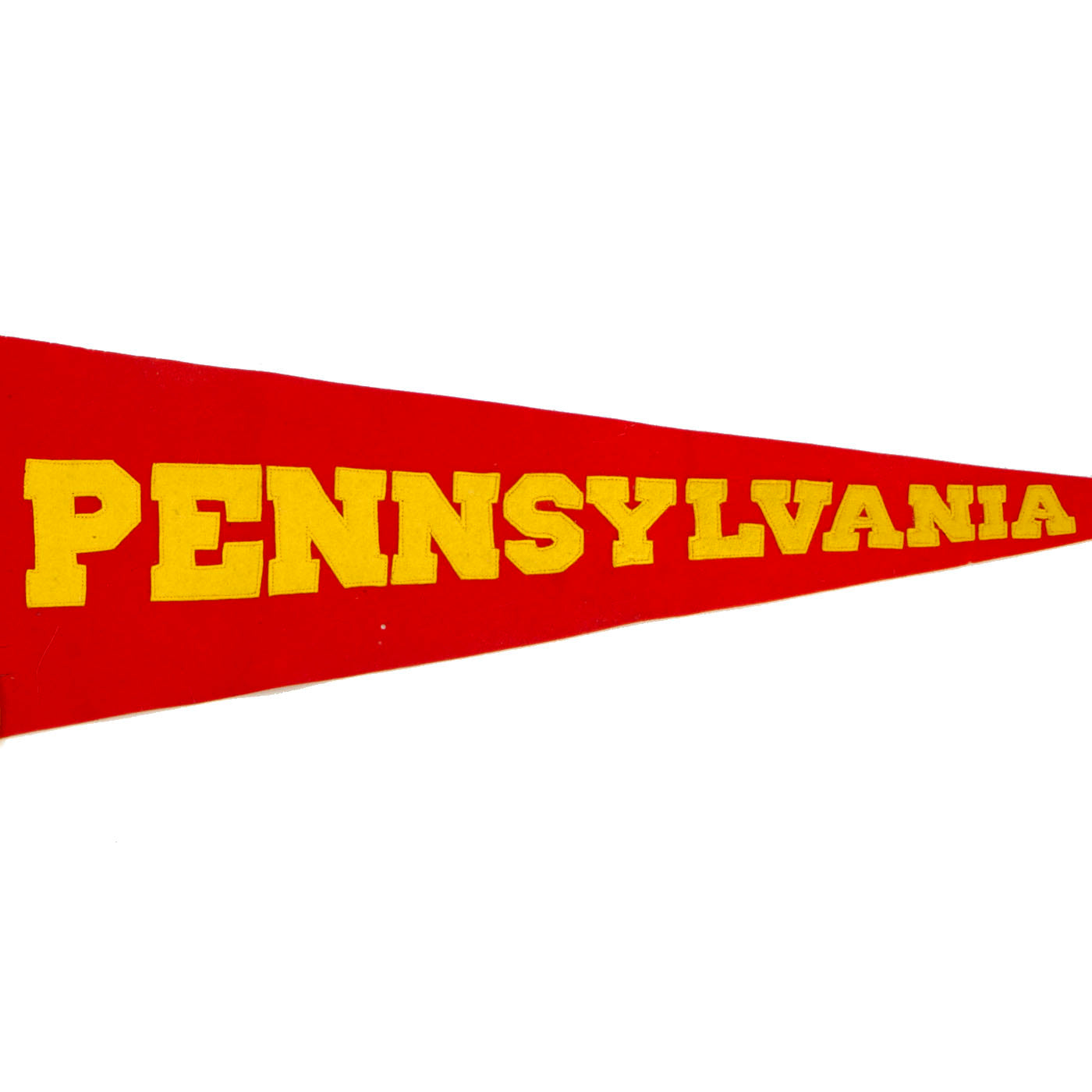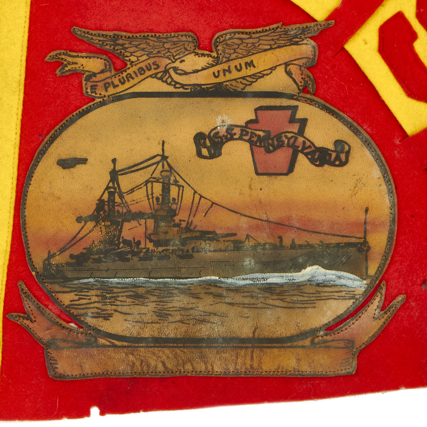 The pennant is of multi-piece construction of red and gold felt and has an image of the USS Pennsylvania inside of a leather piece on the lower left side. In a half circle just to the outside of the leather piece, in gold, are the letters USS with PENNSYLVANIA appearing in gold lettering running the length of the pennant. The condition is excellent for the age with bright colors being retained, there are however, the expected moth nips present on the wool. It measures approximately 35” in length with a width of 11”.