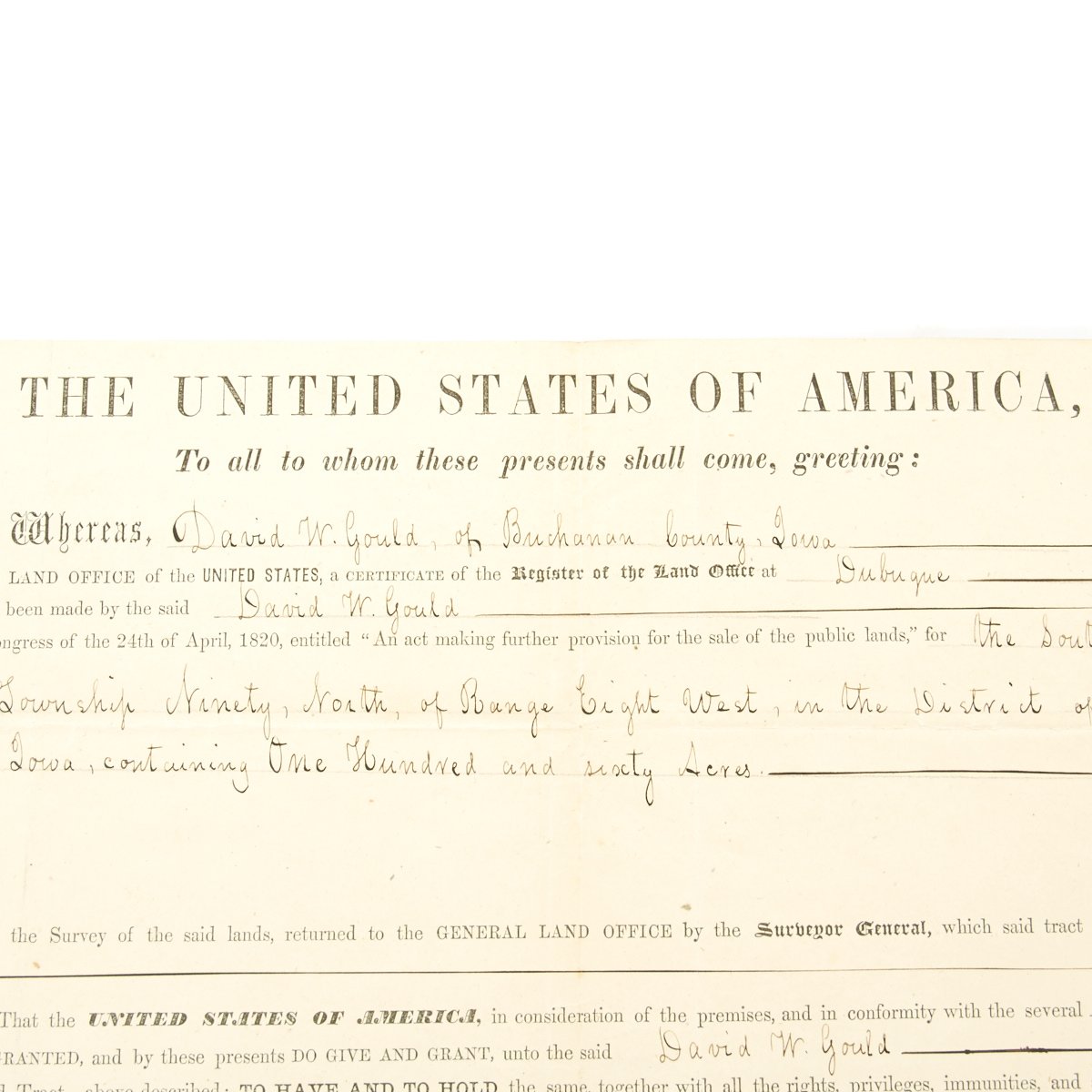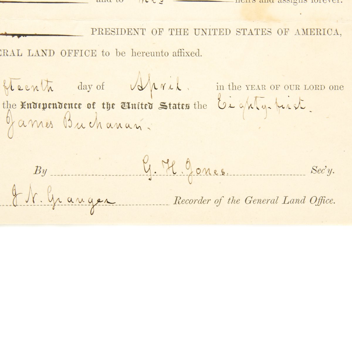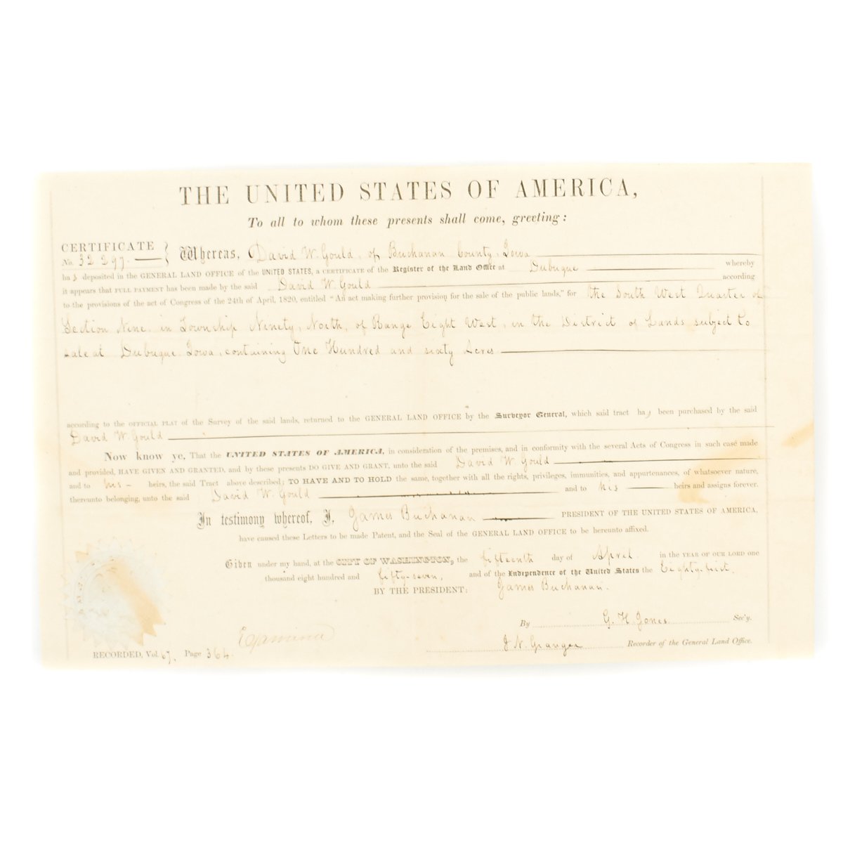 Original item: One of a Kind. Measuring 9 3/4" X 15 1/2" this is the ORIGINAL Certificate printed and then completed by hand, granting this 160 acre Land Grant for the receipt of some undisclosed amount paid to the General Land Office by a DAVID GOULD dated APRIL 15TH. 1857 and signed James Buchanan, which was most likely done by the secretary G.H. Jones or the recorder of the land office, J. A. Granger. The lower left hand corner has a raised U.S. Land Office seal on it.