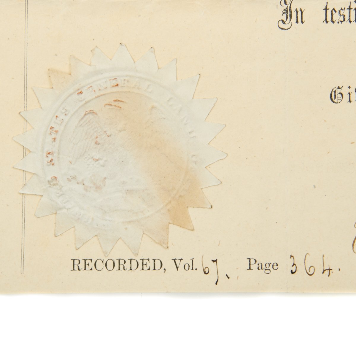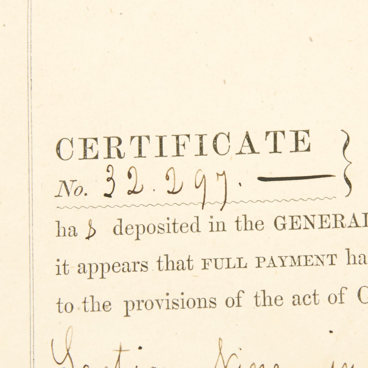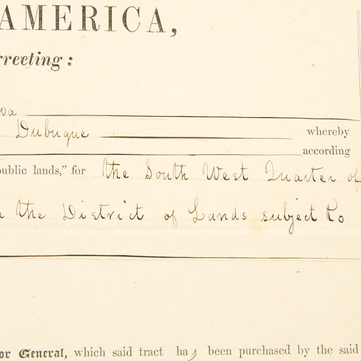 Original item: One of a Kind. Measuring 9 3/4" X 15 1/2" this is the ORIGINAL Certificate printed and then completed by hand, granting this 160 acre Land Grant for the receipt of some undisclosed amount paid to the General Land Office by a DAVID GOULD dated APRIL 15TH. 1857 and signed James Buchanan, which was most likely done by the secretary G.H. Jones or the recorder of the land office, J. A. Granger. The lower left hand corner has a raised U.S. Land Office seal on it.