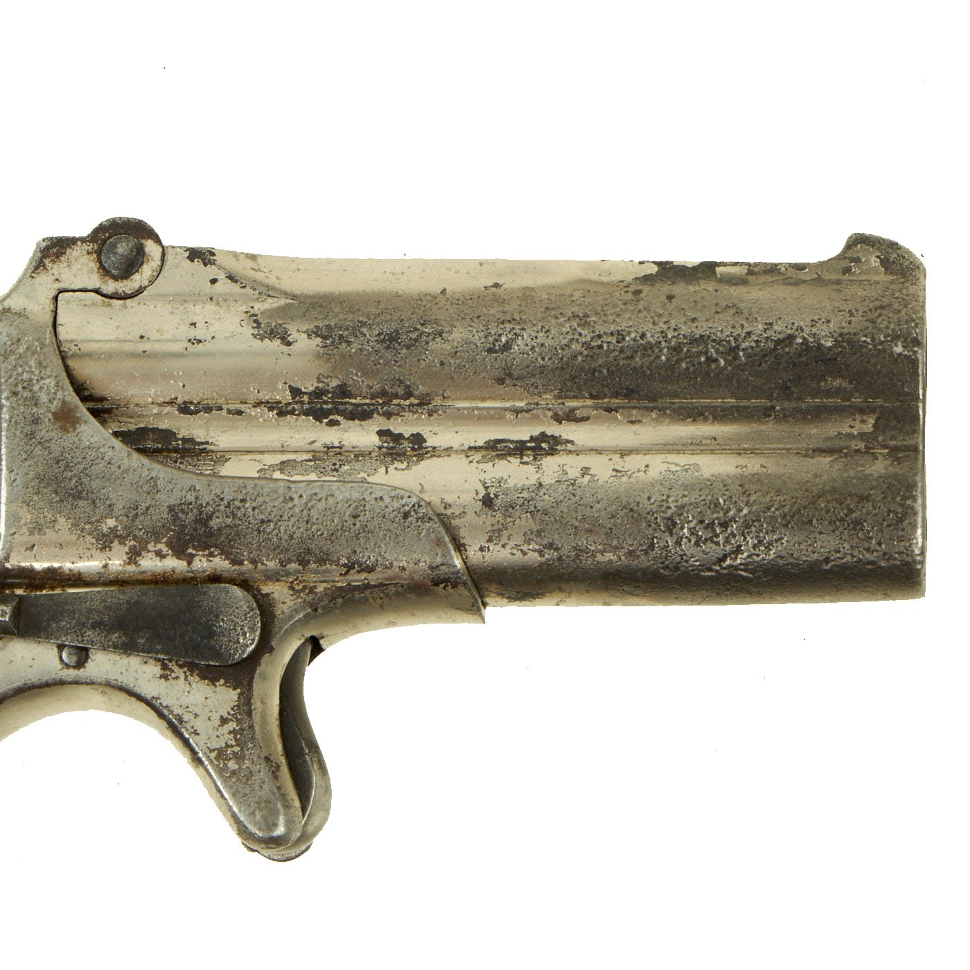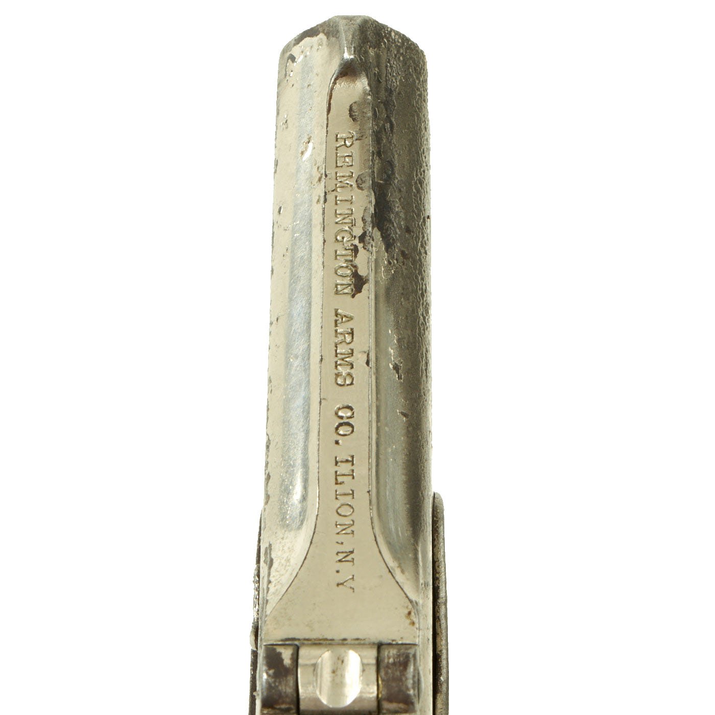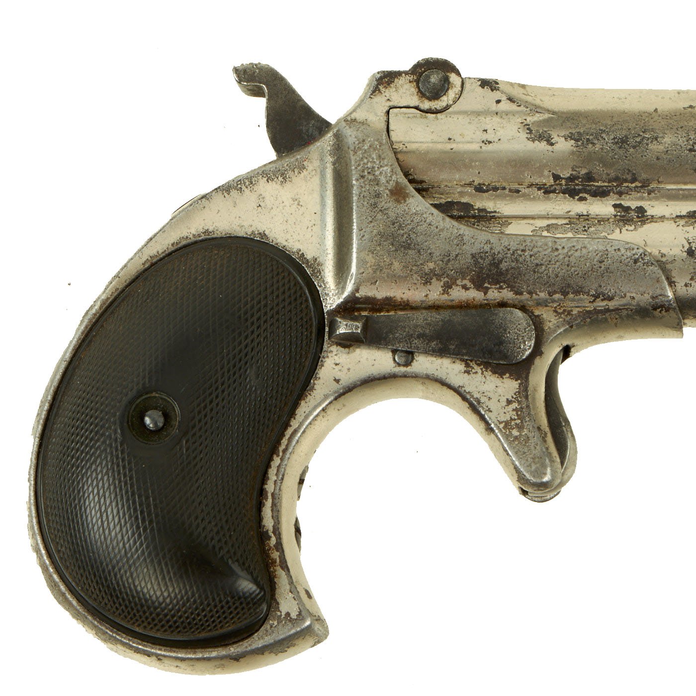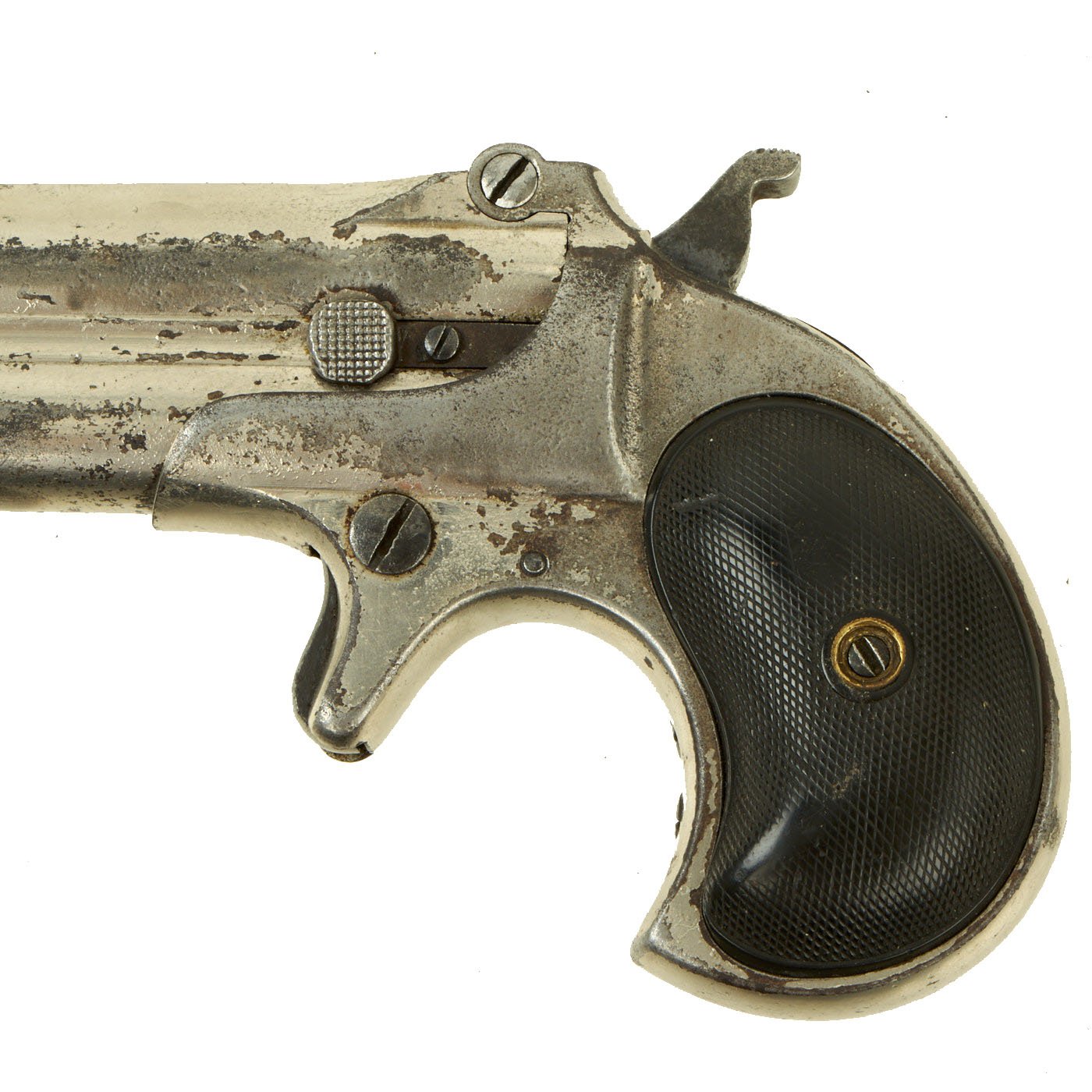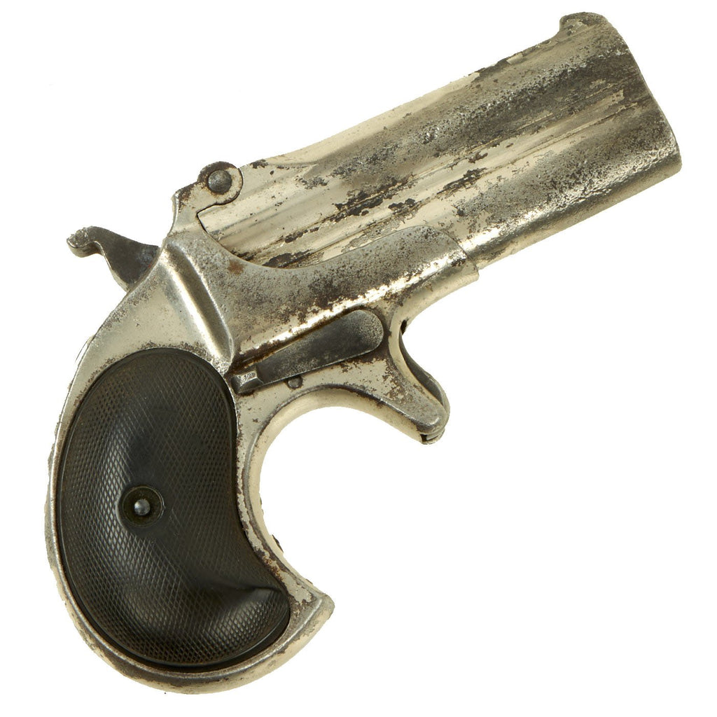 Original Item: Only One Available. Originally patented in 1858, these became very popular on the River Boats of the great Mississippi river in the 1870's. They were often used by gamblers and others who would require protection on the often dark decks. Fully nickel plated of which almost all remains, having just a 3" barrel and 4 3/4” overall, this was ideal for a waistcoat pocket. The barrel top strap is marked with the Remington Address: