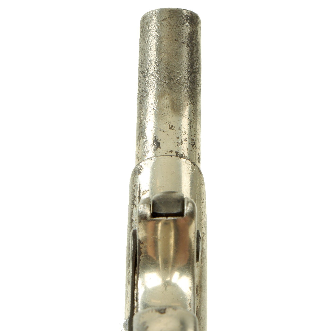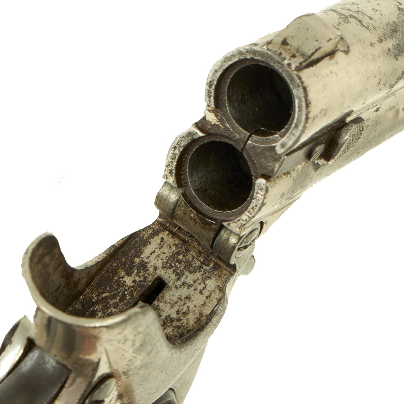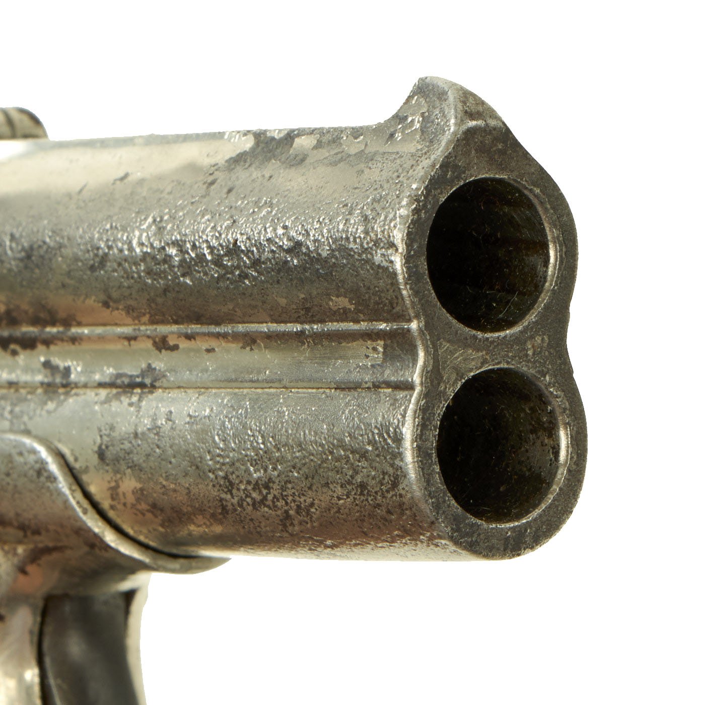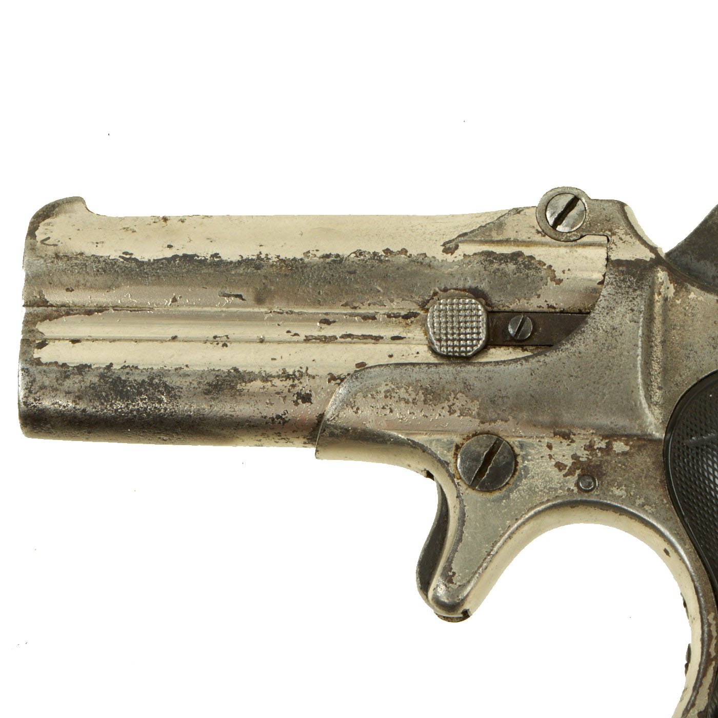 Original Item: Only One Available. Originally patented in 1858, these became very popular on the River Boats of the great Mississippi river in the 1870's. They were often used by gamblers and others who would require protection on the often dark decks. Fully nickel plated of which almost all remains, having just a 3" barrel and 4 3/4” overall, this was ideal for a waistcoat pocket. The barrel top strap is marked with the Remington Address: