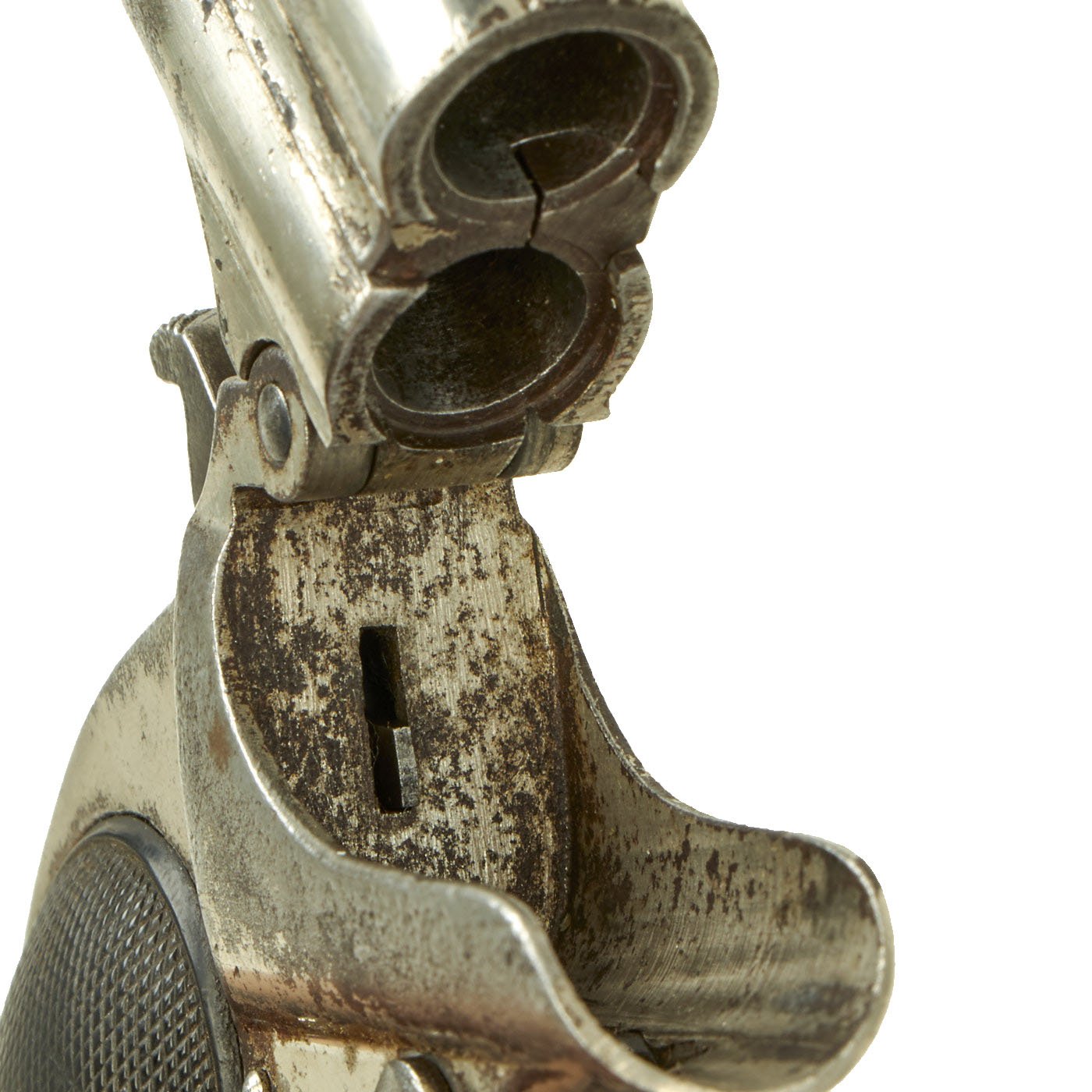 The pistol features lovely black hard Rubber or "Gutta Percha" grips, fully checkered and in very good lightly worn condition. It was originally fully nickel plated, though unfortunately over time the plating degraded, and now it is probably 40-50% intact, with the rest showing a lightly pitted patina.