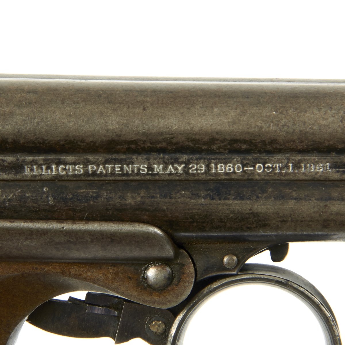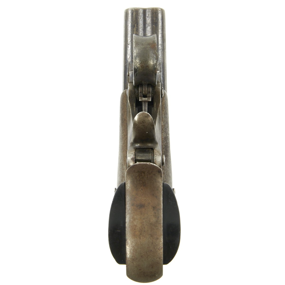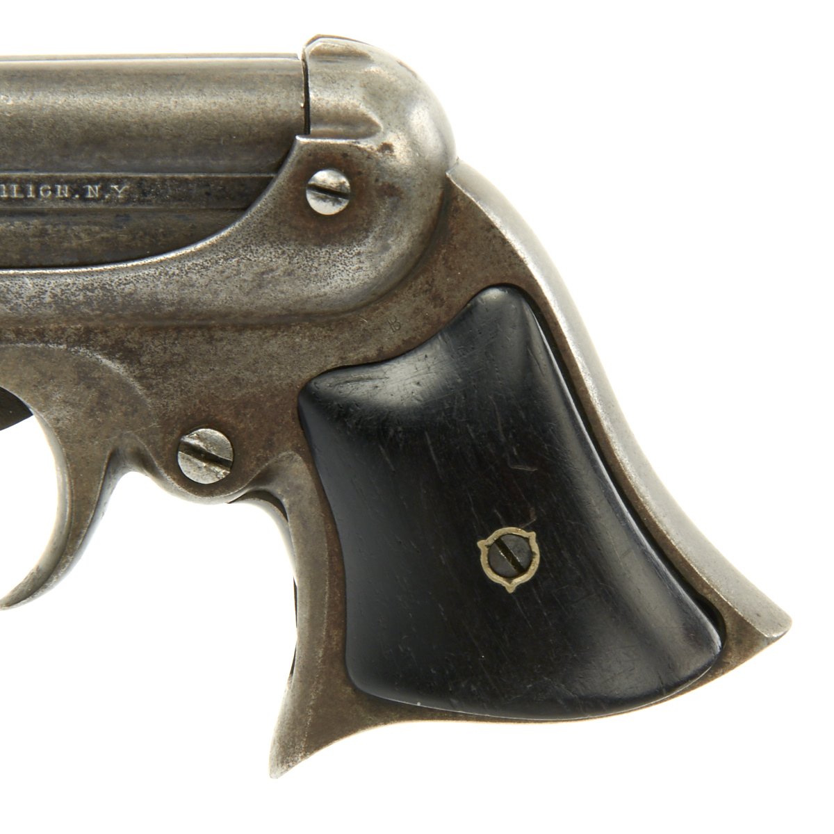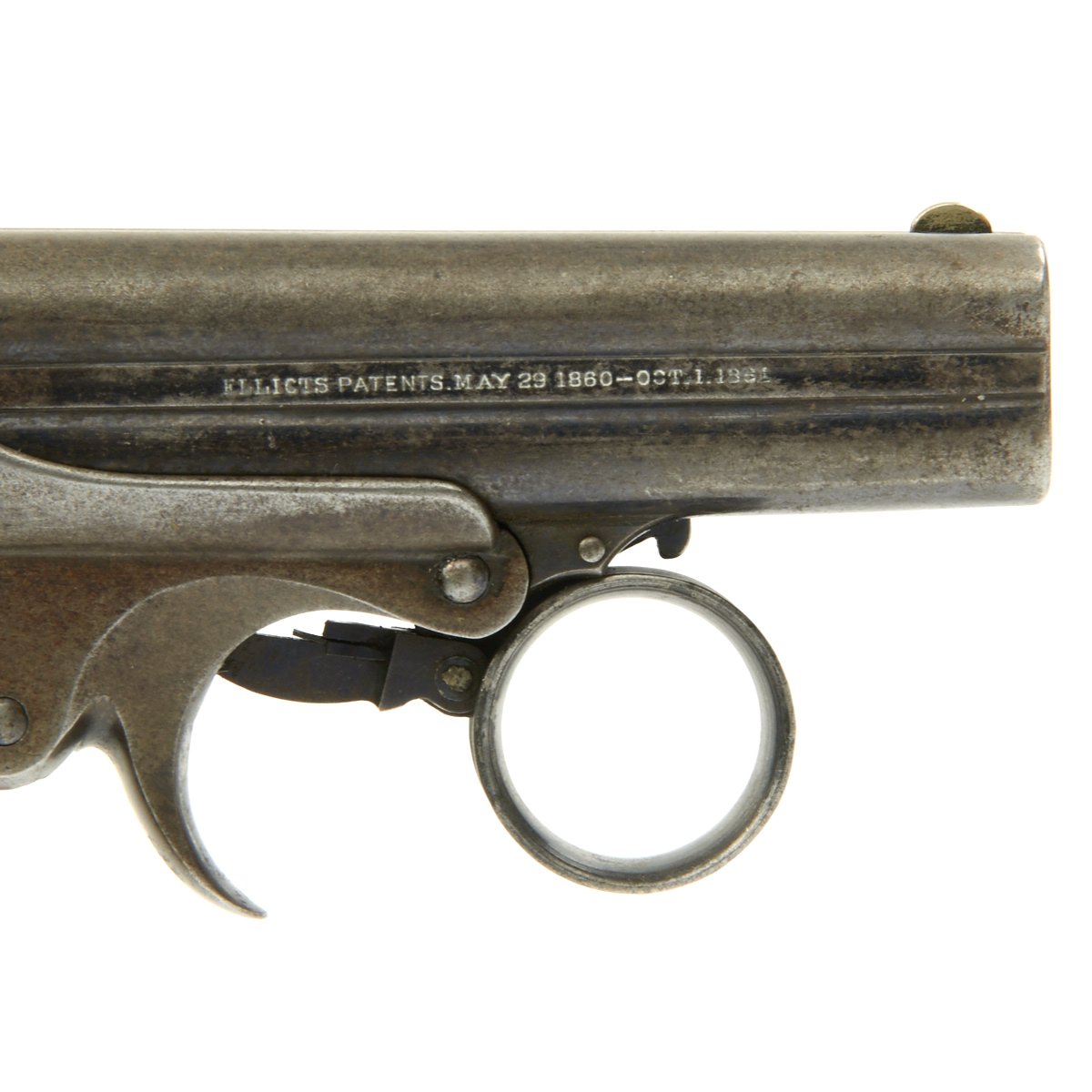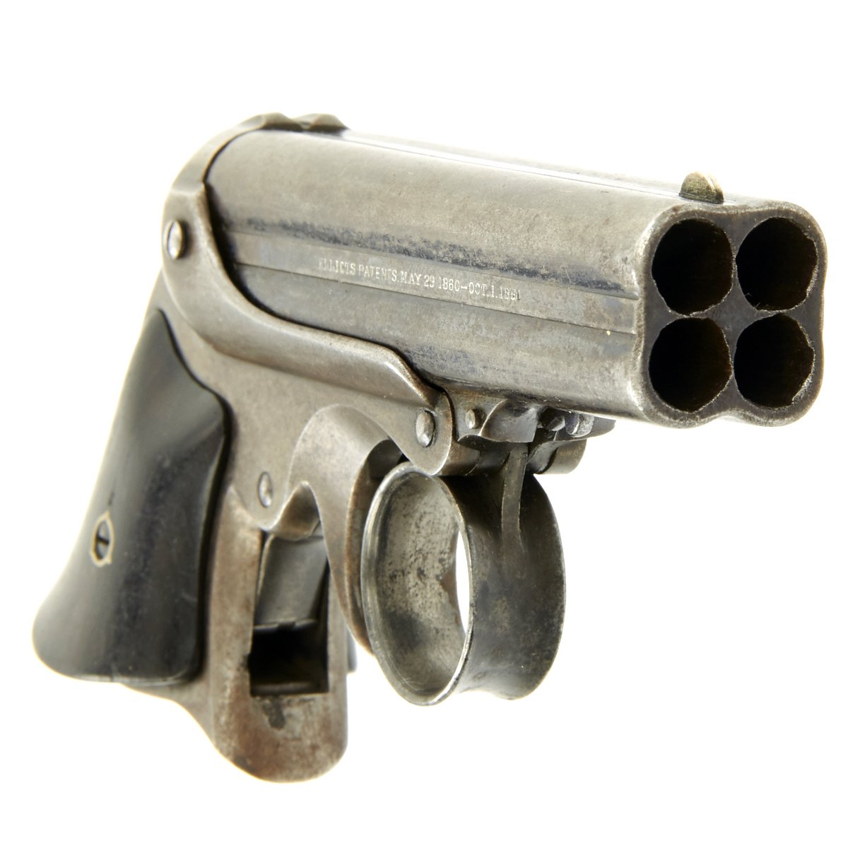 Original Item: Only One Available. This is a fascinating small handgun, intended for personal protection that started production right at the height of the Civil War in 1863. Ideal for Gamblers and Travelers alike, this was easily concealed had a capacity of four shots that could be easily discharged by way of a Ring Trigger. Black wood ebony type grip plates the metal finish now turning blue/grey, all in all in very nice condition.