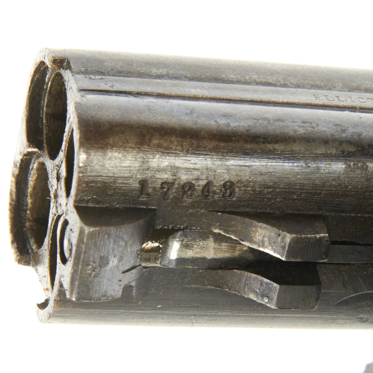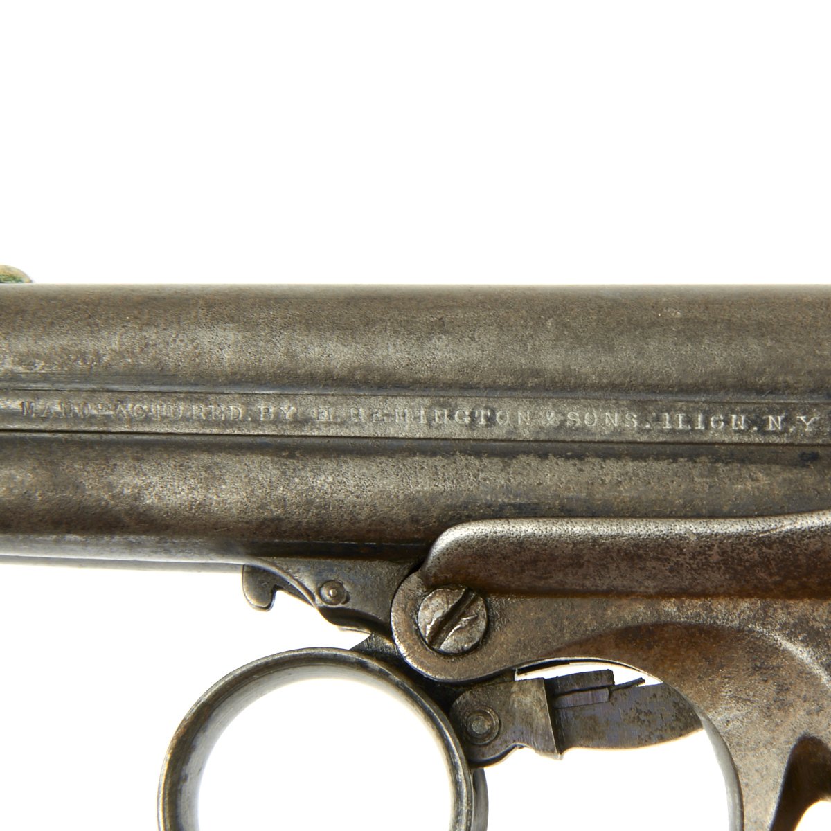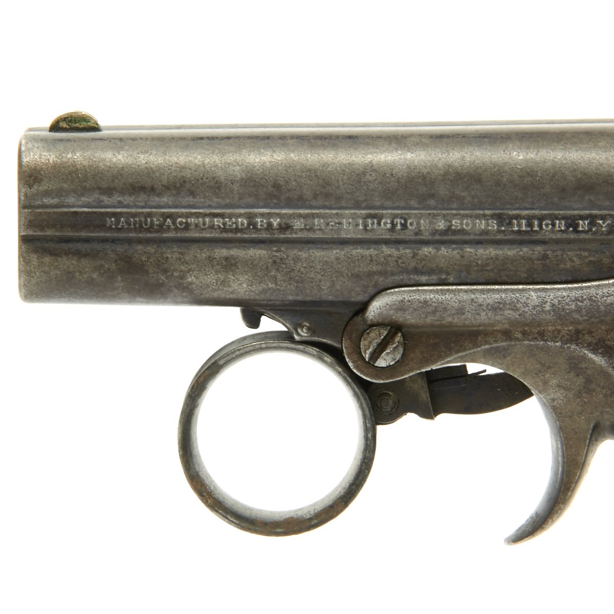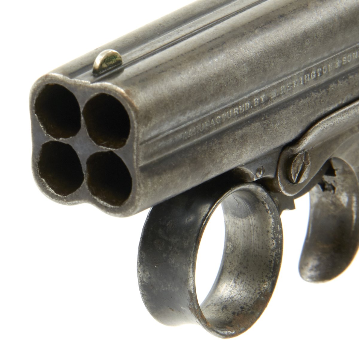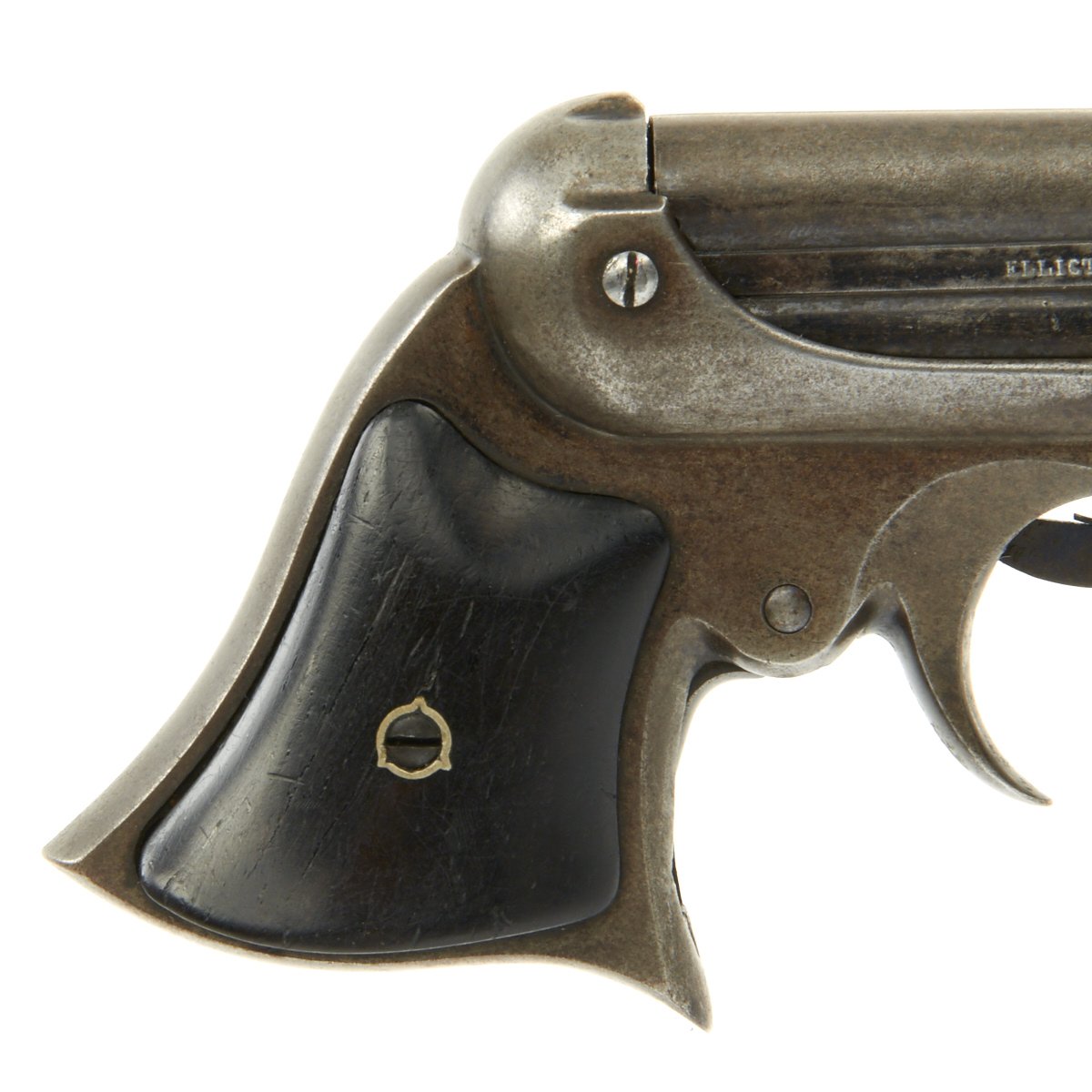 Original Item: Only One Available. This is a fascinating small handgun, intended for personal protection that started production right at the height of the Civil War in 1863. Ideal for Gamblers and Travelers alike, this was easily concealed had a capacity of four shots that could be easily discharged by way of a Ring Trigger. Black wood ebony type grip plates the metal finish now turning blue/grey, all in all in very nice condition.