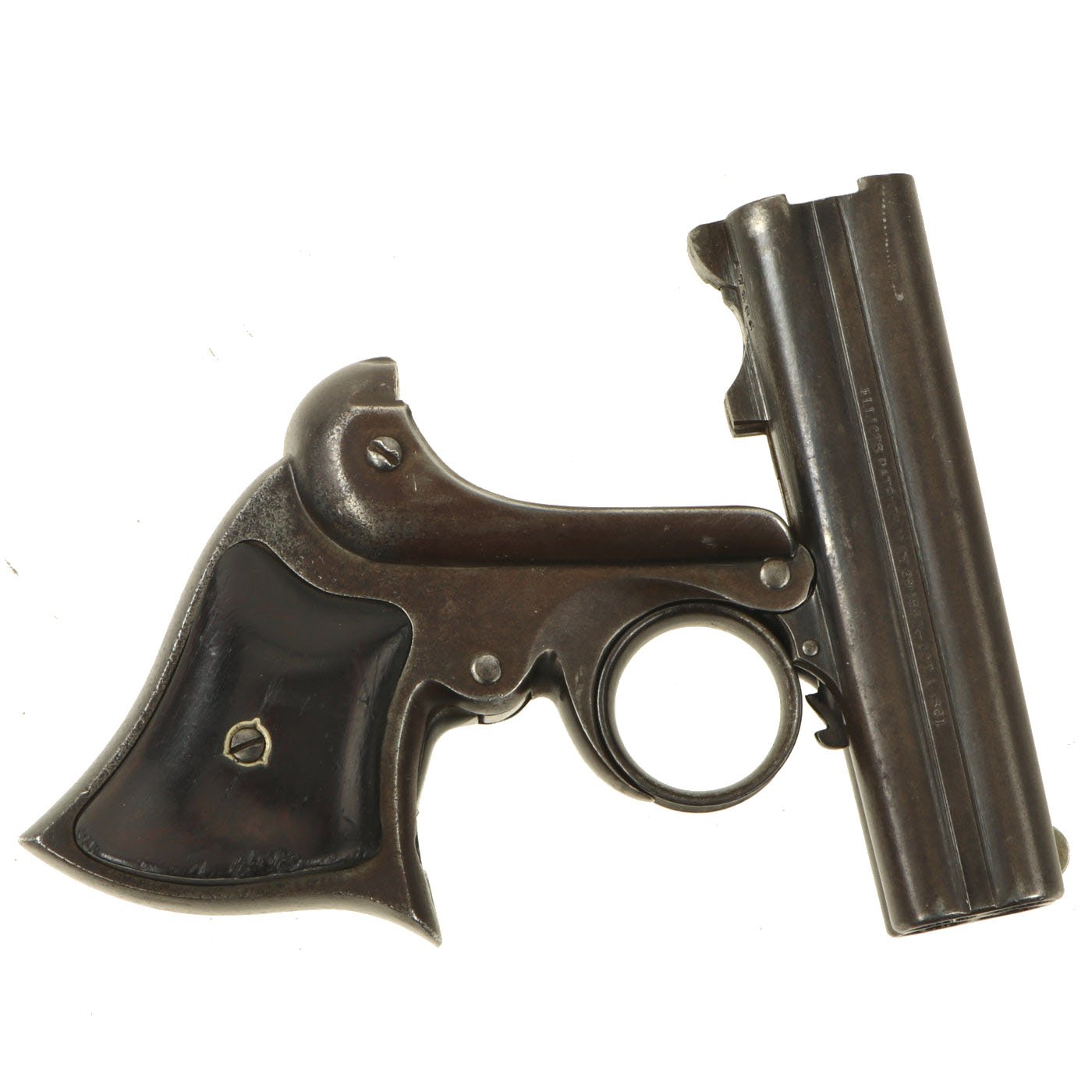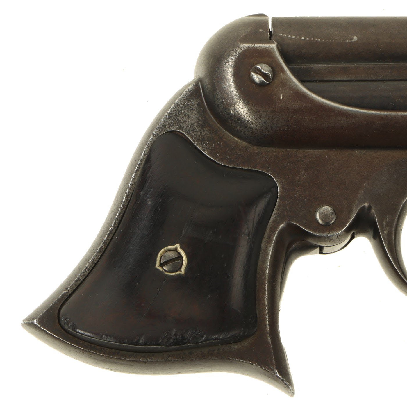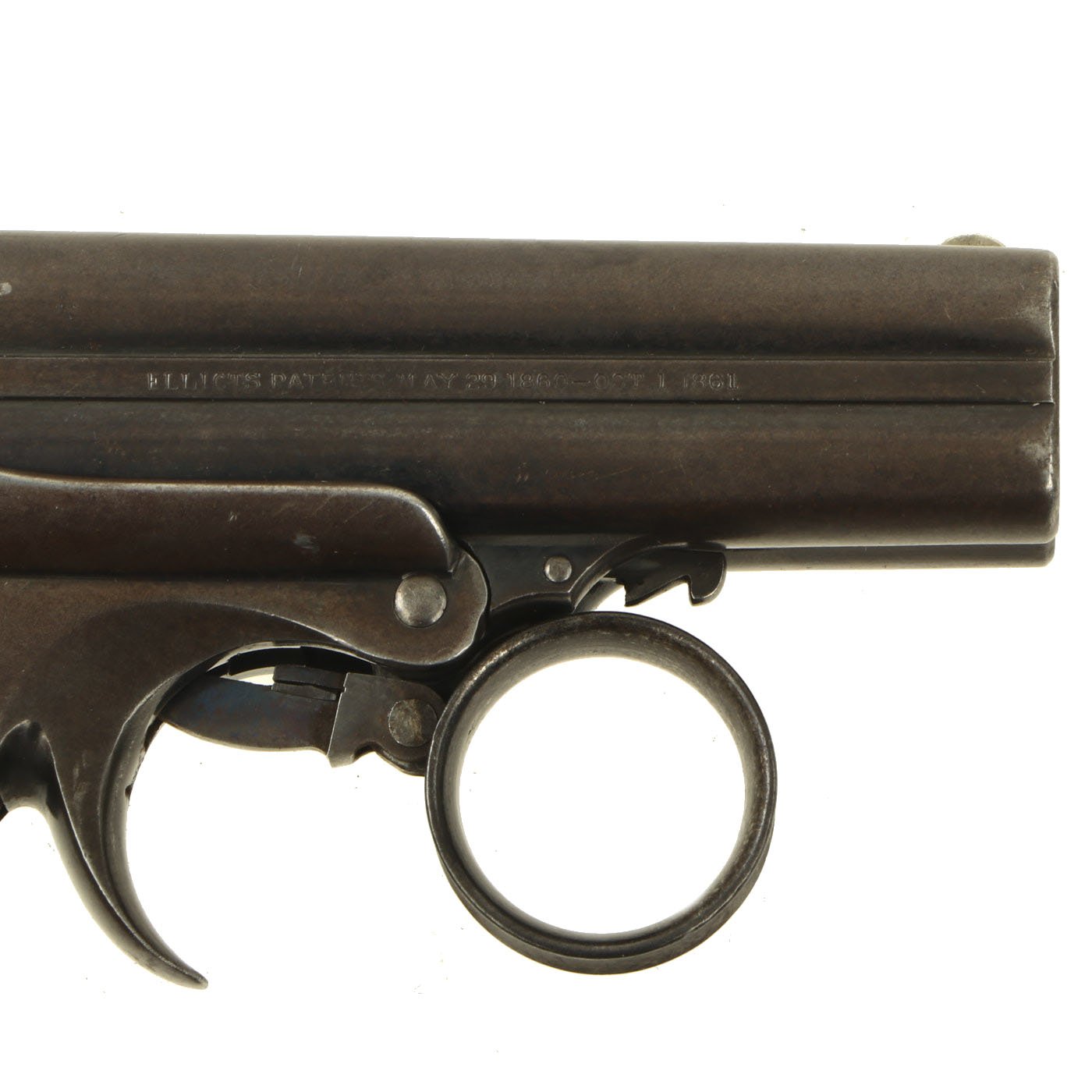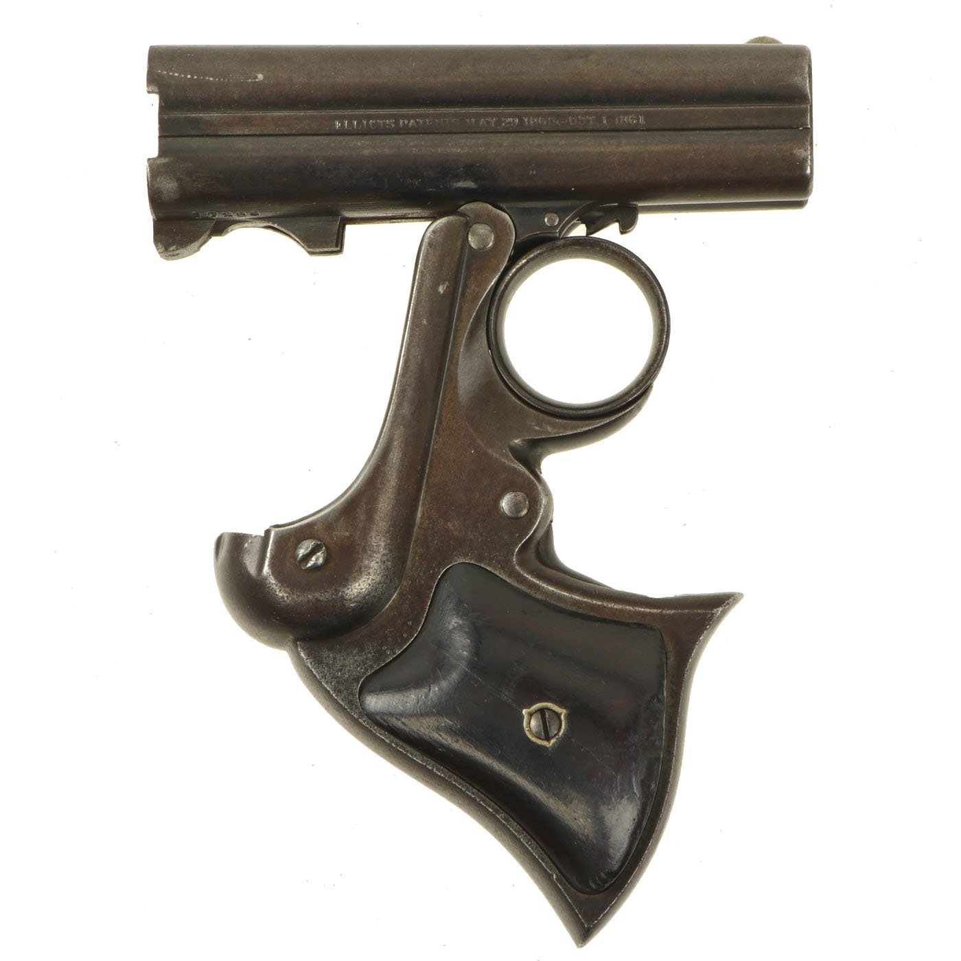 Original Item: Only One Available. This is a fascinating small handgun, intended for personal protection that started production right at the height of the Civil War in 1863. Ideal for Gamblers and Travelers alike, this was easily concealed had a capacity of four shots that could be easily discharged by way of a Ring Trigger. The pistol features black wood ebony type grip plates, with the the metal finish now turning blue/grey, all in all in very nice condition.