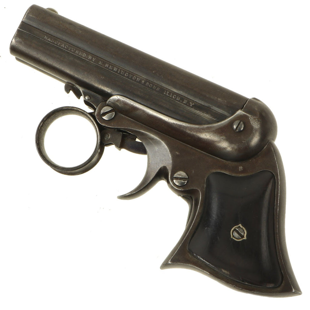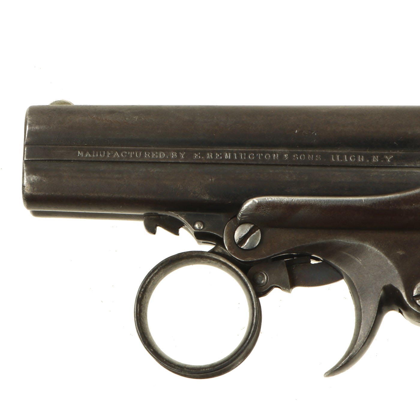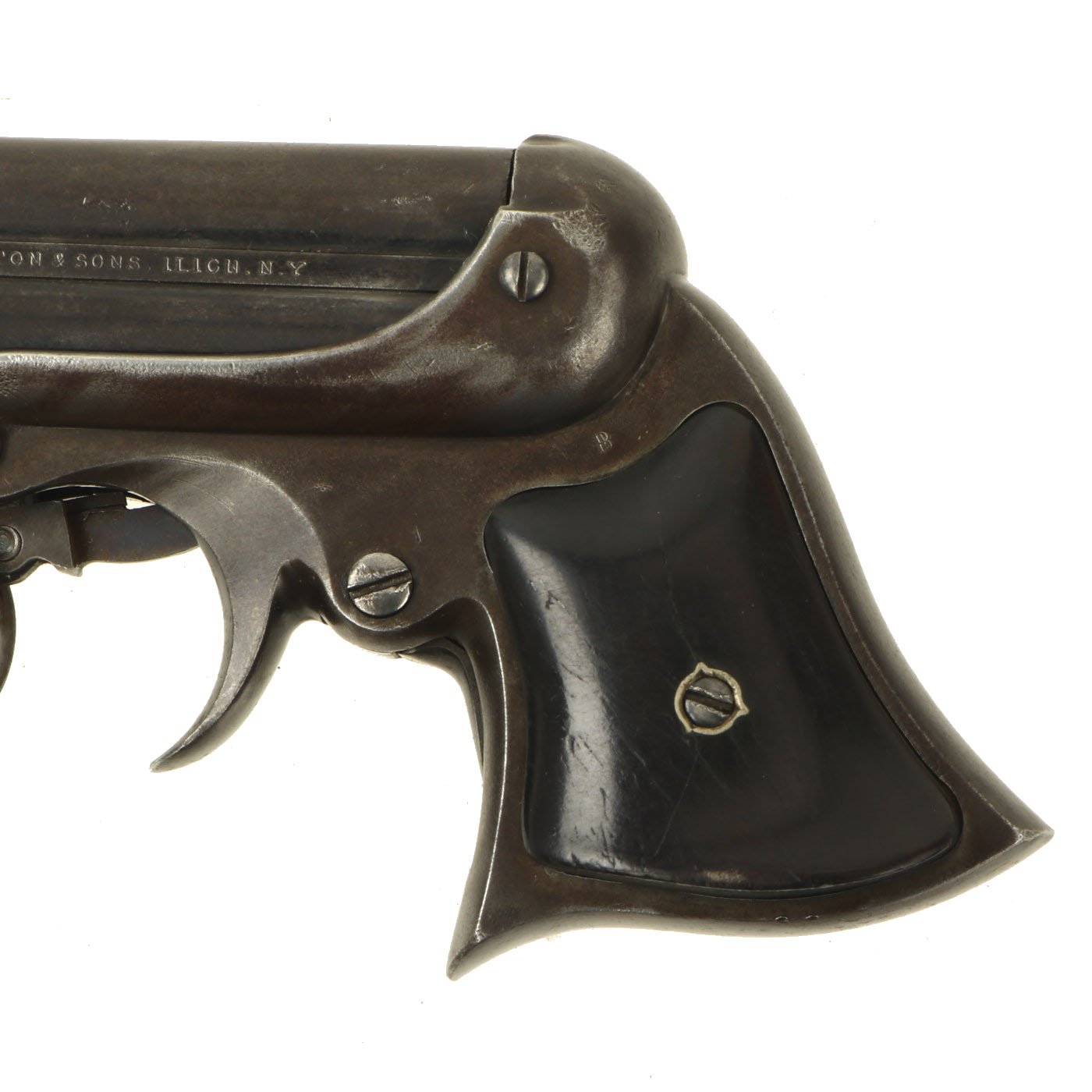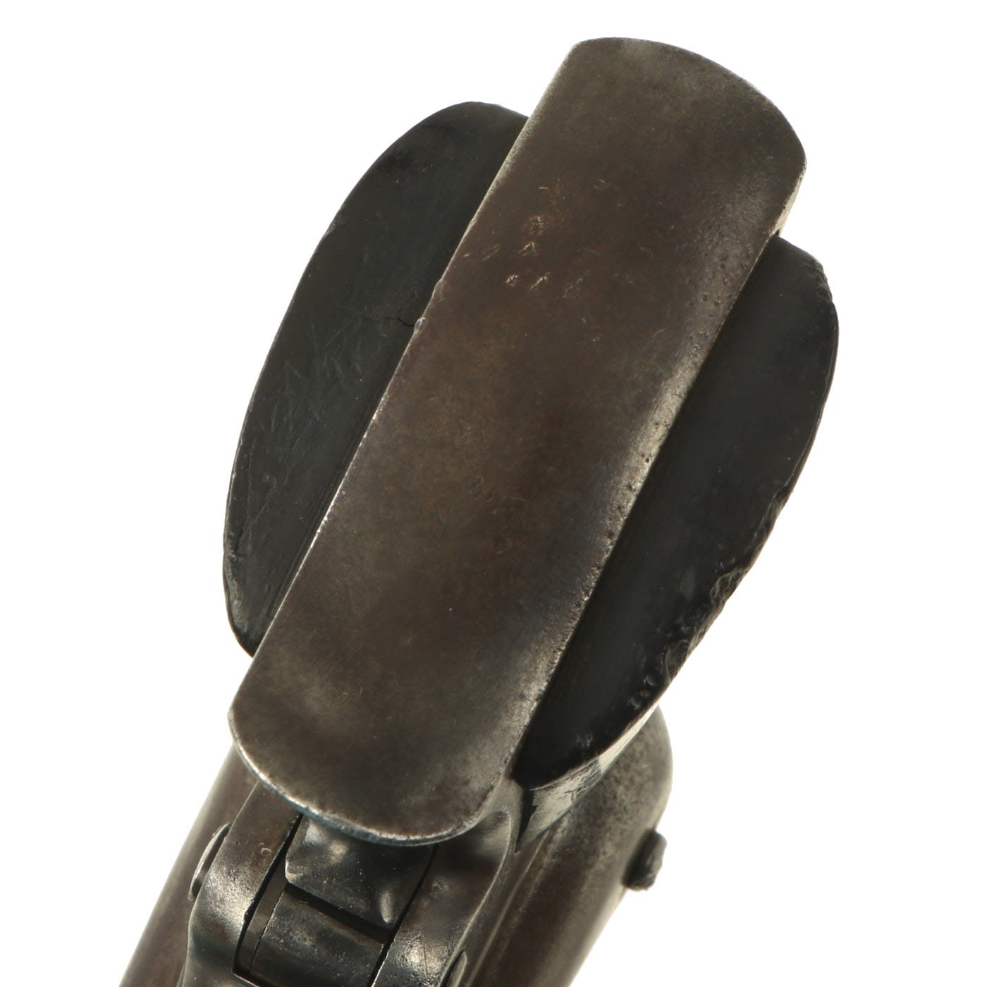 Original Item: Only One Available. This is a fascinating small handgun, intended for personal protection that started production right at the height of the Civil War in 1863. Ideal for Gamblers and Travelers alike, this was easily concealed had a capacity of four shots that could be easily discharged by way of a Ring Trigger. The pistol features black wood ebony type grip plates, with the the metal finish now turning blue/grey, all in all in very nice condition.