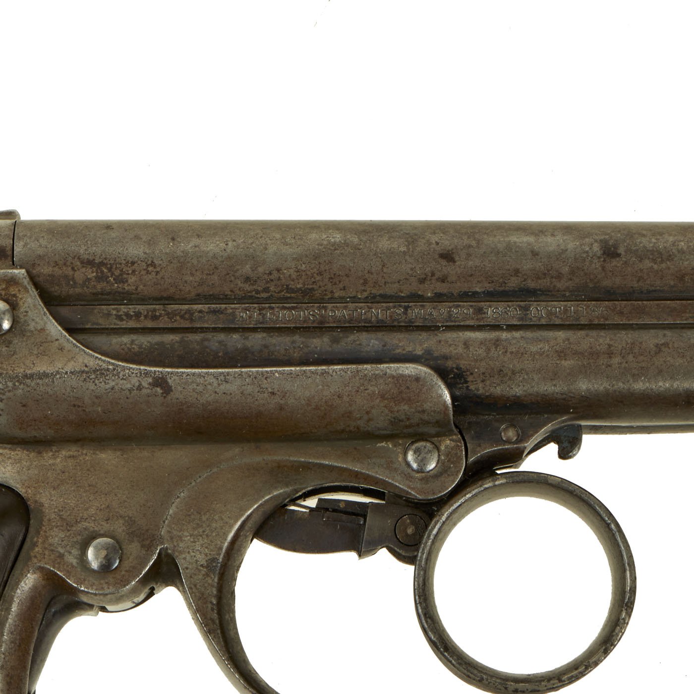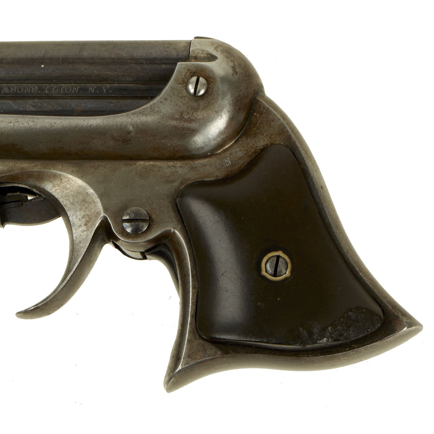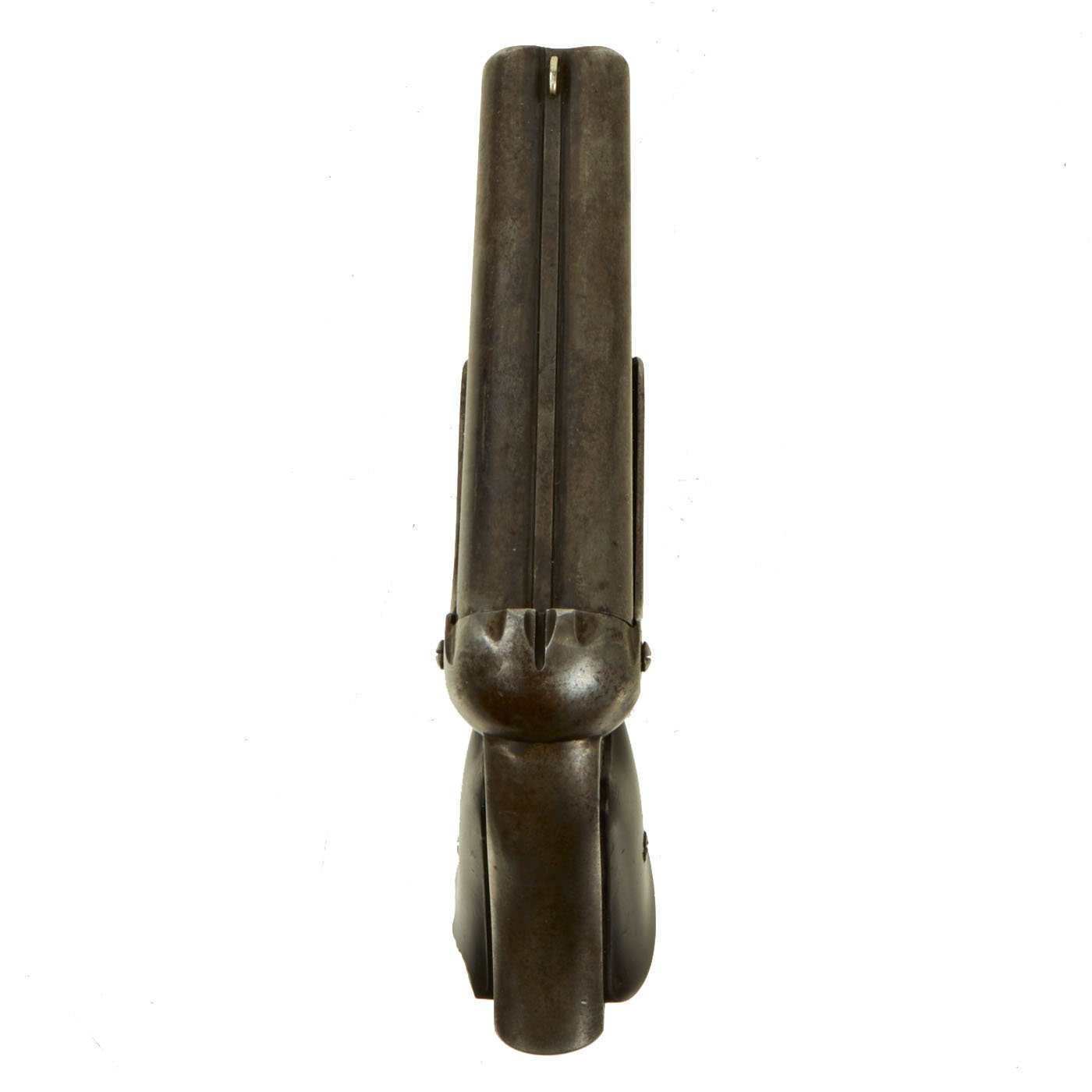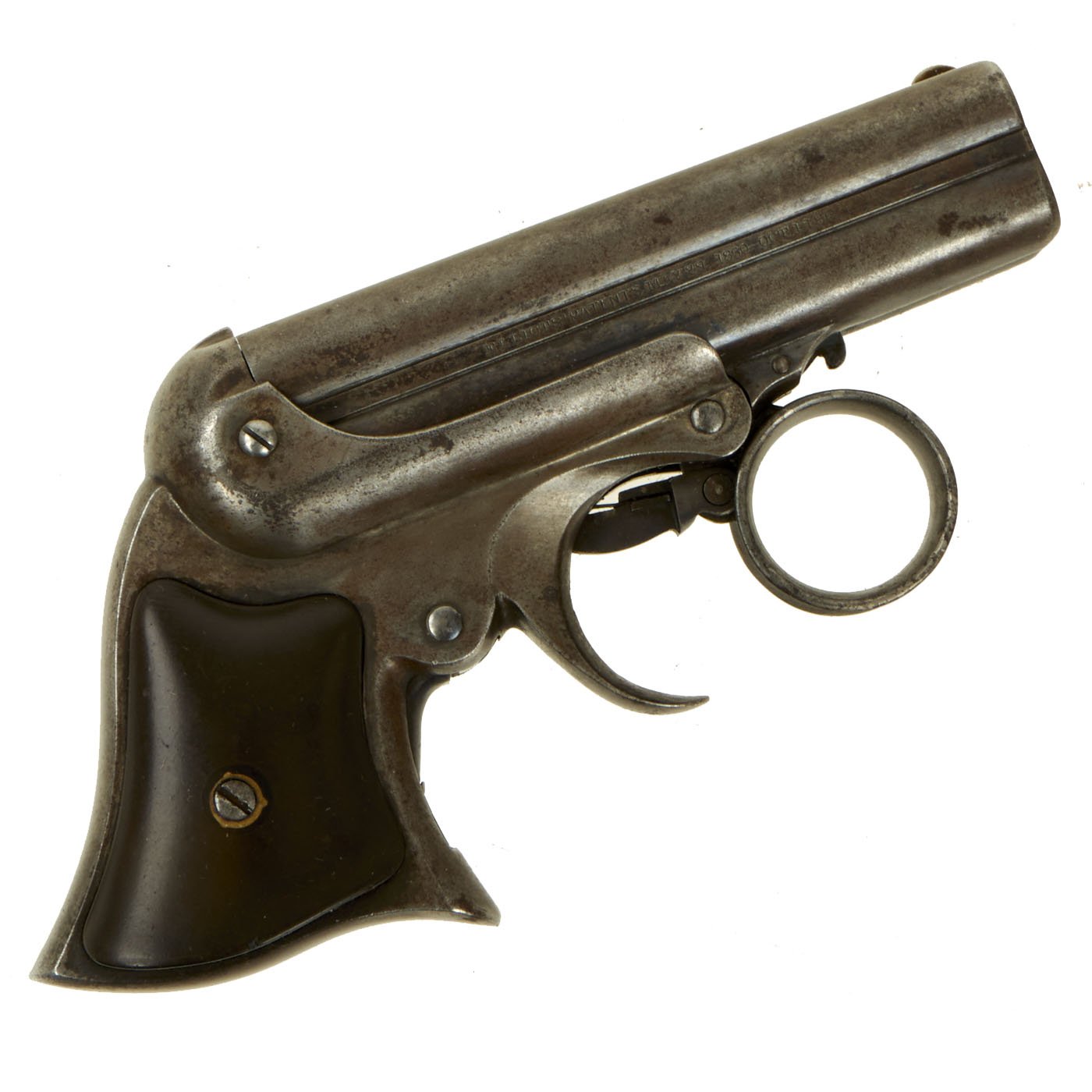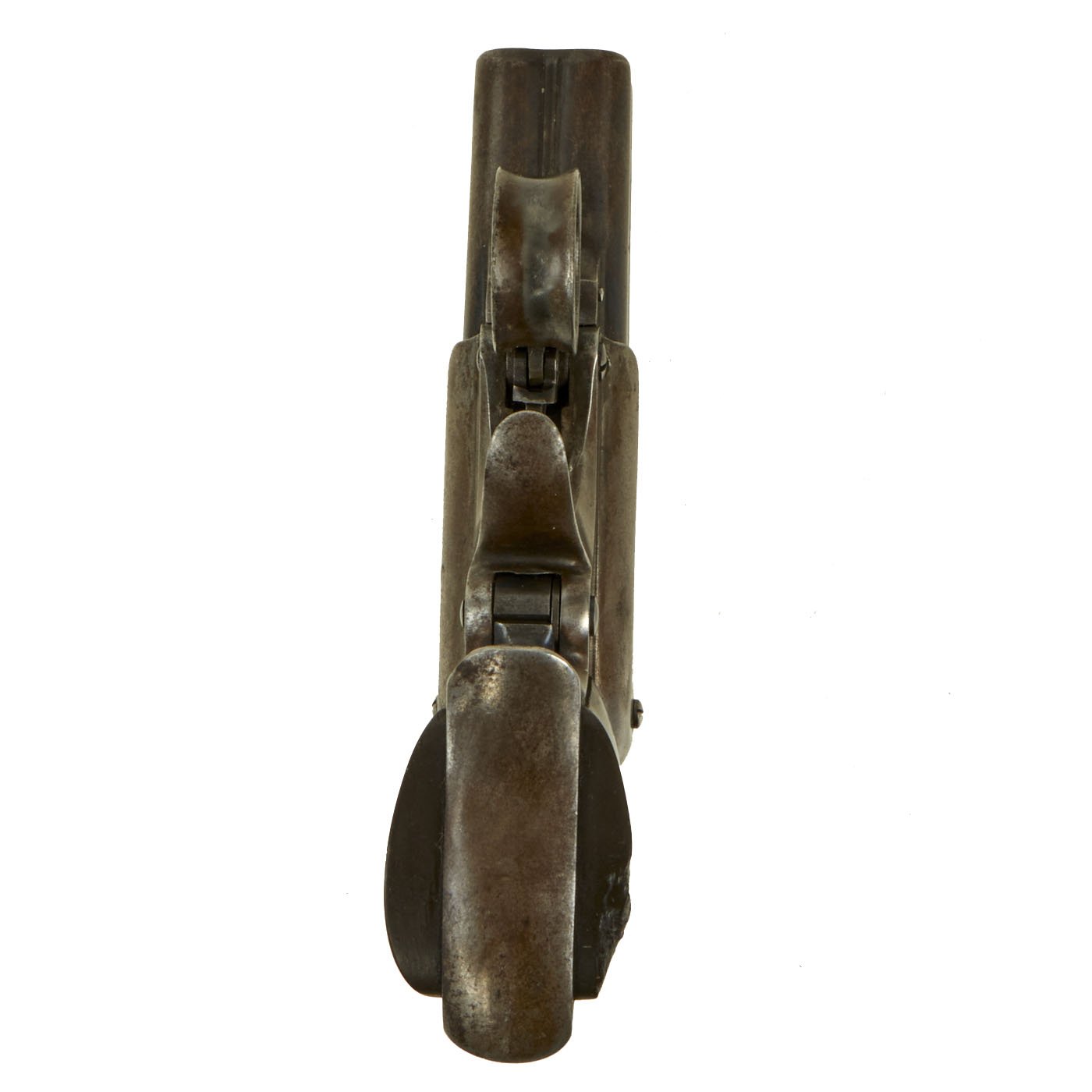 Original Item: Only One Available. This is a fascinating small handgun, intended for personal protection that started production right at the height of the Civil War in 1863. Ideal for Gamblers and Travelers alike, this was easily concealed had a capacity of four shots that could be easily discharged by way of a Ring Trigger. The pistol features black wood ebony type grip plates, with the the metal finish now turning blue/grey, all in all in very nice condition.