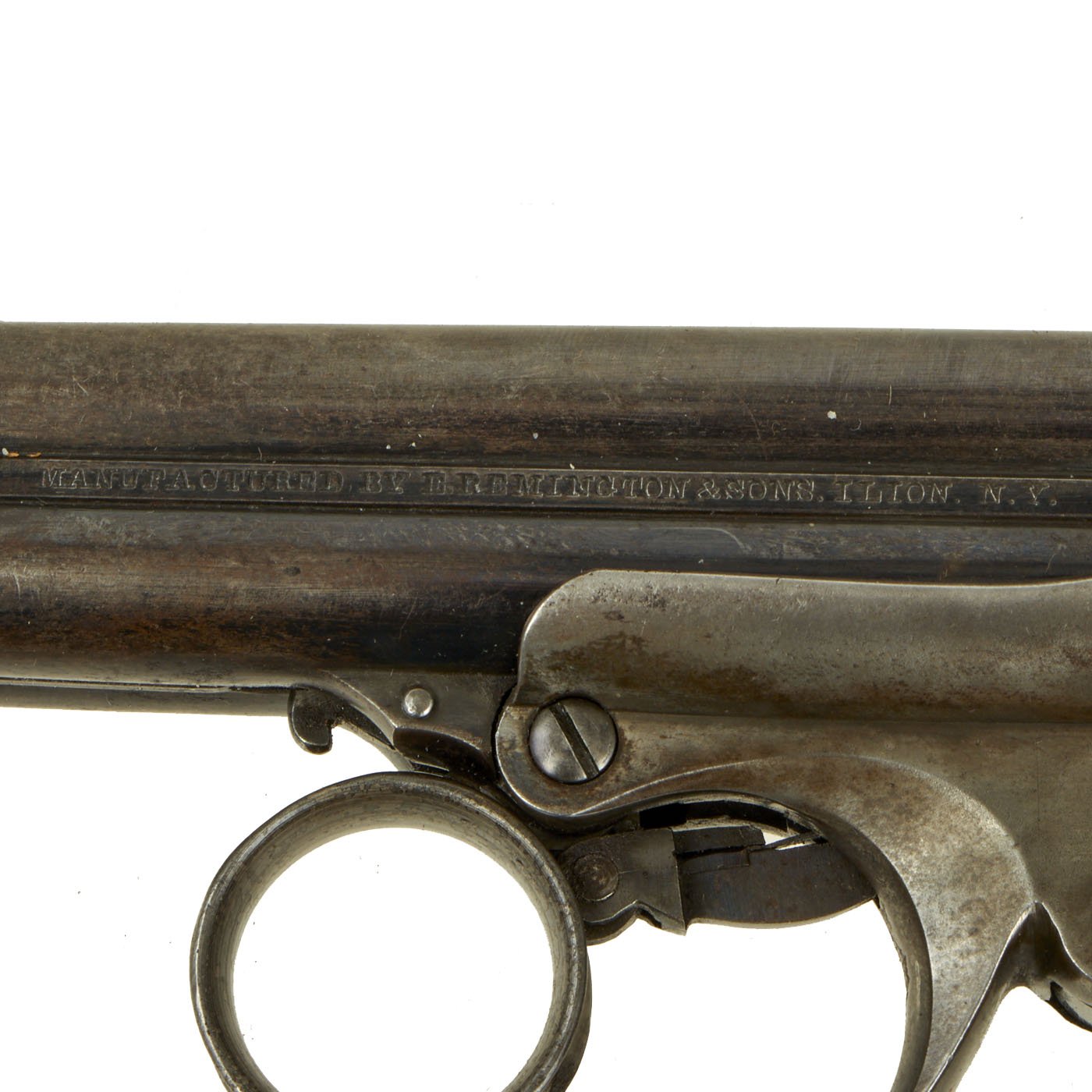 The pistol is well marked, with serial number 6358 marked on the bottom of the barrel and on the frame inside the breech. The full Remington name and address down one side of the barrel cluster: