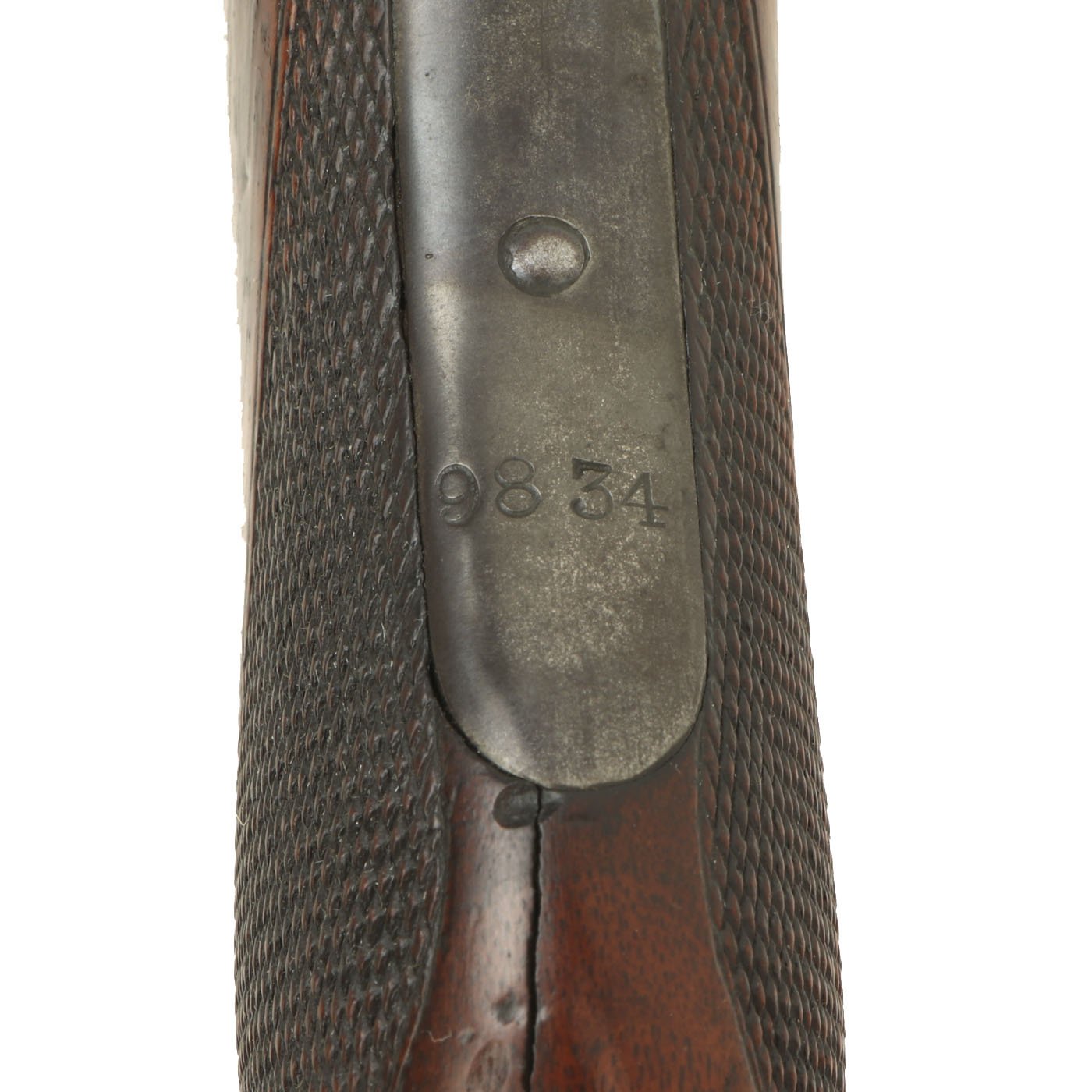The stocks are in very good condition, with a lovely glow from years of polishing. THe fore stock has some scratches and dents, but no chips or major wear, and also has a nice inlaid ebony V shaped insert at the front. The butt stock has a very nice checkered pistol grip, and also shows light wear. There is some cracking near the receiver tang on the left side, and the bottom of the pistol grip also has a crack through it, which stops where it rejoins the butt stock.