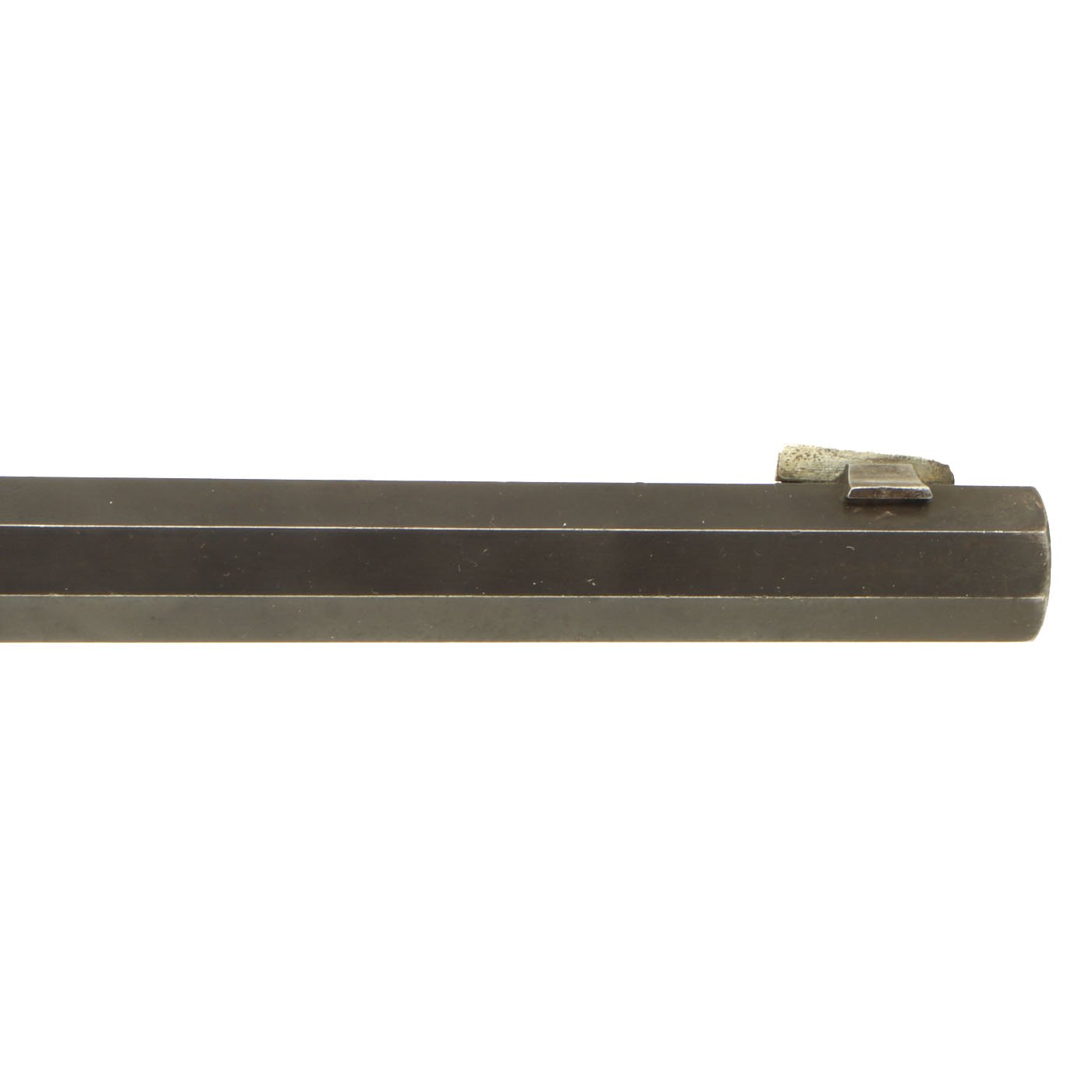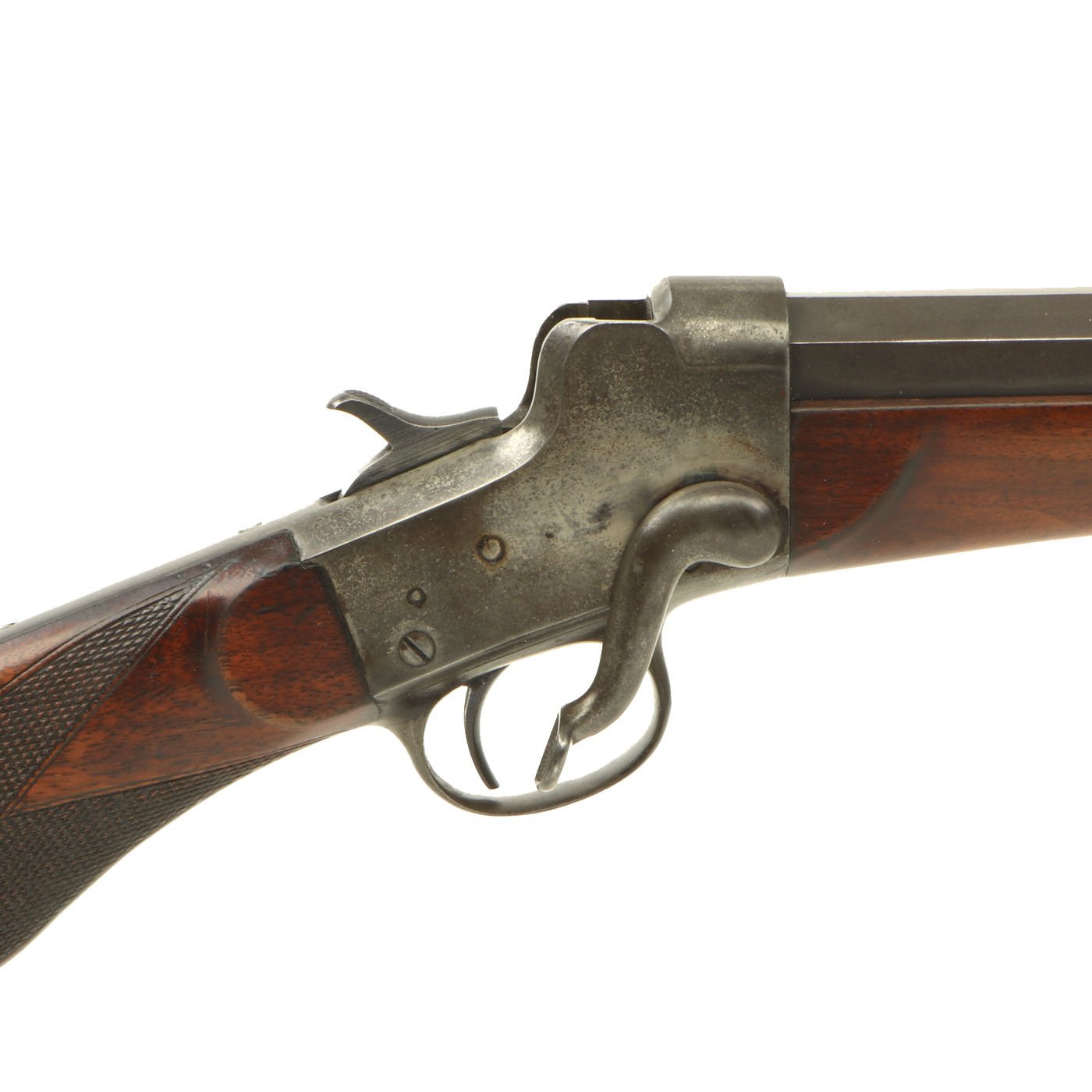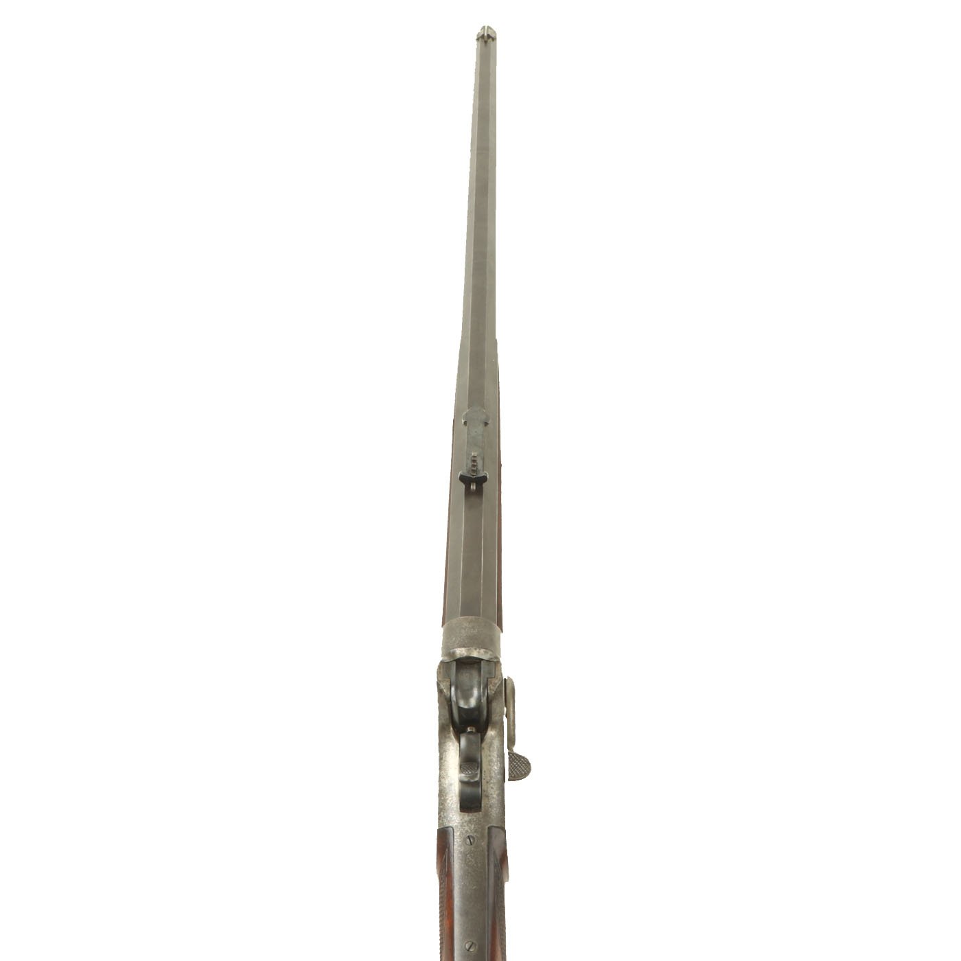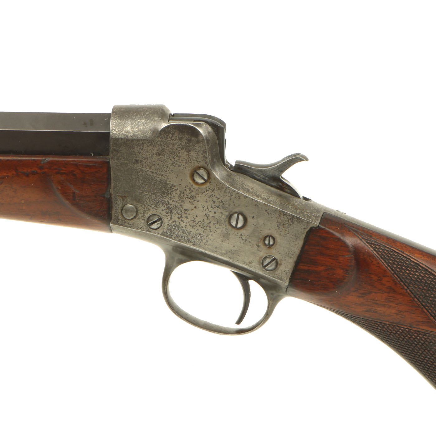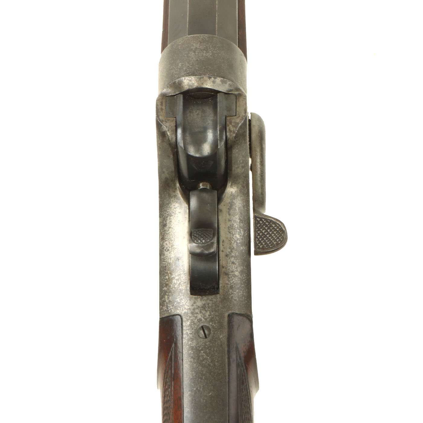 The metal surfaces are in very good condition, especially the barrel, which has almost all of the original bluing, with the edges of each facet slightly worn. The receiver, originally bright steel, has faded a bit, with speckled staining, but no rust pitting or other issues. The action cycles correctly, with a functional ejector, and dry fires as well, with the hammer properly bouncing back. The bore shows clear rifling, but is also somewhat dirty, with fouling in the grooves.