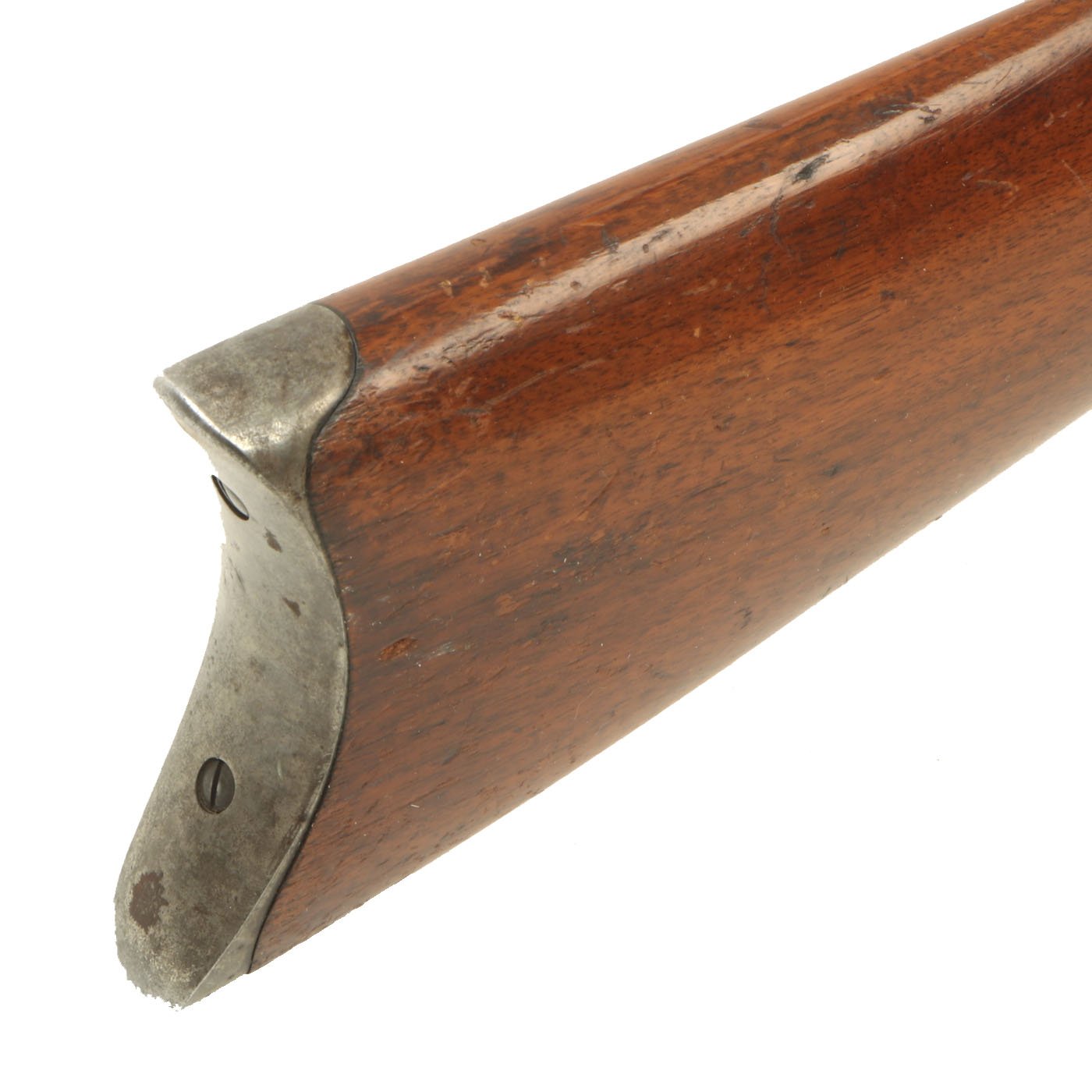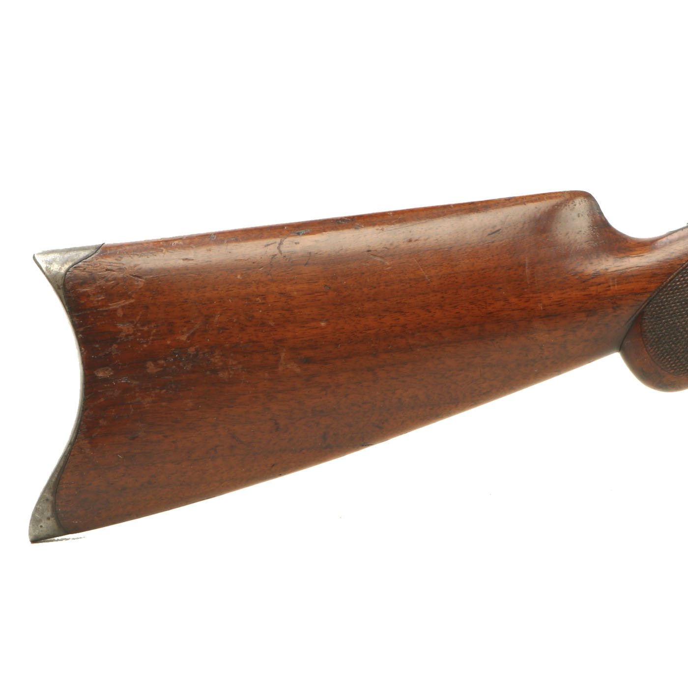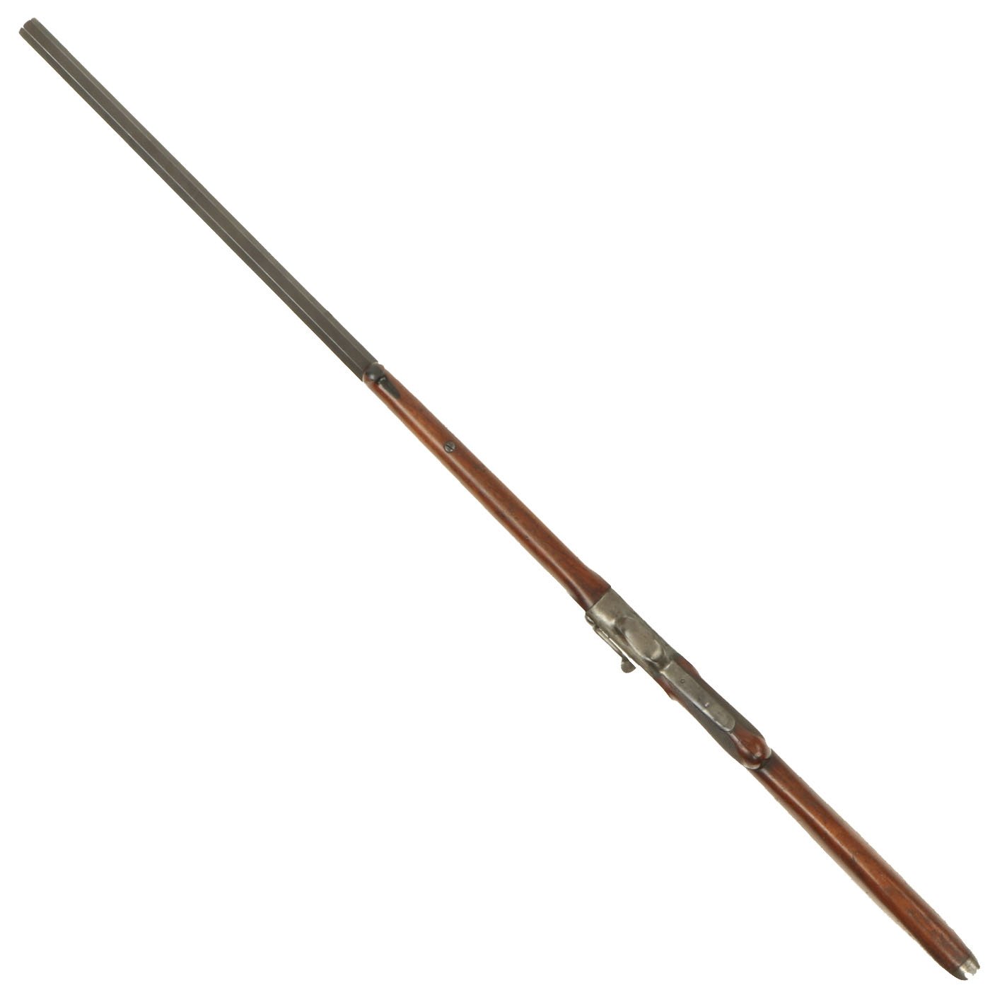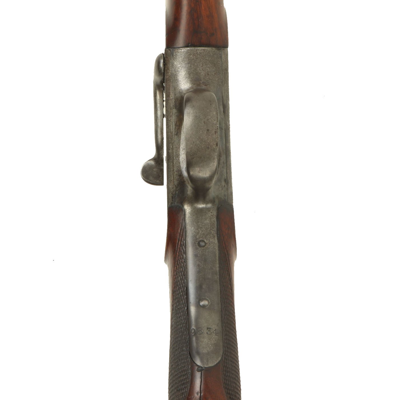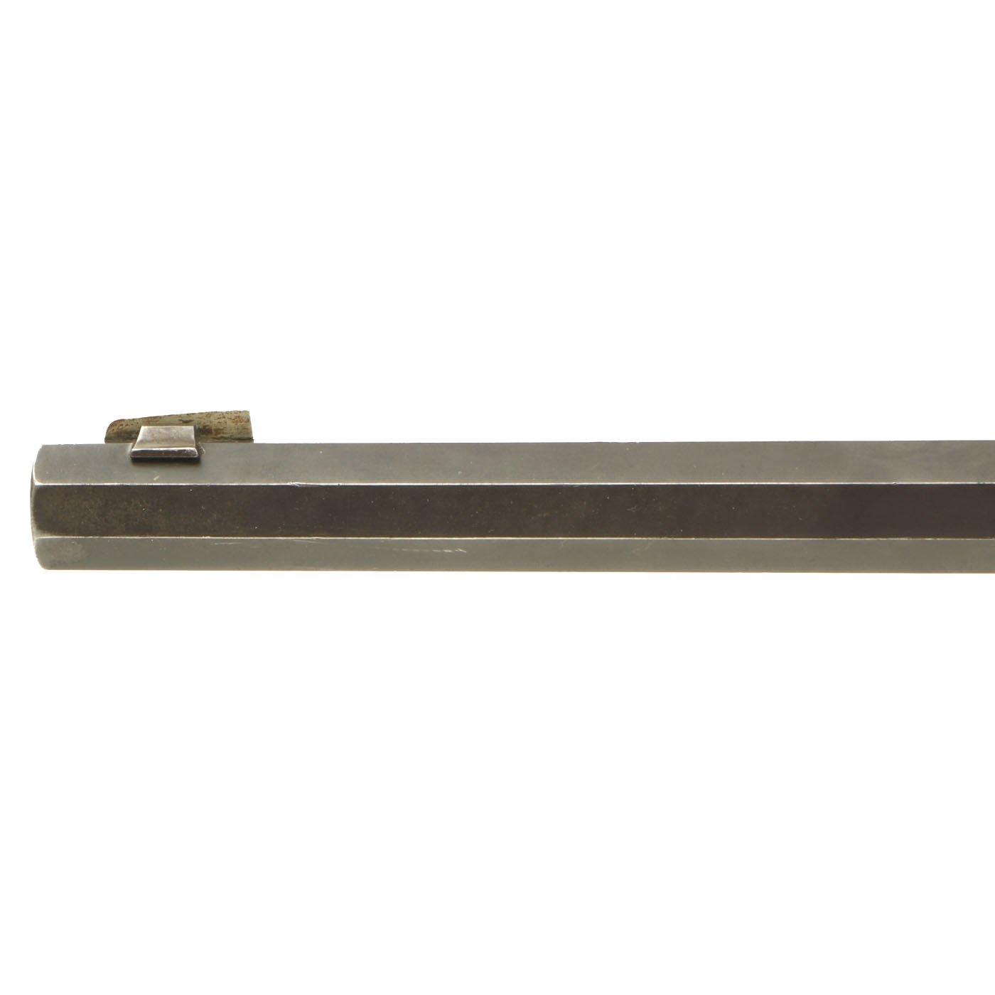 The metal surfaces are in very good condition, especially the barrel, which has almost all of the original bluing, with the edges of each facet slightly worn. The receiver, originally bright steel, has faded a bit, with speckled staining, but no rust pitting or other issues. The action cycles correctly, with a functional ejector, and dry fires as well, with the hammer properly bouncing back. The bore shows clear rifling, but is also somewhat dirty, with fouling in the grooves.