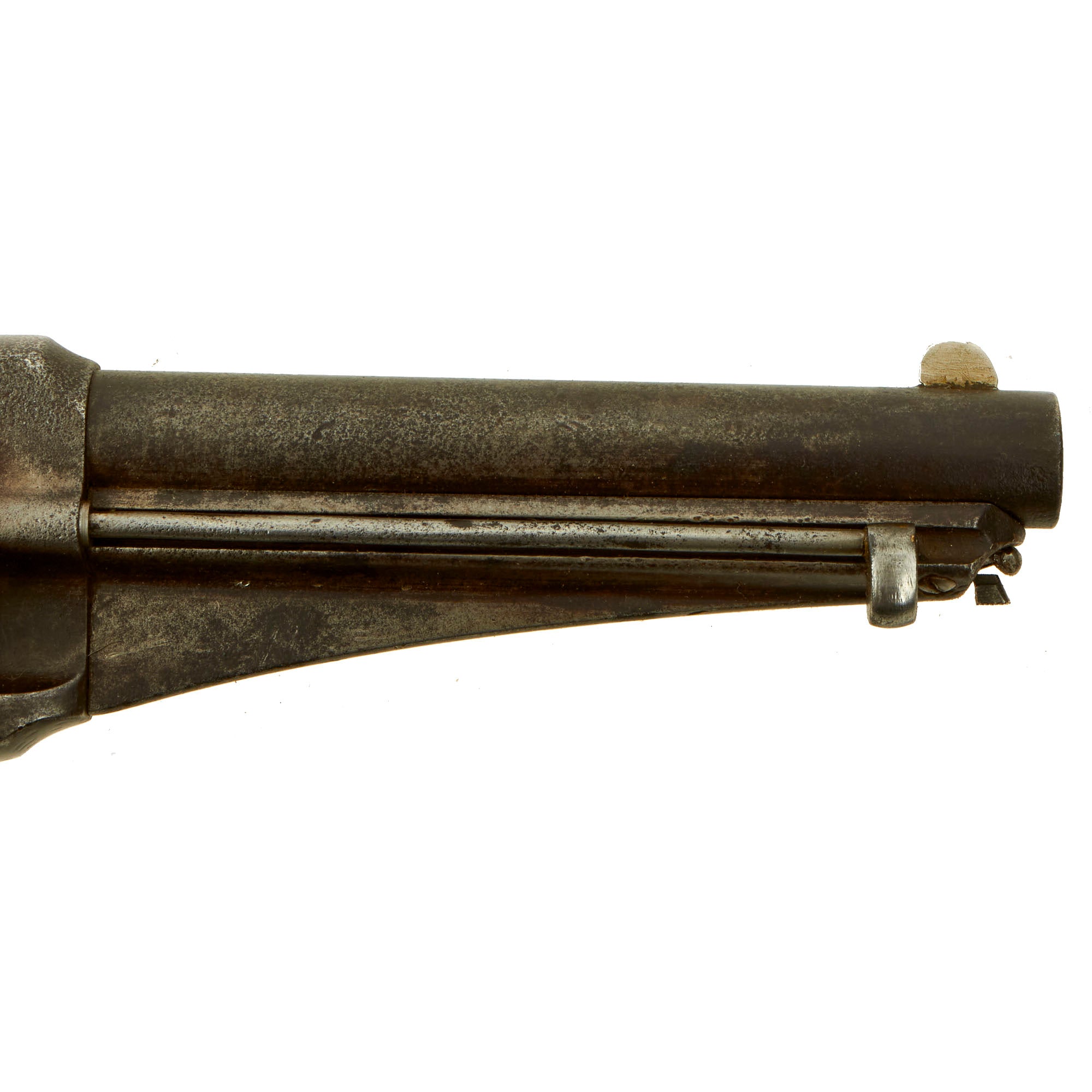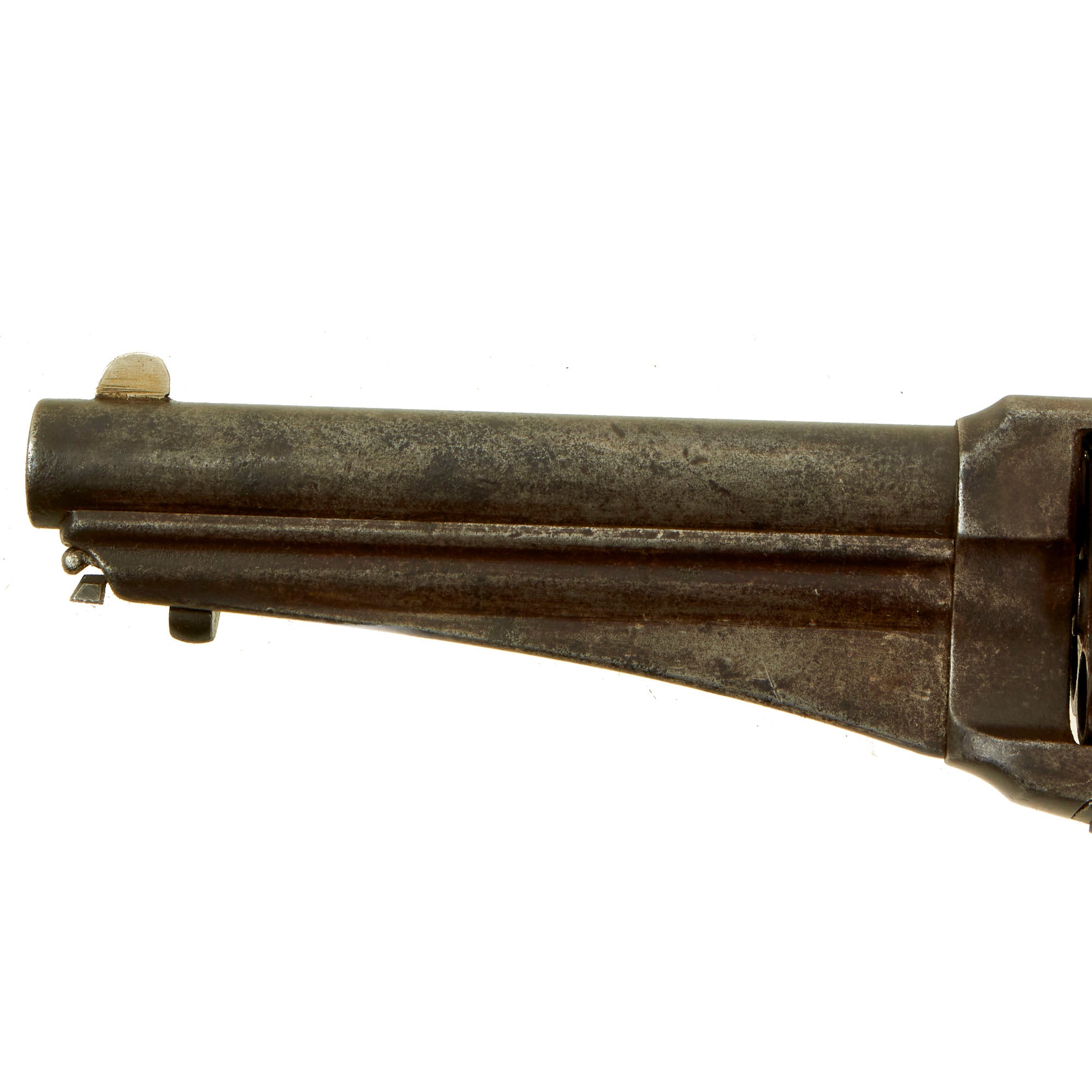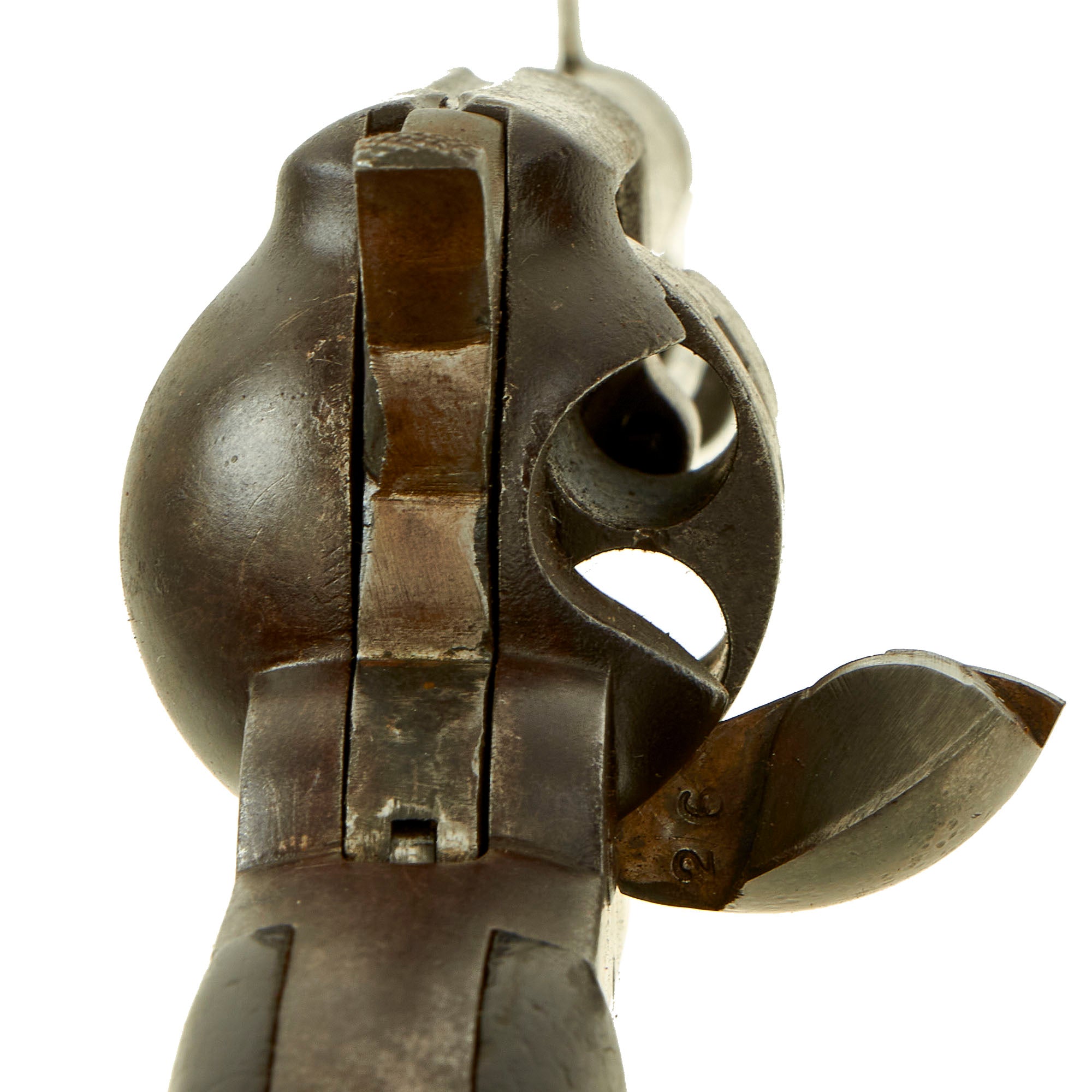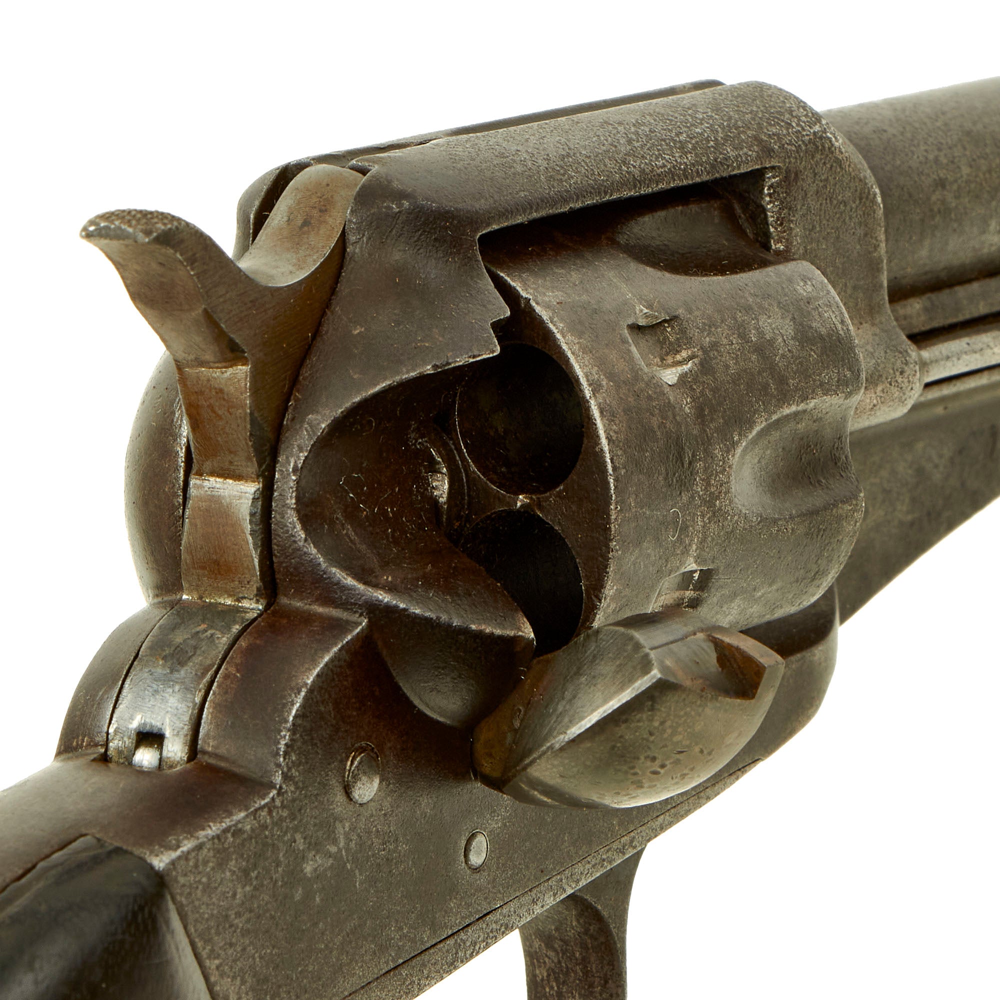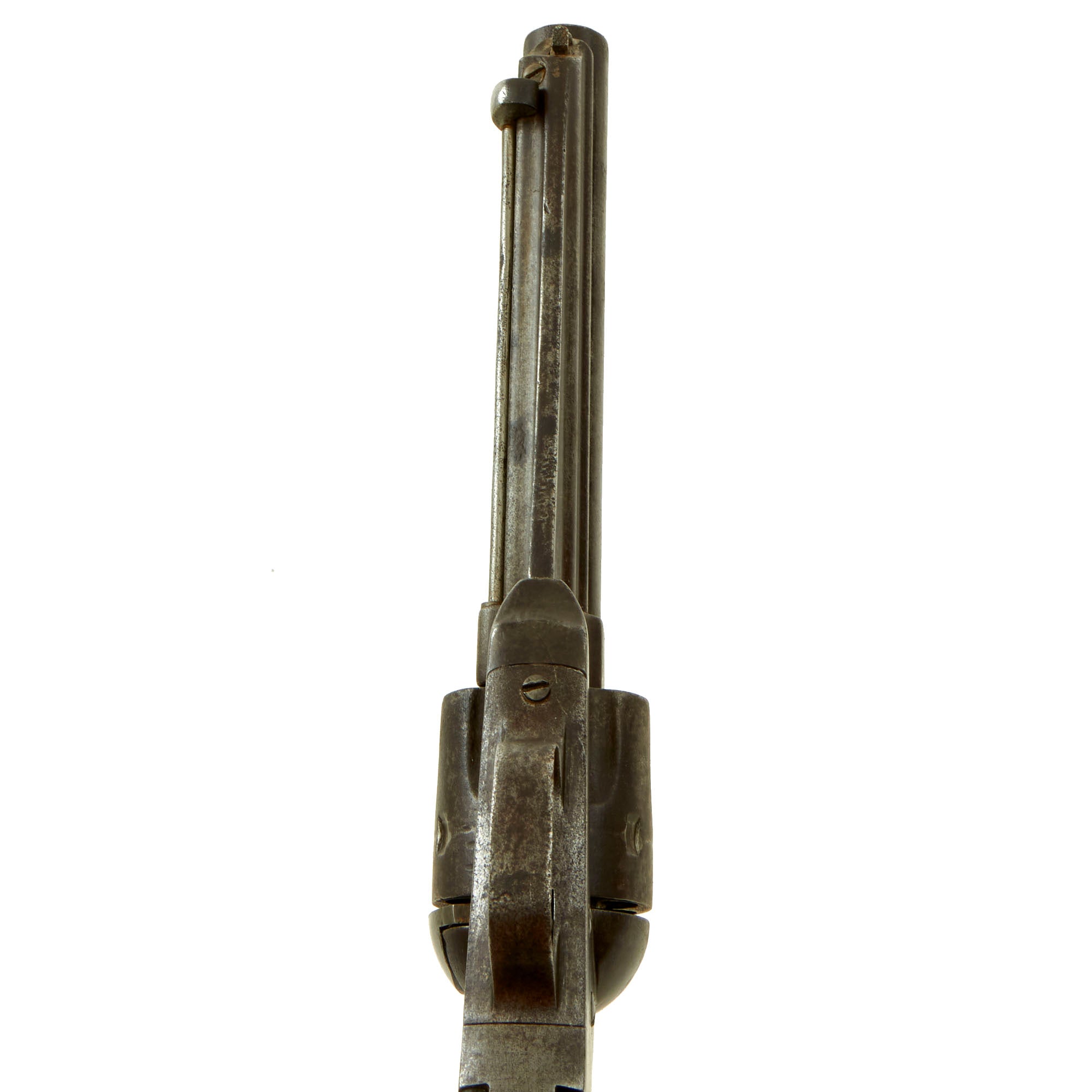 Our example here is in fine patinated condition, showing lots of age consistent with long service on the Western frontier. The walnut wood grips are in very good shape. considering what they must have been through, and do not show any major cracks or repairs, just the usual wear and staining from use. There also is a lanyard loop fitted to the bottom of the grip. Unlike many we see, the revolver still functions very well, with good indexing and a crisp dry fire. It also has a usable loading position where the cylinder can be spun freely. The cylinder lock inlets are worn, so there is one position that it does not hold on, but considering the amount of use this revolver saw, it's quite surprising. The bore is in good condition, showing clear rifling and having an overall gray oxidized finish, but without any major pitting or more serious damage present.