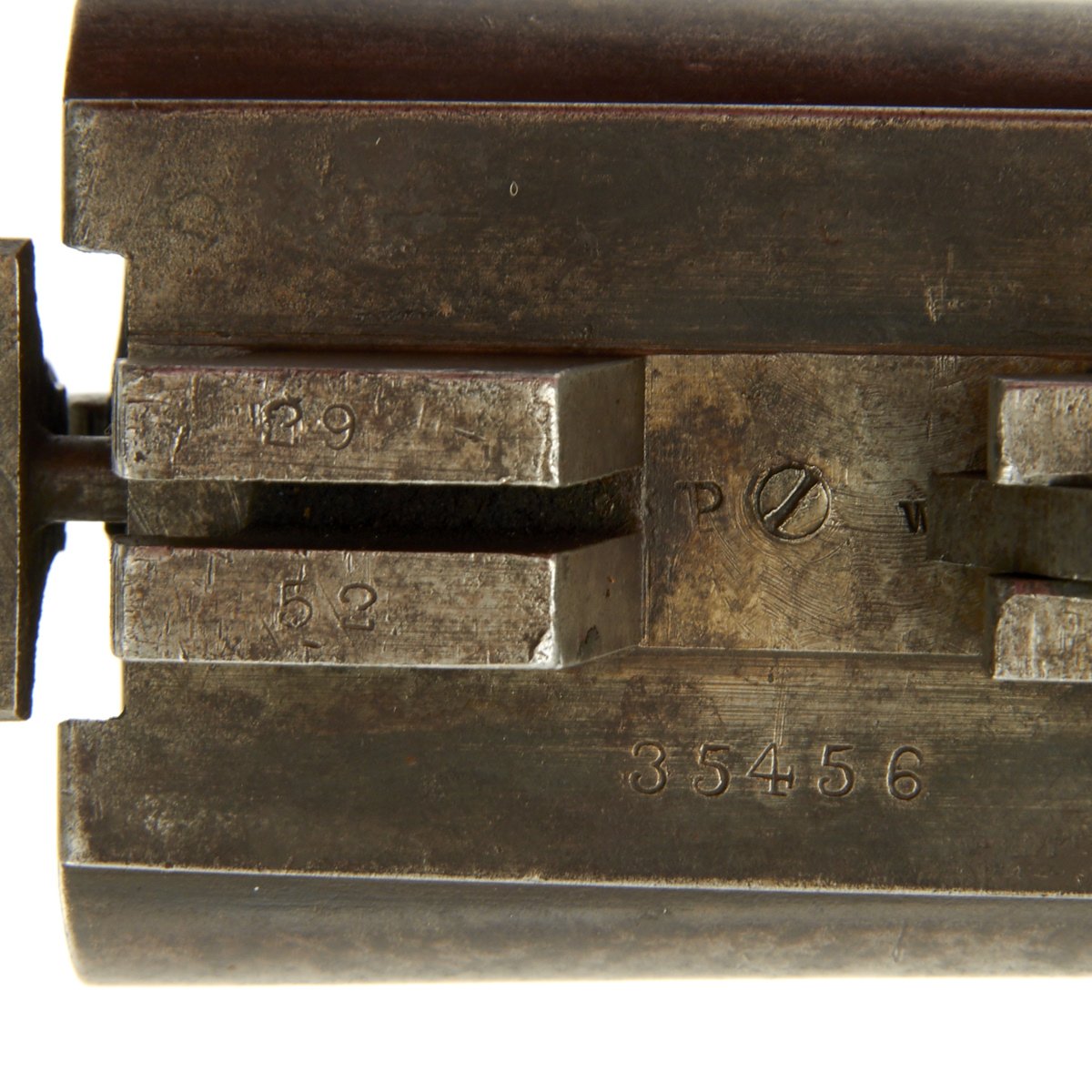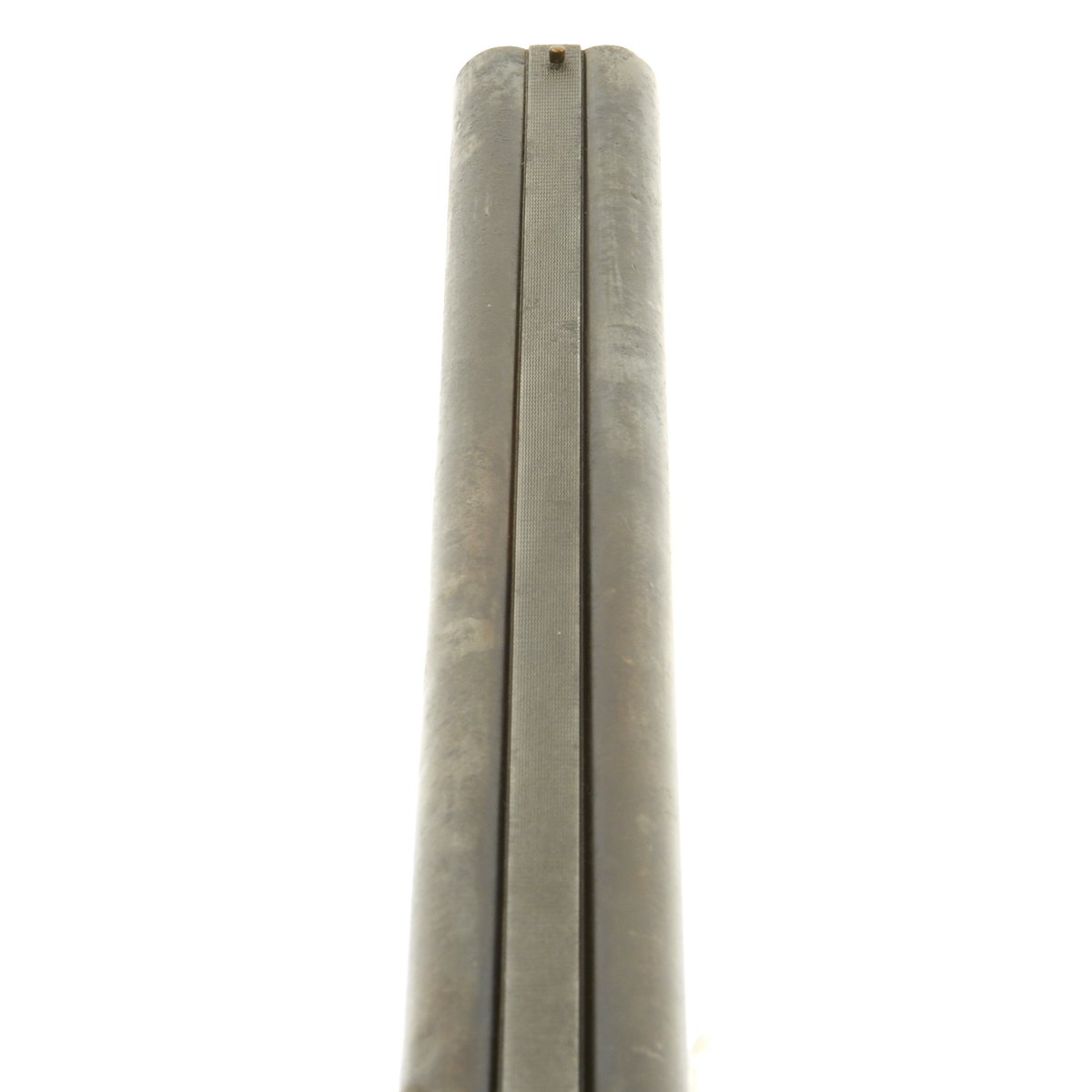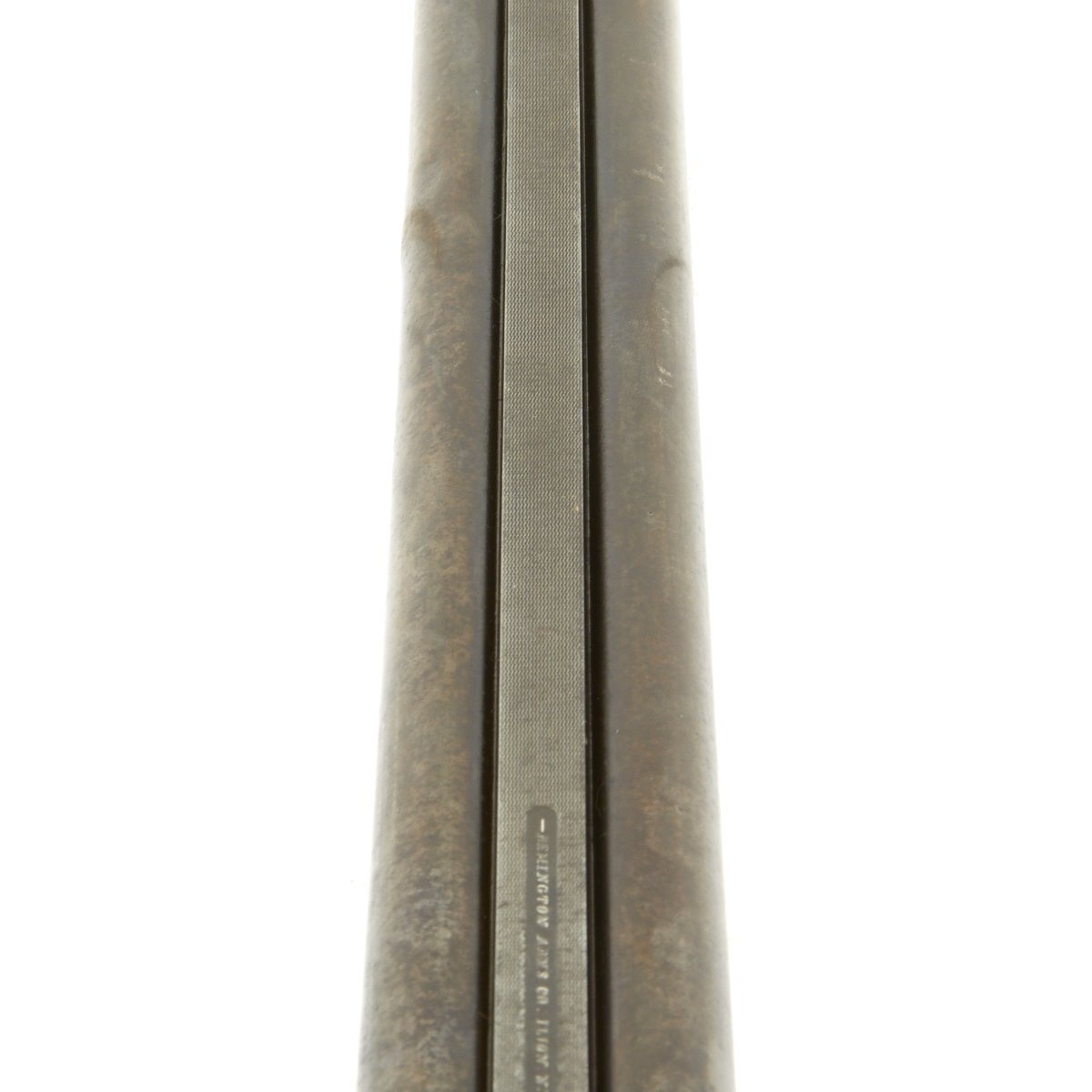 Condition is quite nice, with a nice finish on the metal and wood. The barrels have exterior wear, showing their age and oxidation. Under the foregrip the original blued finish can be seen. Wood is in good shape, with good grain, and a good amount of checkering still on the foregrip. The 12 gauge barrels have 3 inch chambers, and are in good condition, with some wear and powder fowling near the chambers, but are mostly clean.