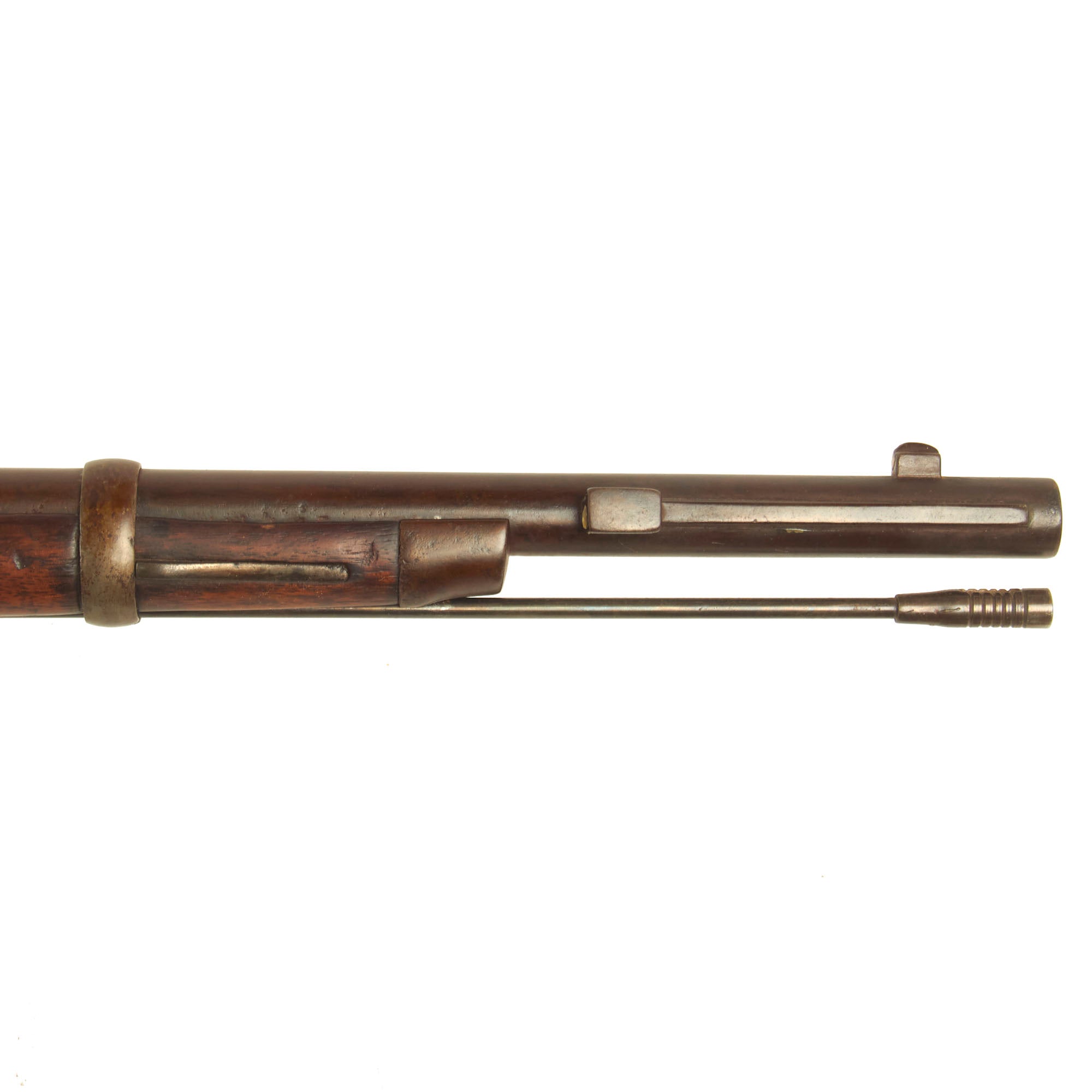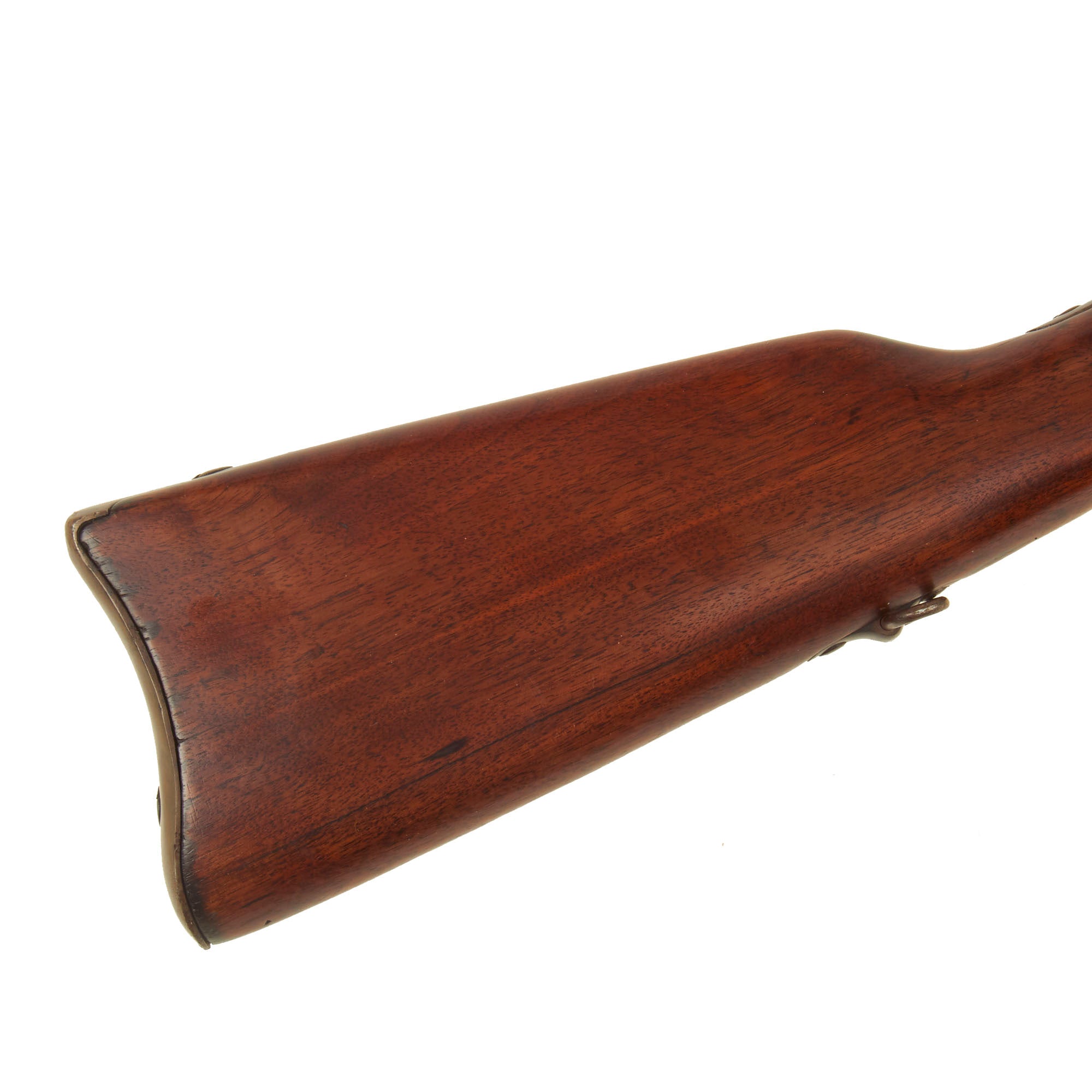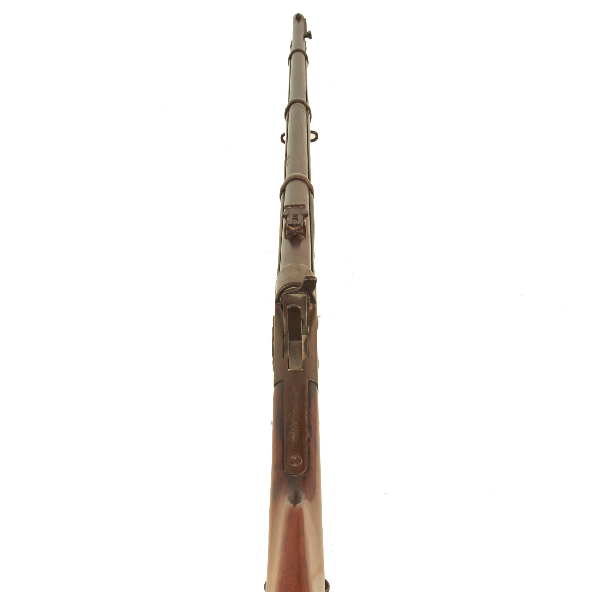 These three contracts exhibit somewhat different characteristics, due to when they were placed. The first contract featured some very early designs, such as the concave top to the rolling block below the breech face, and the sliding cartridge extractor. The other two contracts had the flat top breech block, but all retained the sliding cartridge extractor. As a 2nd contract example, there are Spanish crown markings on the barrel bands, as well as some faded ones on the receiver. It also features the solid barrel bands and springs, which were not seen on the later examples.