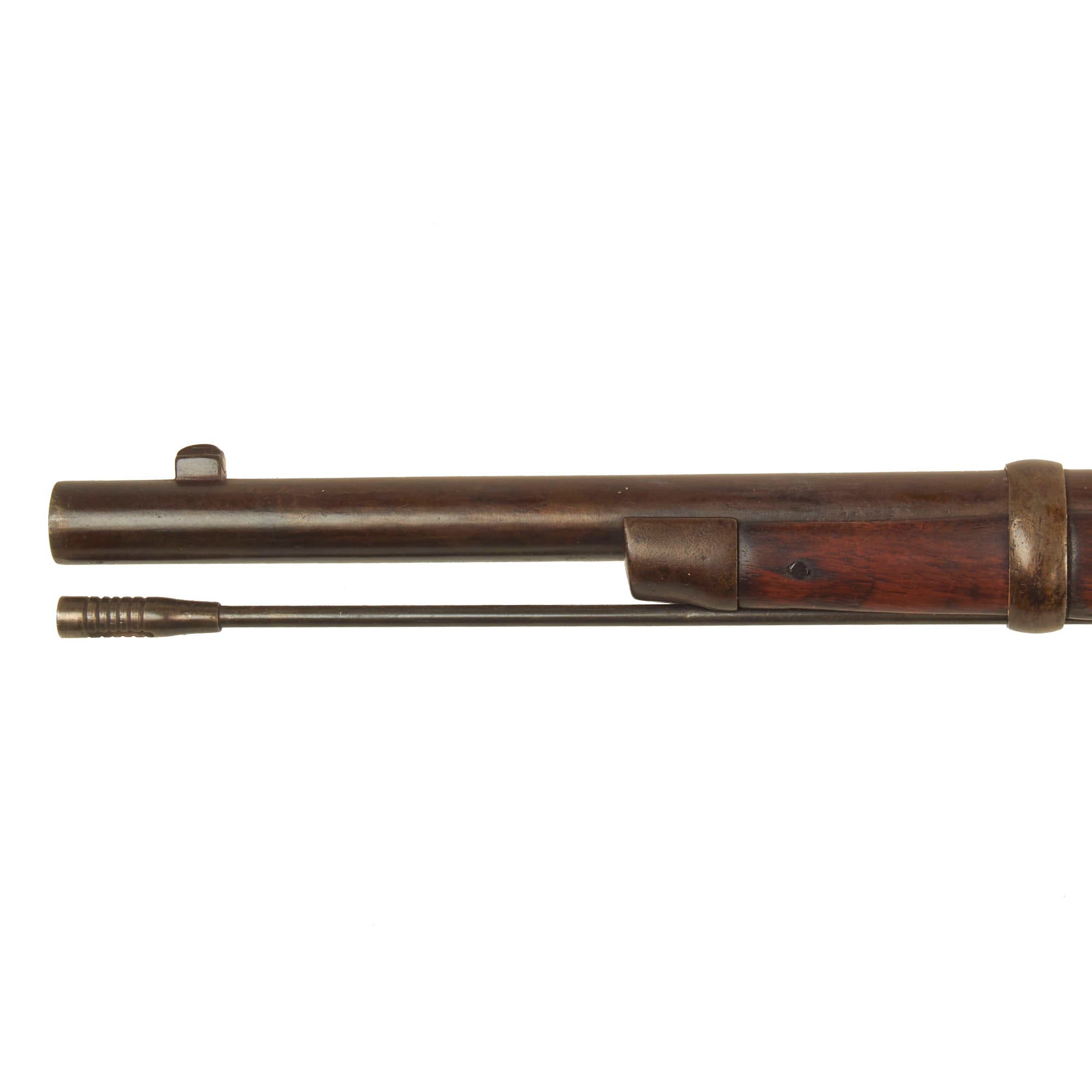 The rifle is in very good condition, showing wear from long use in service. The finish on the metalwork has matured to a nice gray patina, and the stock has a lovely color, having been reconditioned and varnished at some point. Both sling swivels are present, as is the original cleaning rod. The refinishing has worn down the stock a bit, which has made the barrel bands a bit loose, which is why the lower band has a small shim under it on the left side.