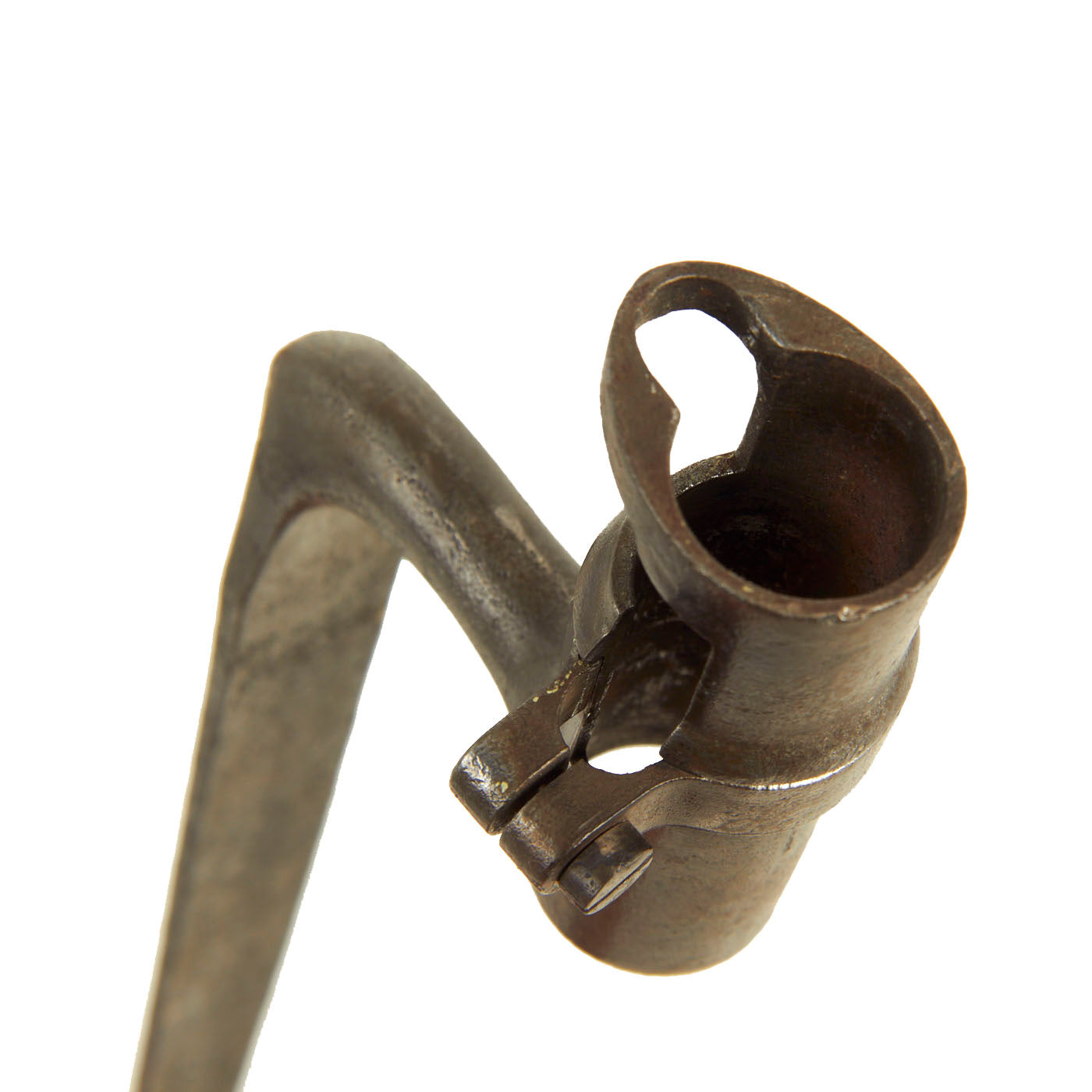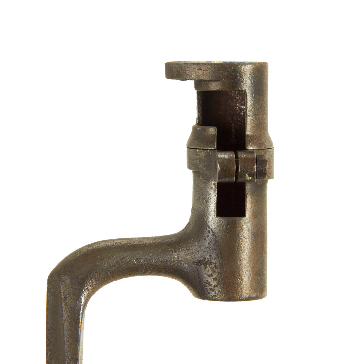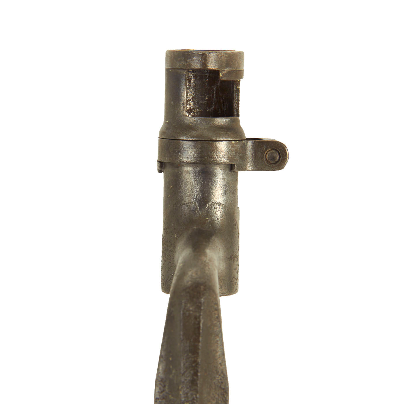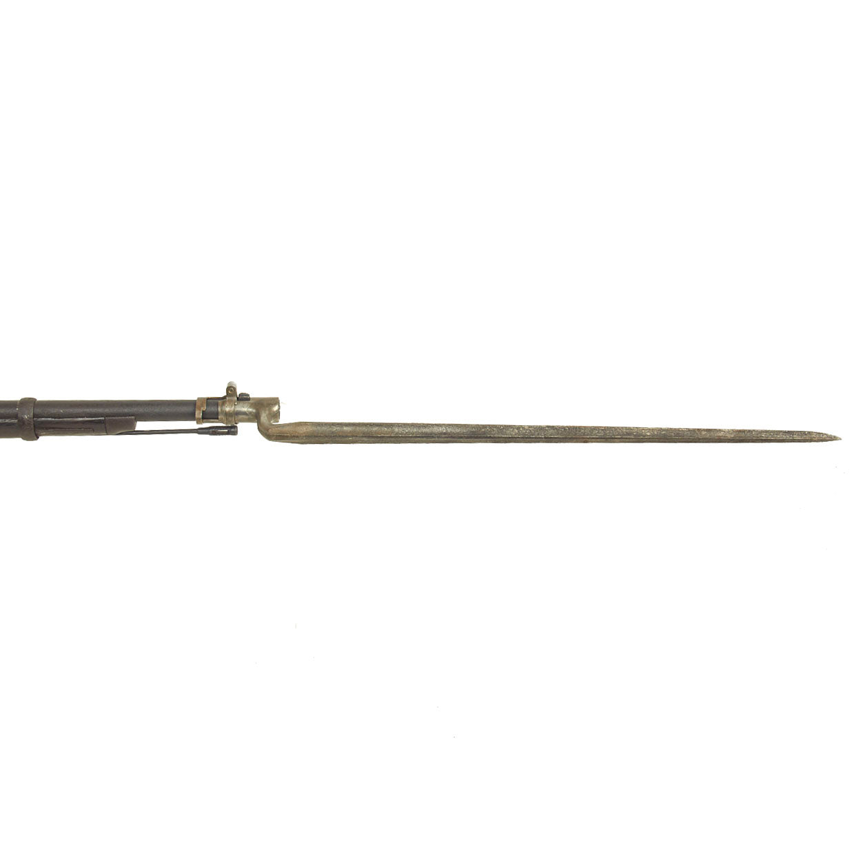 This is a nice "Barn Fresh" example, which looks to have seen long service, and then been stored in a barn or attic for quite some time with its original bayonet. This has resulted in oxidation over the entire exterior surface, which shows a lovely dark matured patina overall. There are areas of light pitting, such as on the receiver and barrel bands, as well as much of the surface of the barrel. The wood shows significant wear, and has a dark color, with some cracks and chips consistent with long service and later storage. The bore is clear, and still does show rifling, however it is faint and well worn.