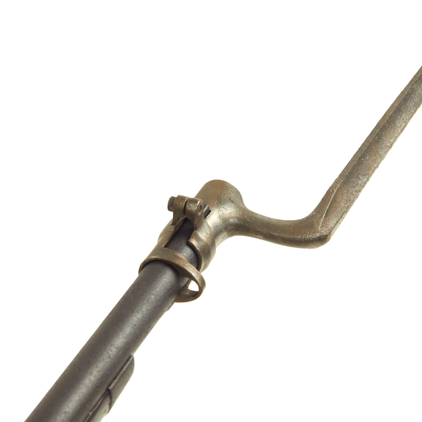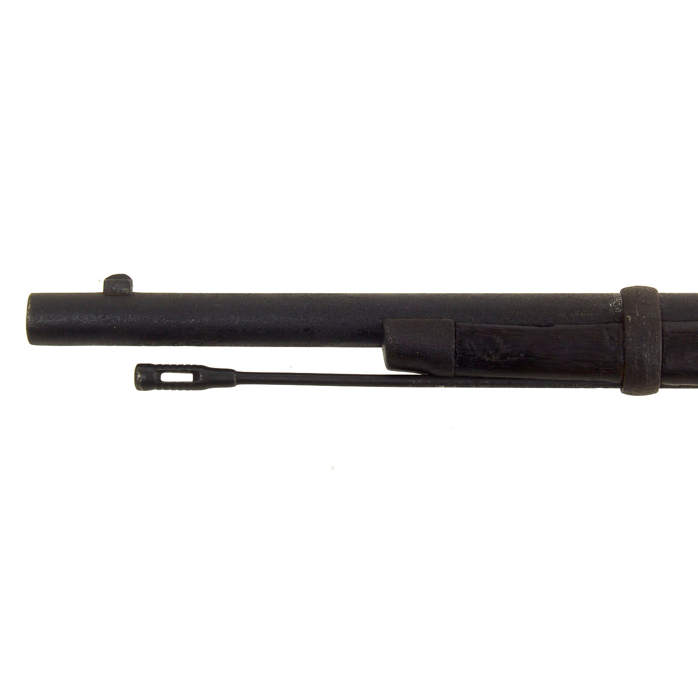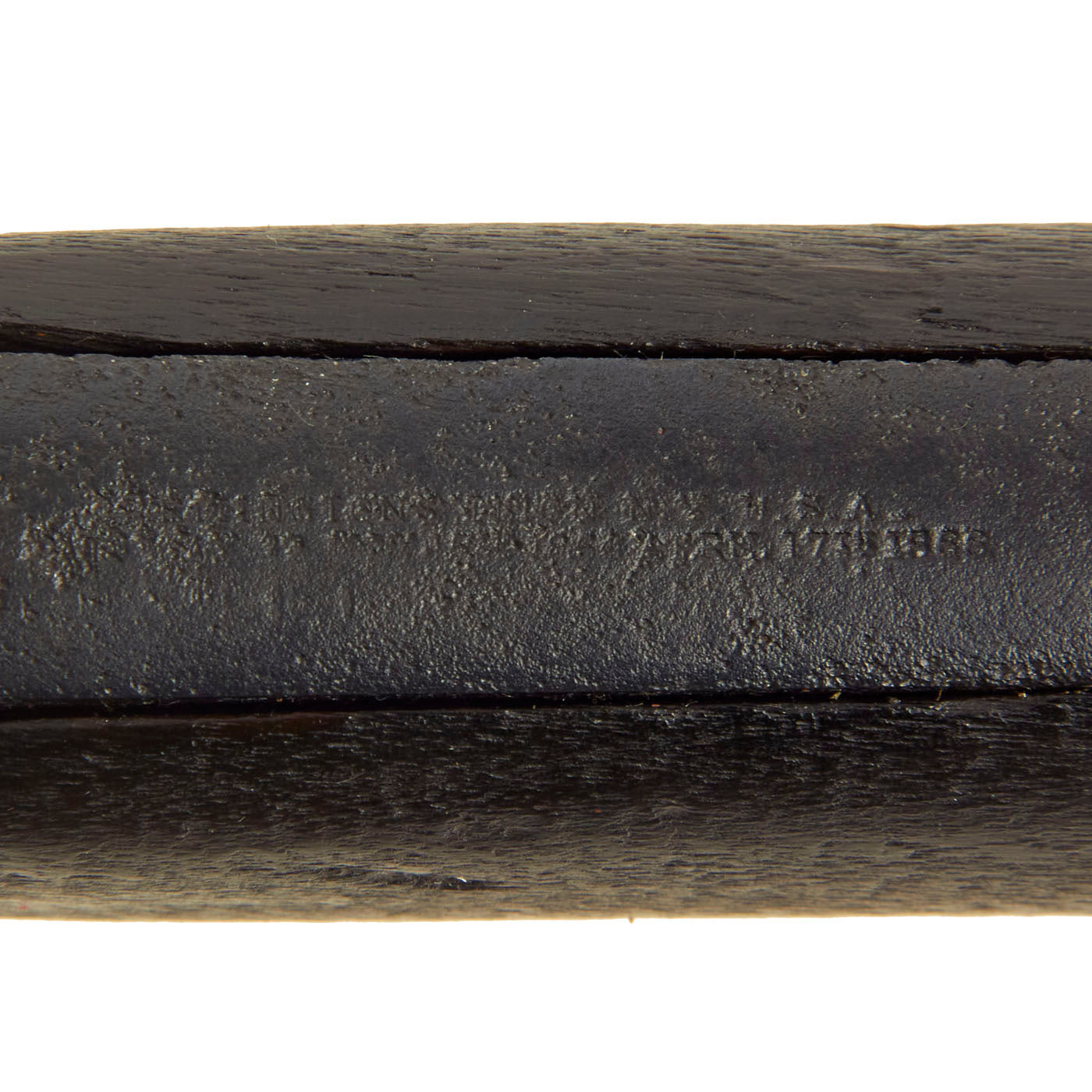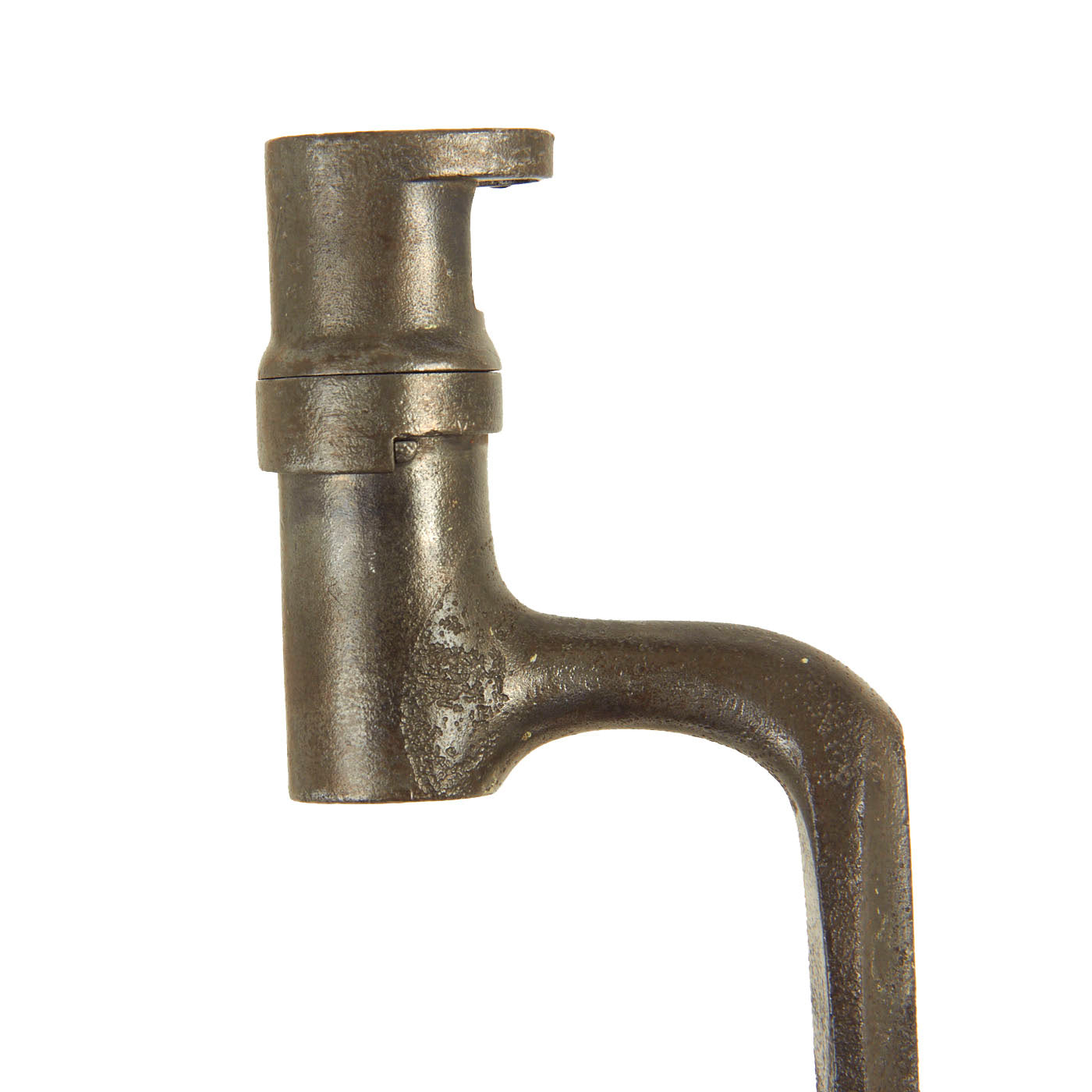 This is a nice "Barn Fresh" example, which looks to have seen long service, and then been stored in a barn or attic for quite some time with its original bayonet. This has resulted in oxidation over the entire exterior surface, which shows a lovely dark matured patina overall. There are areas of light pitting, such as on the receiver and barrel bands, as well as much of the surface of the barrel. The wood shows significant wear, and has a dark color, with some cracks and chips consistent with long service and later storage. The bore is clear, and still does show rifling, however it is faint and well worn.