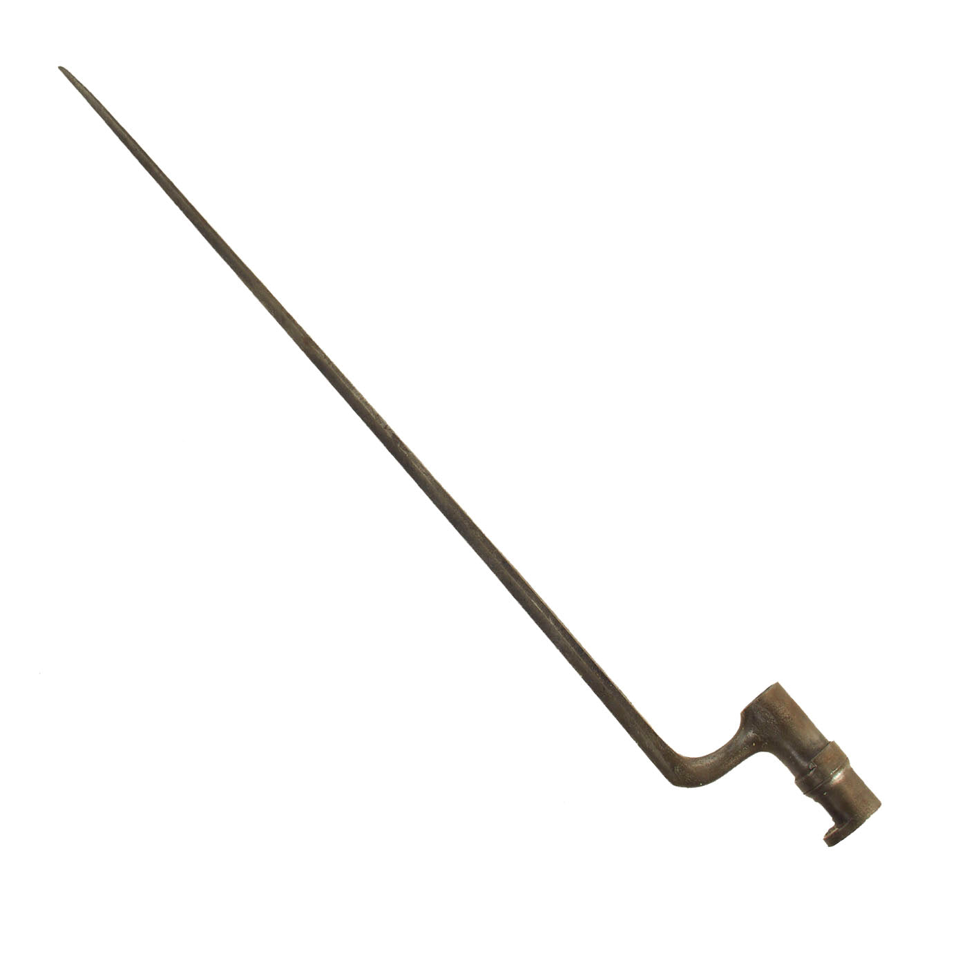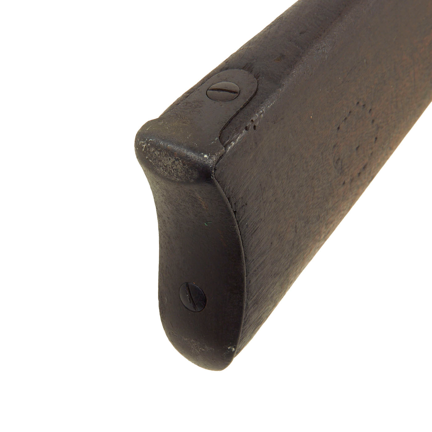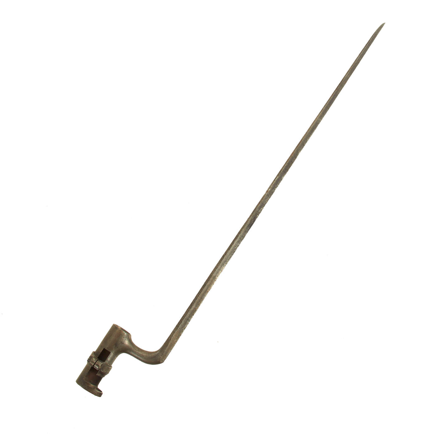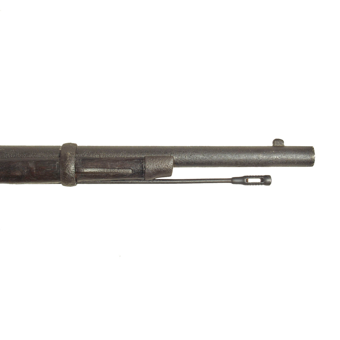 This is a nice "Barn Fresh" example, which looks to have seen long service, and then been stored in a barn or attic for quite some time with its original bayonet. This has resulted in oxidation over the entire exterior surface, which shows a lovely dark matured patina overall. There are areas of light pitting, such as on the receiver and barrel bands, as well as much of the surface of the barrel. The wood shows significant wear, and has a dark color, with some cracks and chips consistent with long service and later storage. The bore is clear, and still does show rifling, however it is faint and well worn.