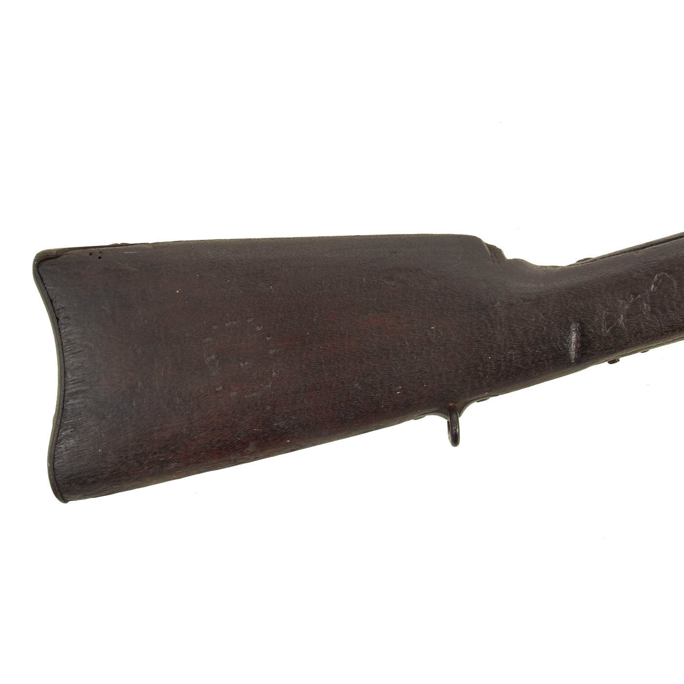 There are also still western numerals on the left side of the sight ramp and on the sight leaf itself. Due to wear, we can't really tell where this rifle was issued to. We thought it was in .43 Spanish/Egyptian, but the bore at the muzzle measures out to 12mm, which is a bit to large for .43, even if it was quite worn. We did notice that one of the barrel bands has a "Crown" on it, which could indicate possible it was intended for some European contract. It is in centerfire, and shows no signs of being a conversion from rimfire. The action does still work correctly, with the ejector present and functional. It has a strong dry fire, and the firing pin spring is still intact and functional.