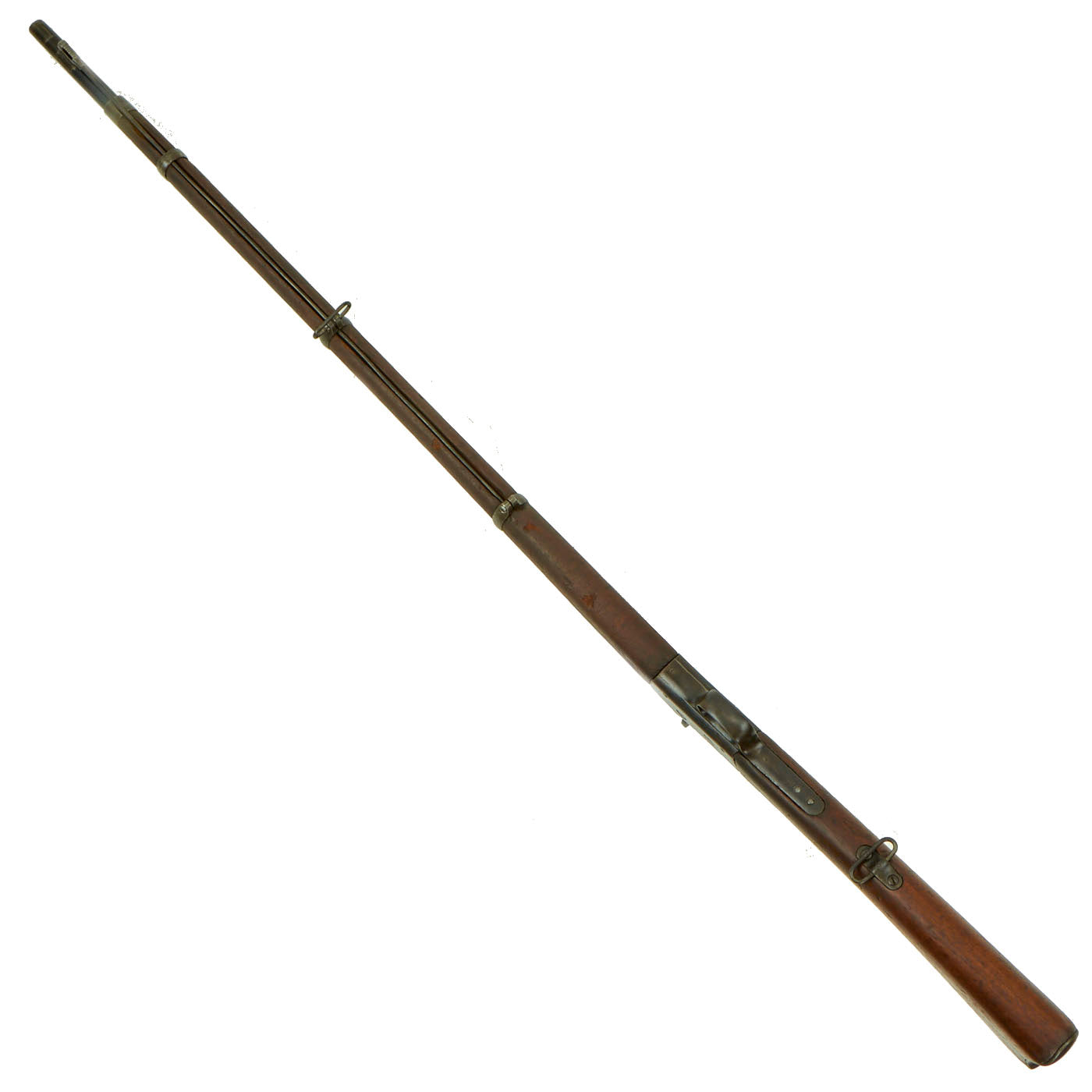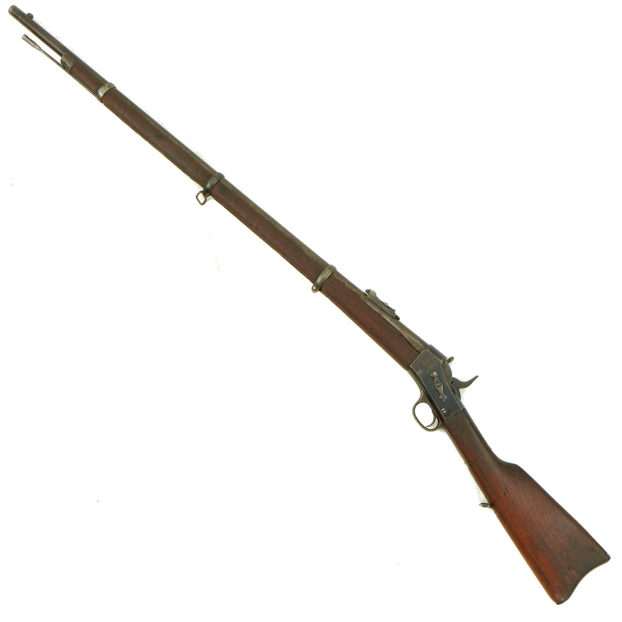 This is an original Egyptian contract Remington Rolling block rifle, supplied to Egypt starting in 1869 in .43 Egyptian. In all 300,000 of these were produced but 100,000 were diverted to France for the Franco-Prussian War of 1870-1871. Some of these Remington M-1869 Infantry rifles have been re-imported over the past 30 years but they are hard to find in any decent condition. This was the model rifle used to fight the British at the Battle of Tel-El-Kabir in 1882 and the Mahdi's Sudanese Dervishes at the siege of Khartoum in which General Gordon was killed in January of 1885. There are no Egyptian markings on this rifle, so we suspect it is an example that escaped markings. It has the correct "reversed" rear sight, which we noticed was facing the wrong way around after photography, and corrected.