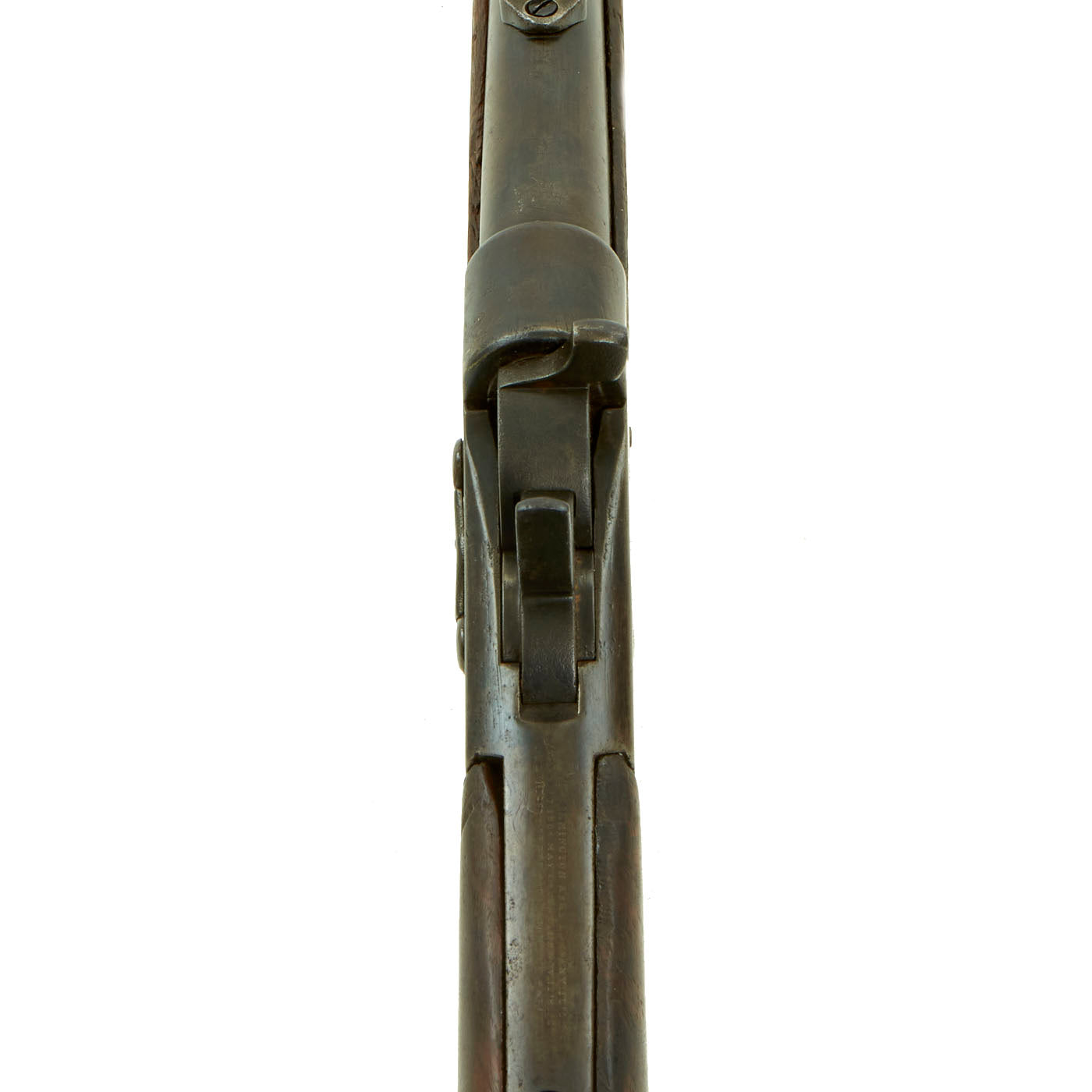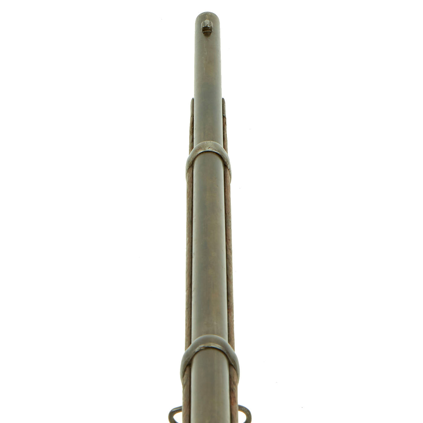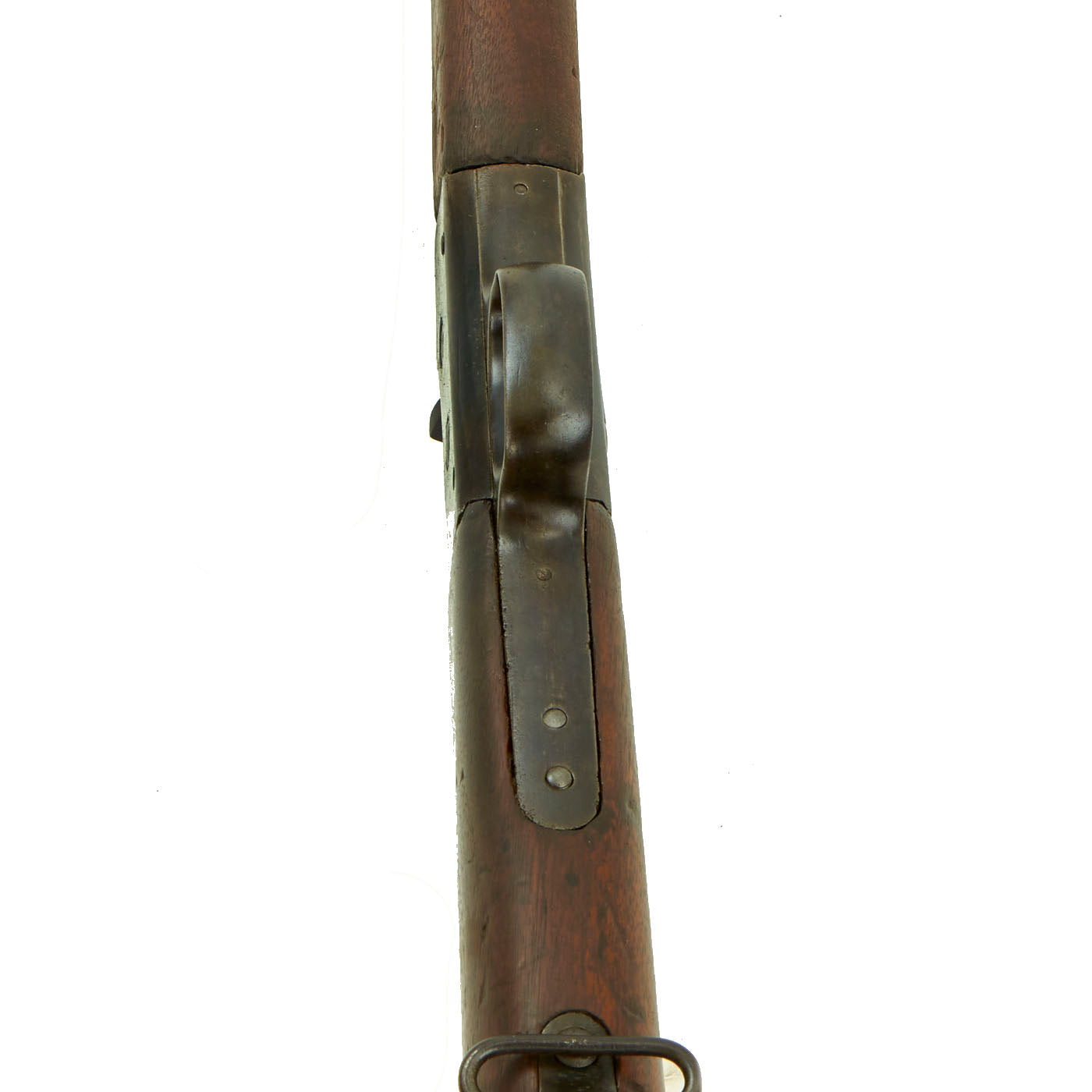 The Rifle comes with its original cleaning rod, and unlike almost all that we see, there are still Remington patent markings on the receiver tang! Most of the three lines can still be made out, though the right lighting may be needed to see them in reflection. The metalwork has a lovely worn gray patina, often acquired as the guns are in sandy conditions, and were often cleaned with sand as well, though this example may have escaped that. There is definitely wear, but nothing out of the ordinary for a long service used rifle.
