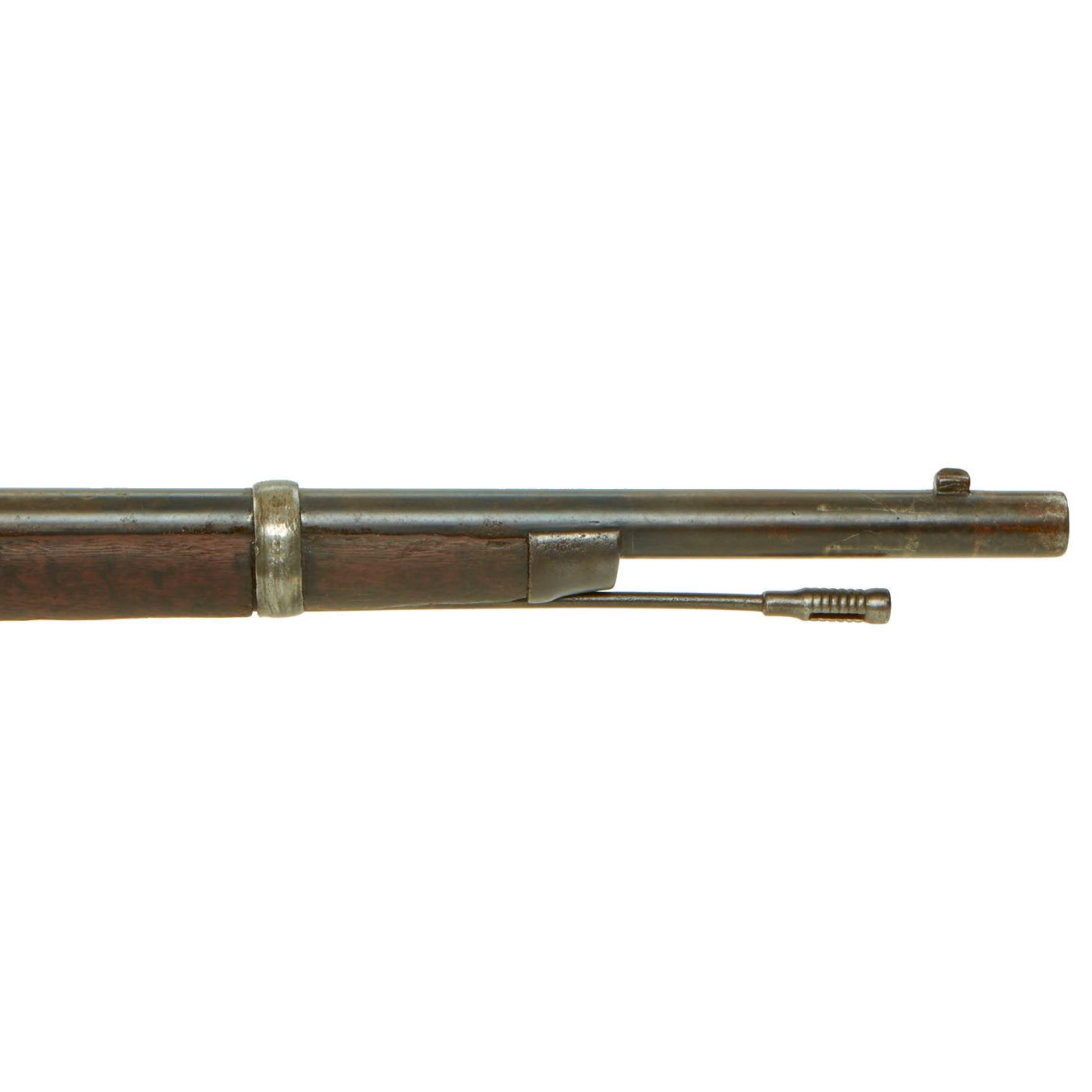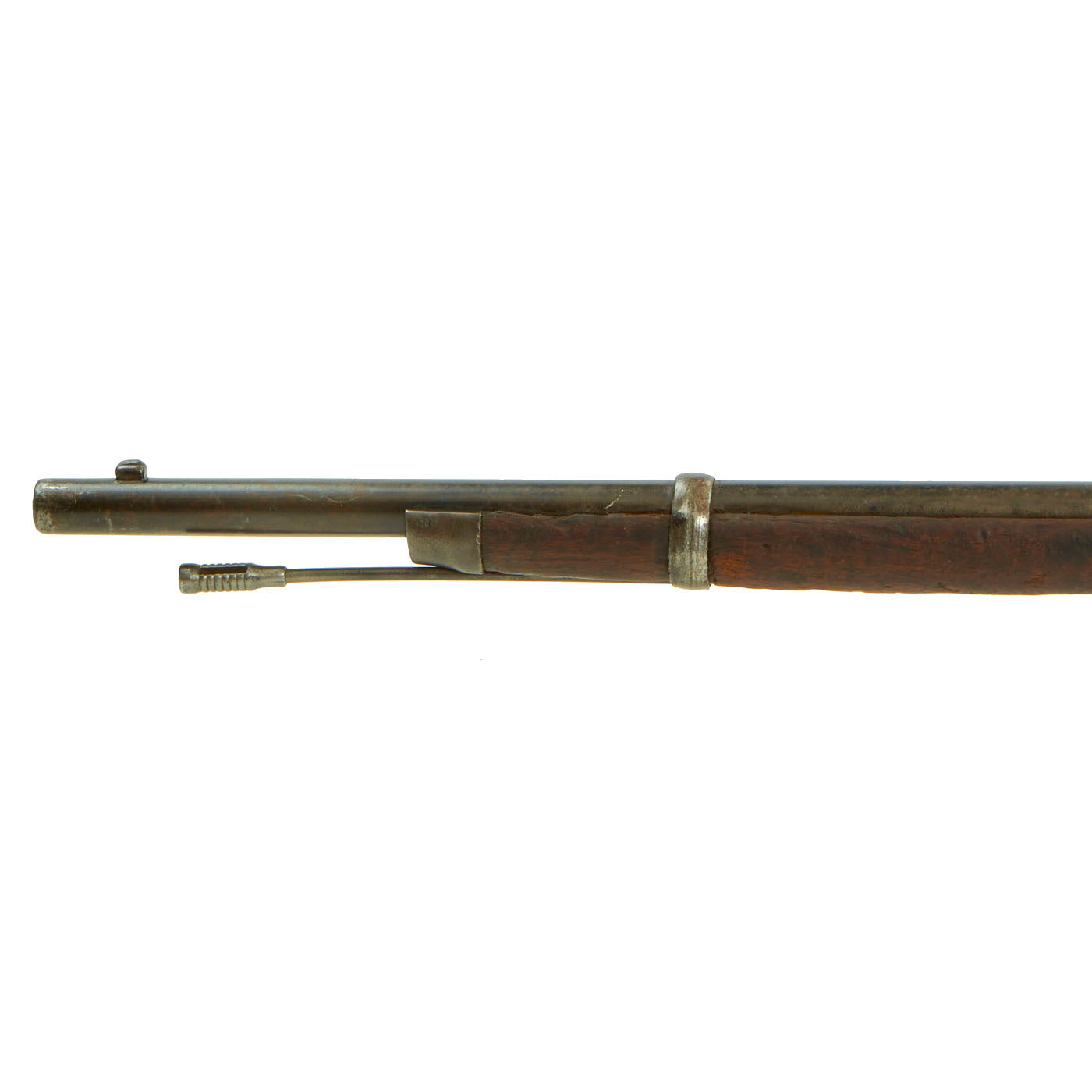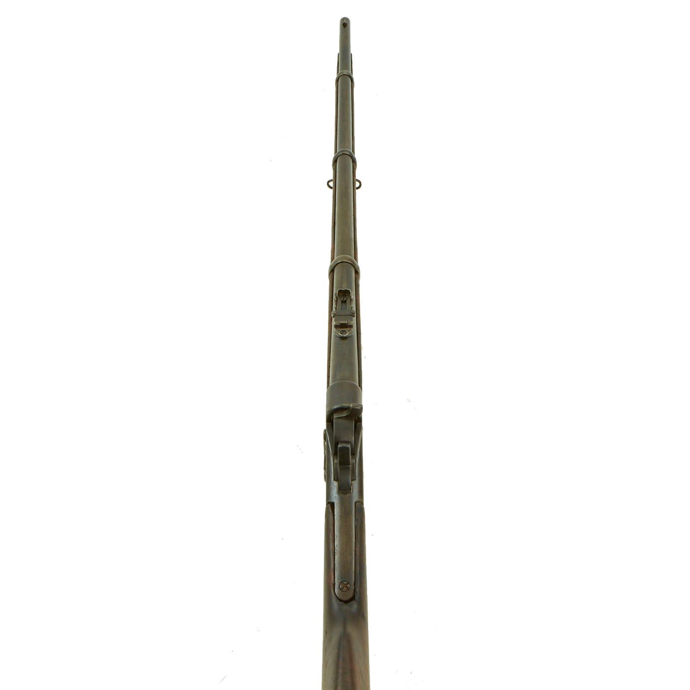 The Rifle comes with its original cleaning rod, and unlike almost all that we see, there are still Remington patent markings on the receiver tang! Most of the three lines can still be made out, though the right lighting may be needed to see them in reflection. The metalwork has a lovely worn gray patina, often acquired as the guns are in sandy conditions, and were often cleaned with sand as well, though this example may have escaped that. There is definitely wear, but nothing out of the ordinary for a long service used rifle.