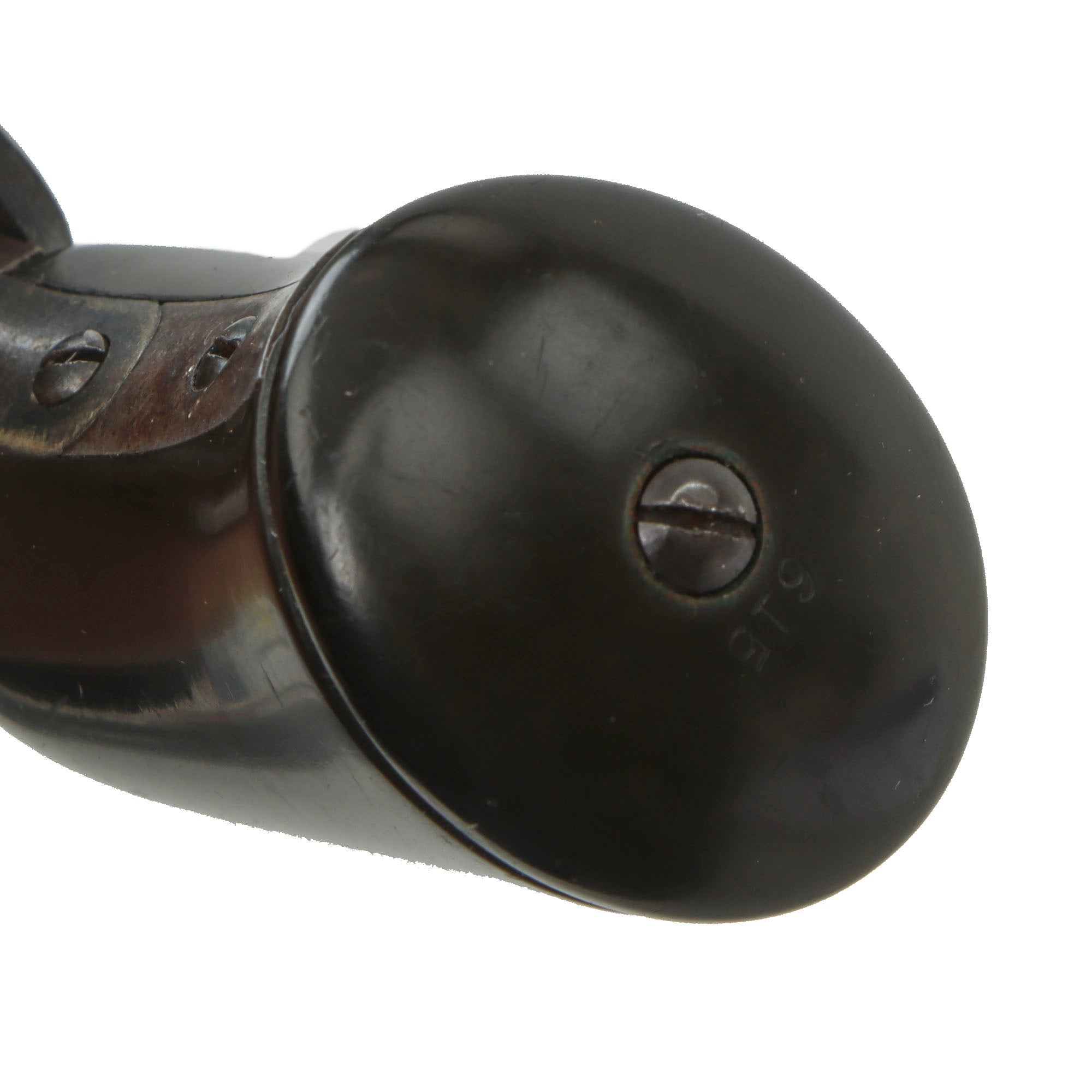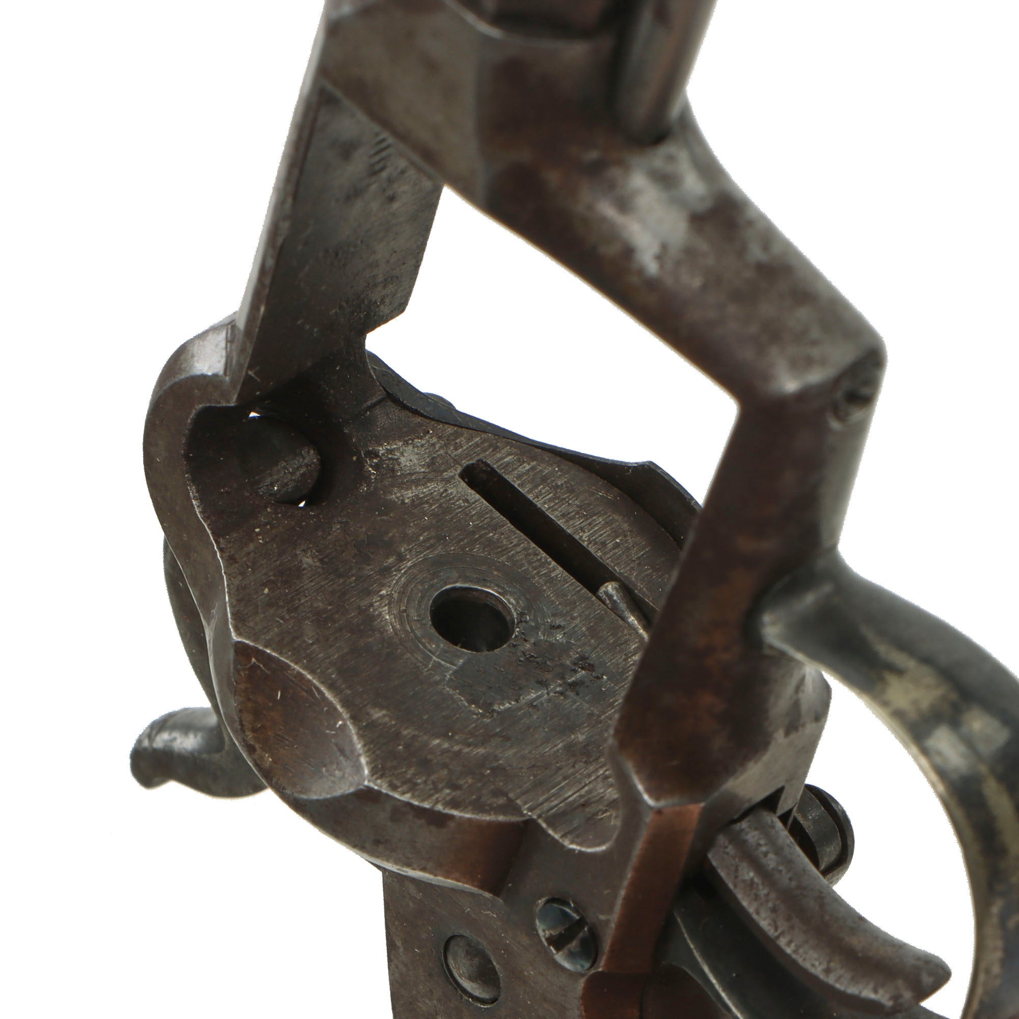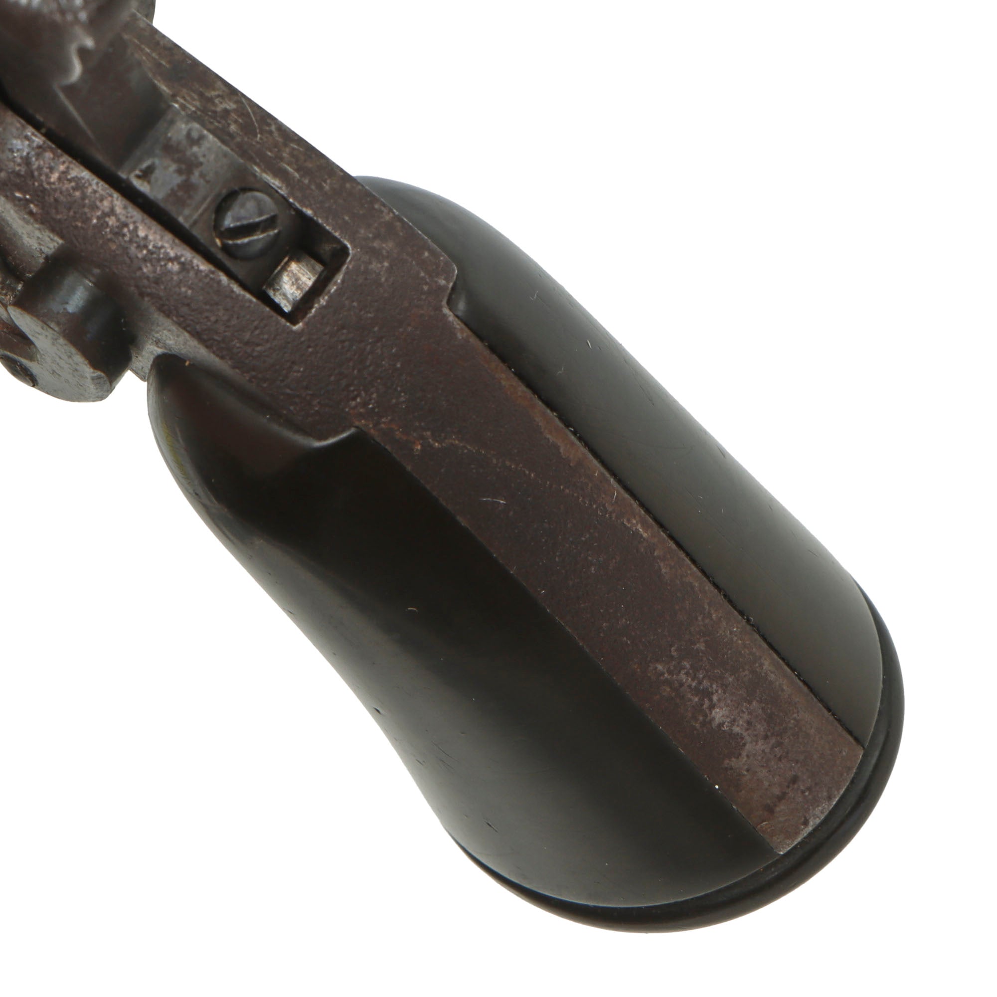 The hard rubber "gutta percha" trip is in great shape, showing light use, and no cracking or other damage. The revolver functions, but the hand spring is worn or broken, so it will only cycle reliably with the revolver pointed muzzle down. The cylinder does not lock when fully cocked, but we do not know if this is correct or a deficiency. The bore is in very good condition, showing a mostly bright finish with clear lands and grooves. There are however some areas of past oxidation, now cleaned away, which eroded the interior surface, so this is definitely a revolver that saw some real use. All five cap nipple cones are clear, showing oxidation and fouling on the exterior from use, as well as some mushrooming from hammer strikes.