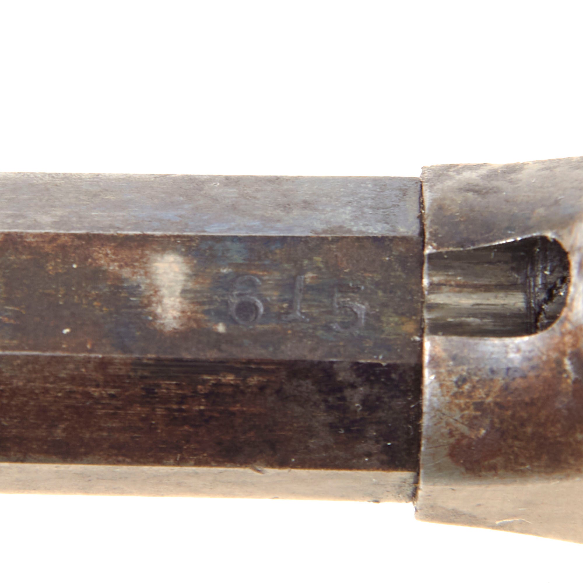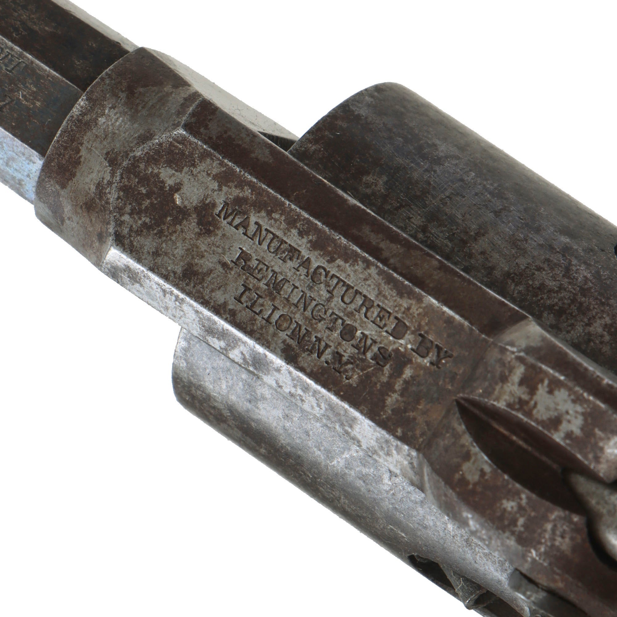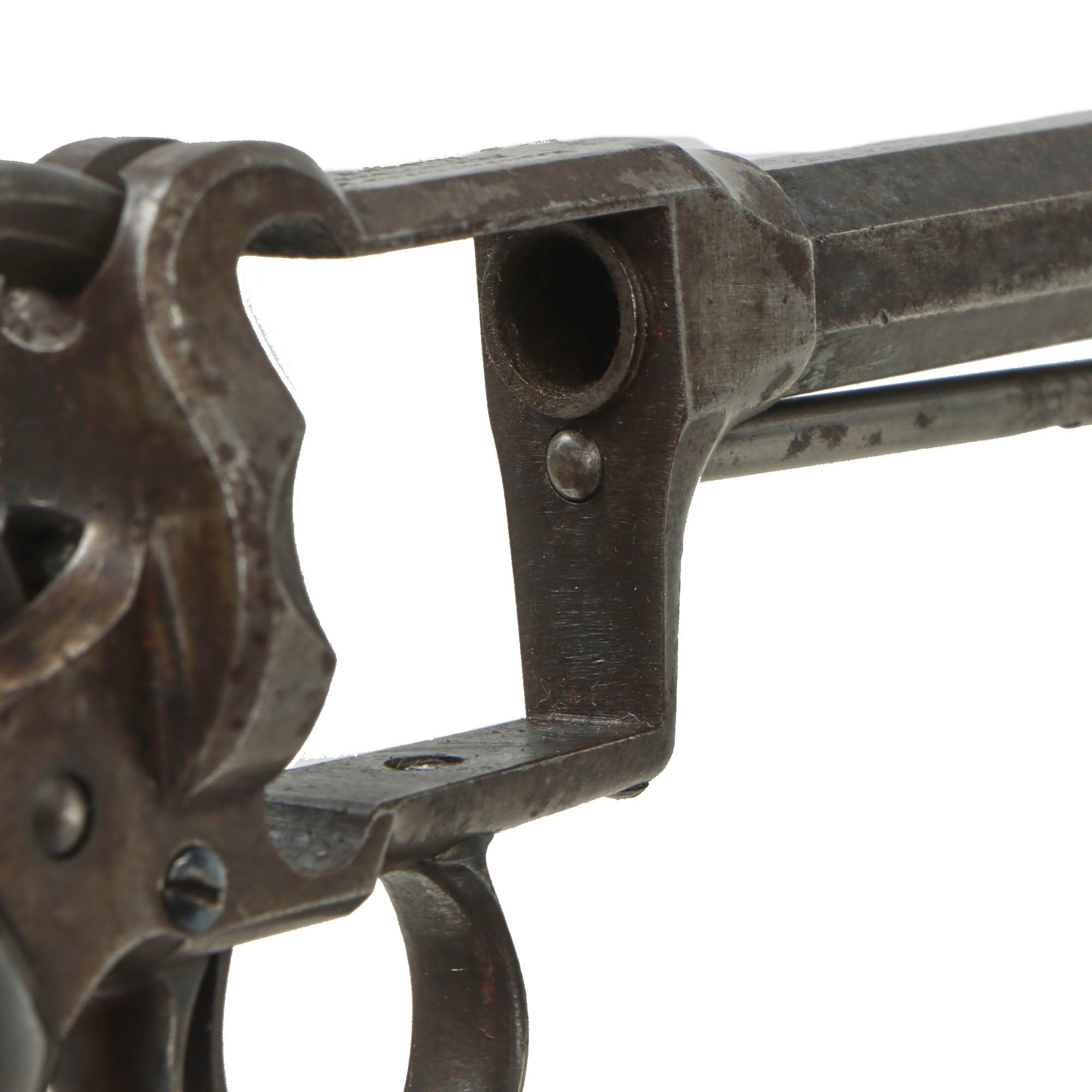 The hard rubber "gutta percha" trip is in great shape, showing light use, and no cracking or other damage. The revolver functions, but the hand spring is worn or broken, so it will only cycle reliably with the revolver pointed muzzle down. The cylinder does not lock when fully cocked, but we do not know if this is correct or a deficiency. The bore is in very good condition, showing a mostly bright finish with clear lands and grooves. There are however some areas of past oxidation, now cleaned away, which eroded the interior surface, so this is definitely a revolver that saw some real use. All five cap nipple cones are clear, showing oxidation and fouling on the exterior from use, as well as some mushrooming from hammer strikes.