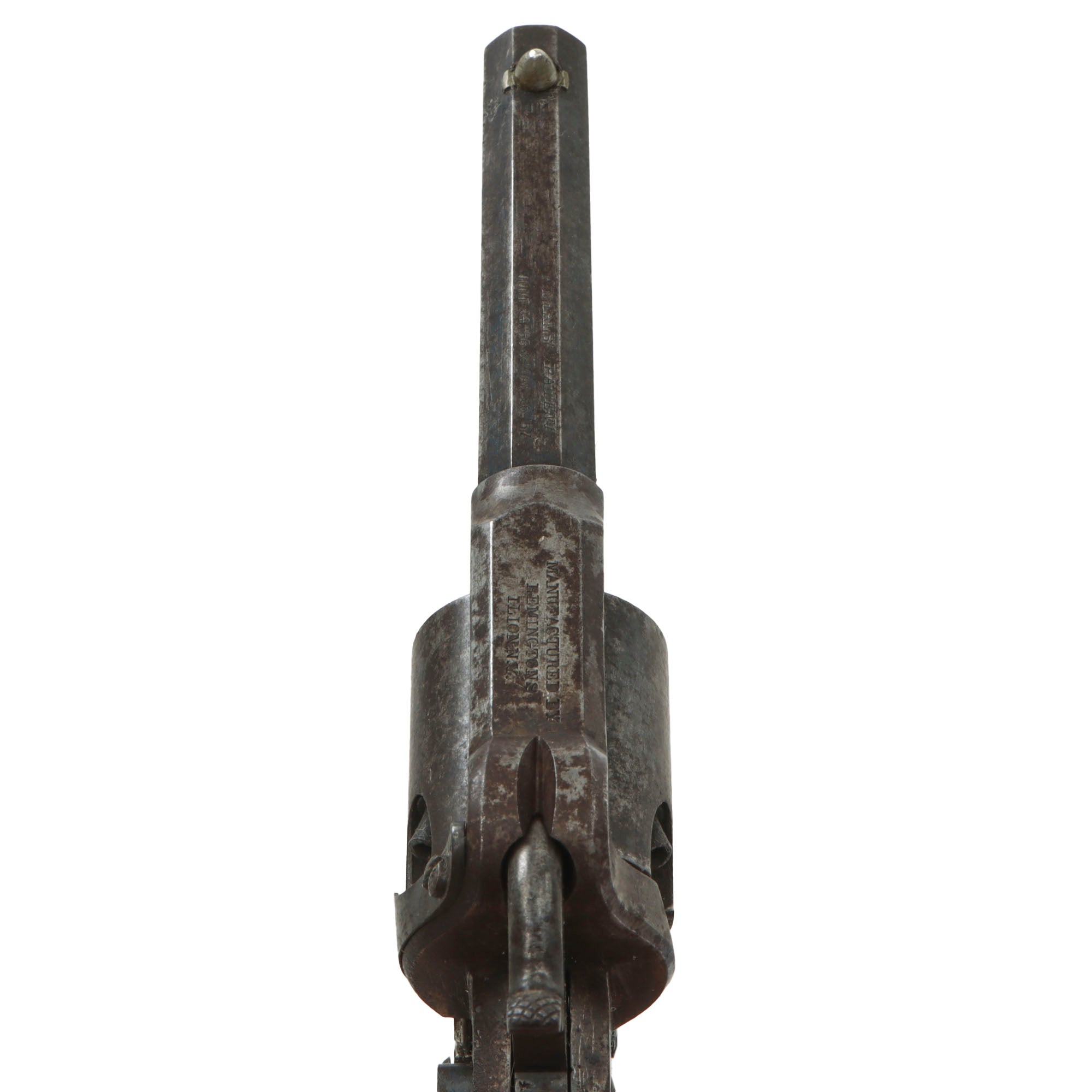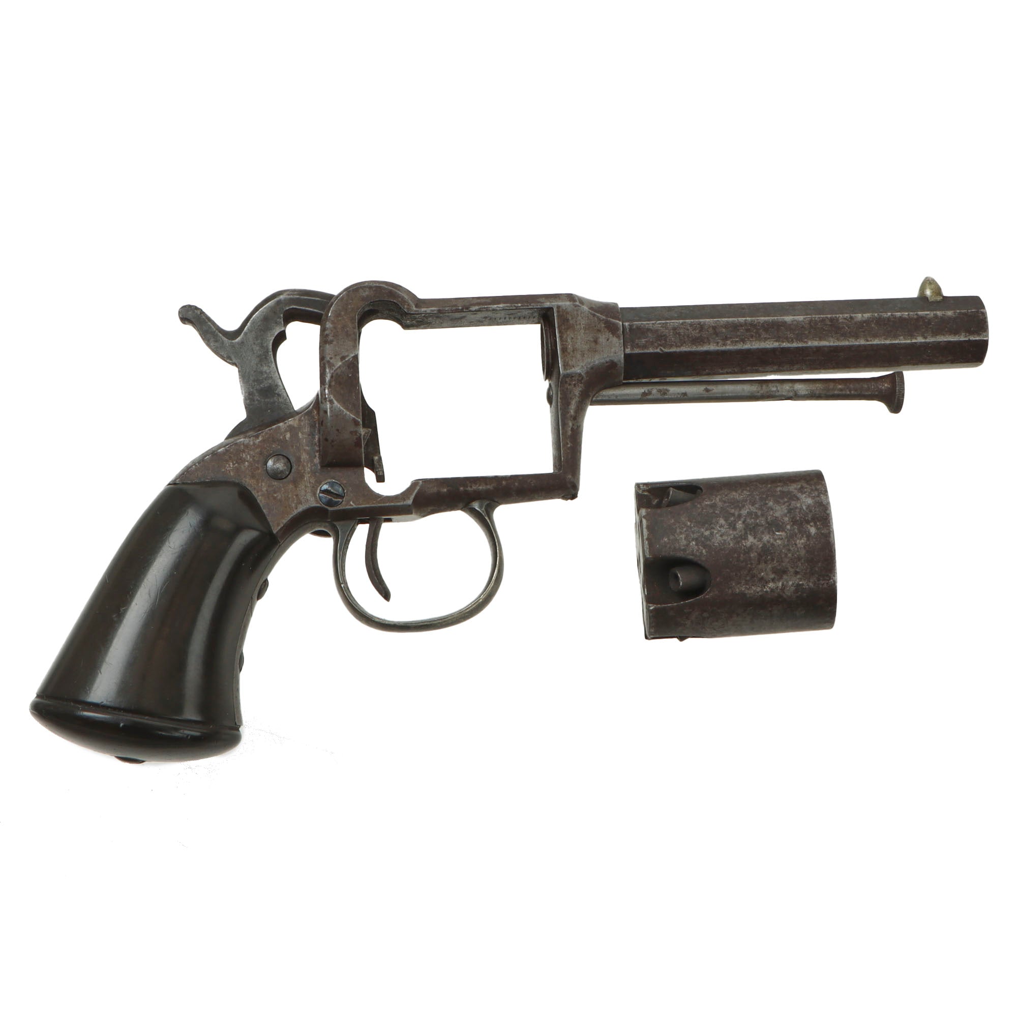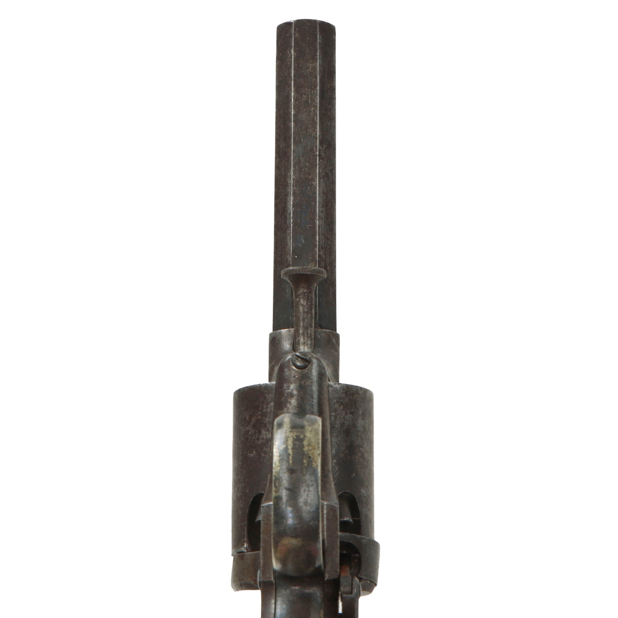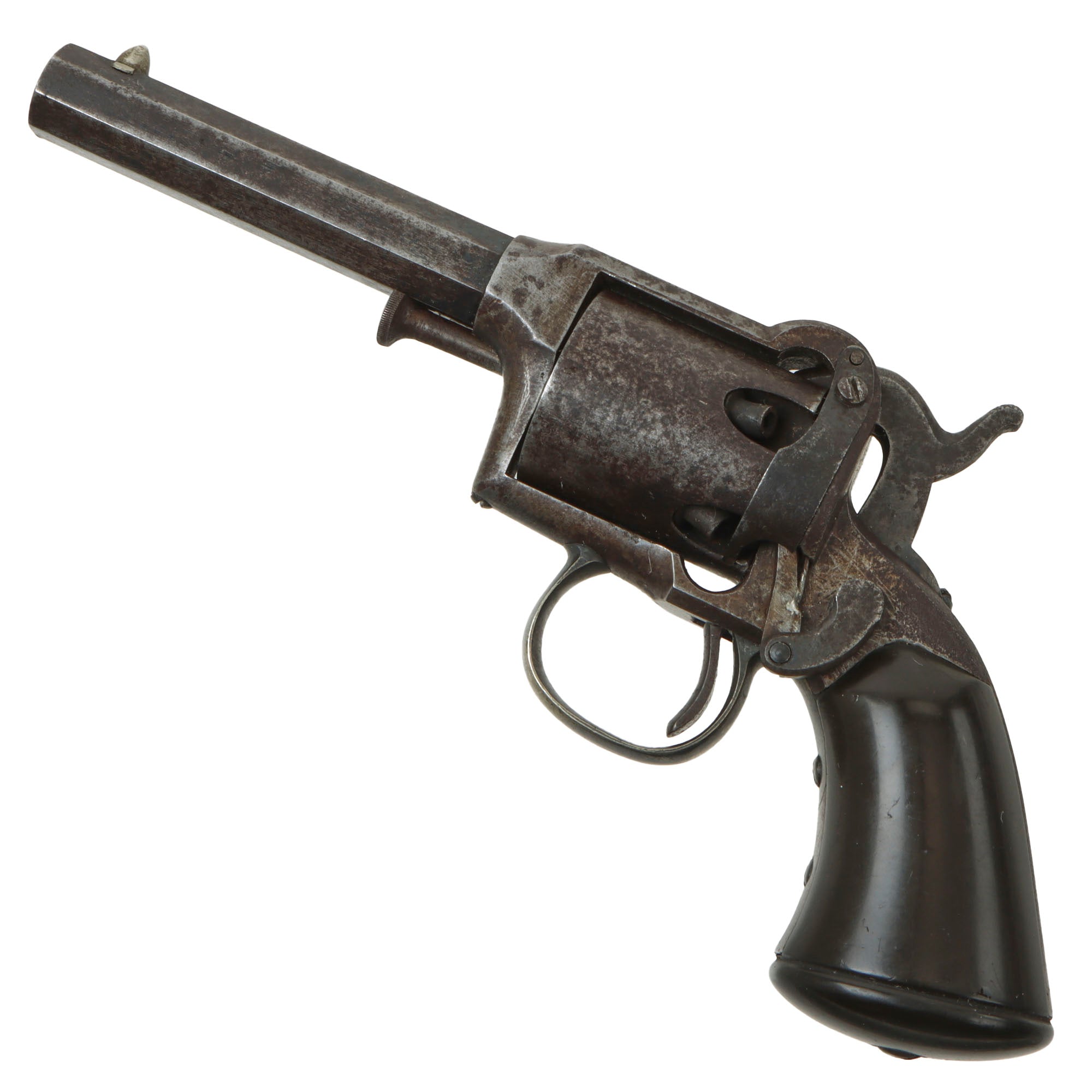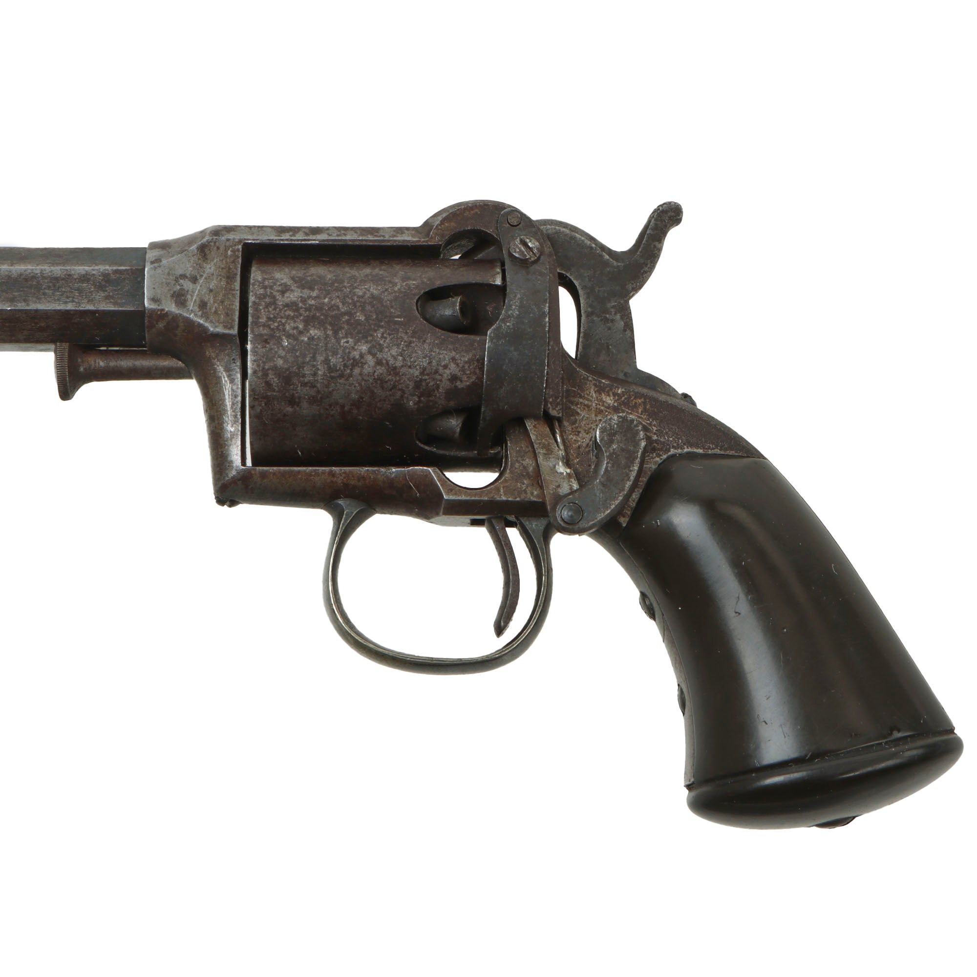 It was a spur trigger, .31-caliber, 5-shot percussion revolver, with 3" octagonal barrel and squared rubber grip. Approximately 1,000 were manufactured between 1858 and 1860.