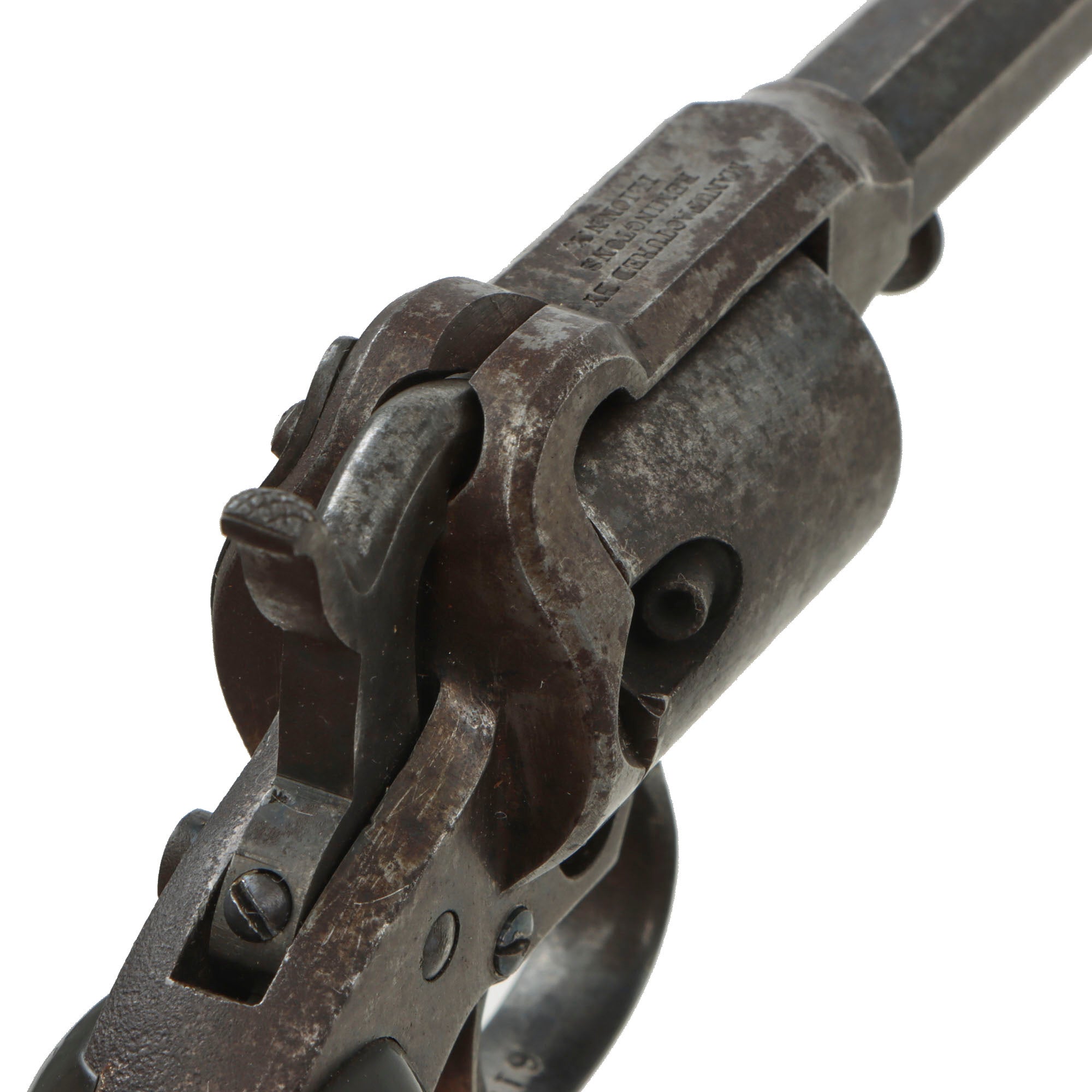Later in 1857 the 1st Model Remington-Beals Pocket Revolvers appeared on the market, and that is exactly what we have here, the first time that we have been able to offer one of these hard to find early percussion revolver designs. It is definitely quite small, and lacks some features that other examples from the period had, such as the loading rammer. The action also is partly outside of the frame on the left side, something which would be rectified later. The revolver has a lovely patina of age, showing some peppering but no major oxidation, and is marked on the bottom of the gutta percha grip and barrel with serial number 615. The top strap of the frame still has the maker information fully intact:-