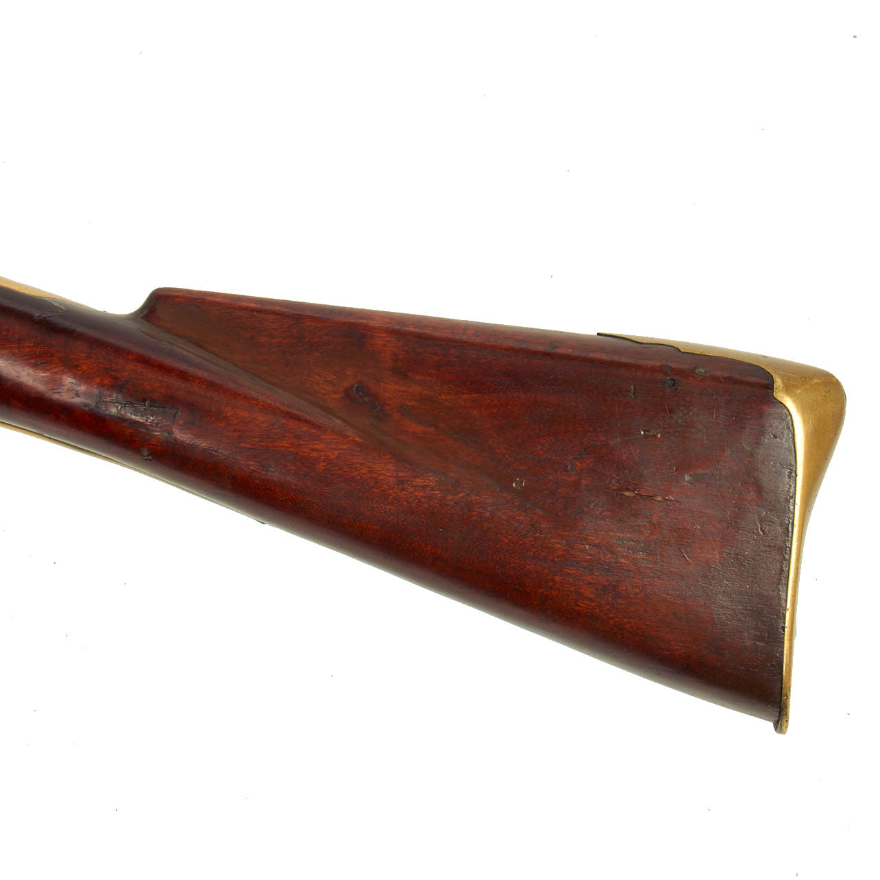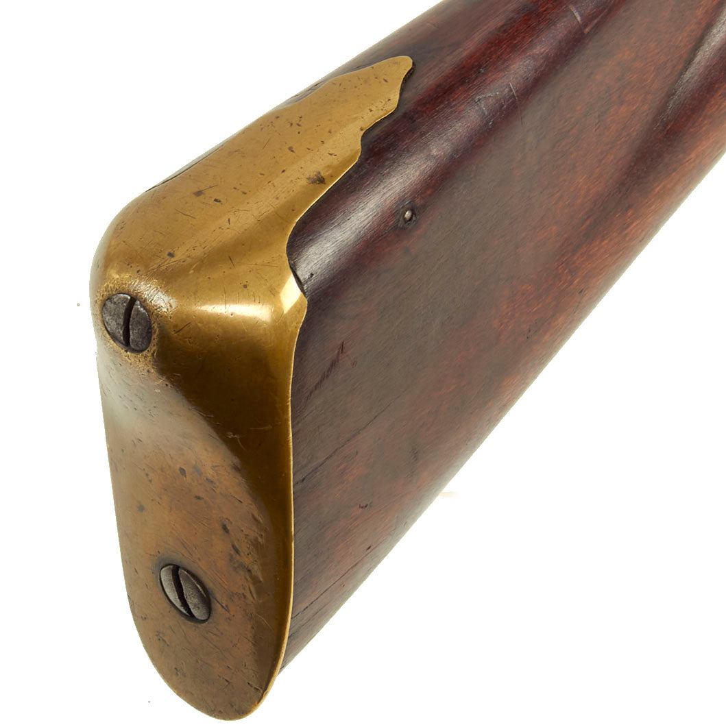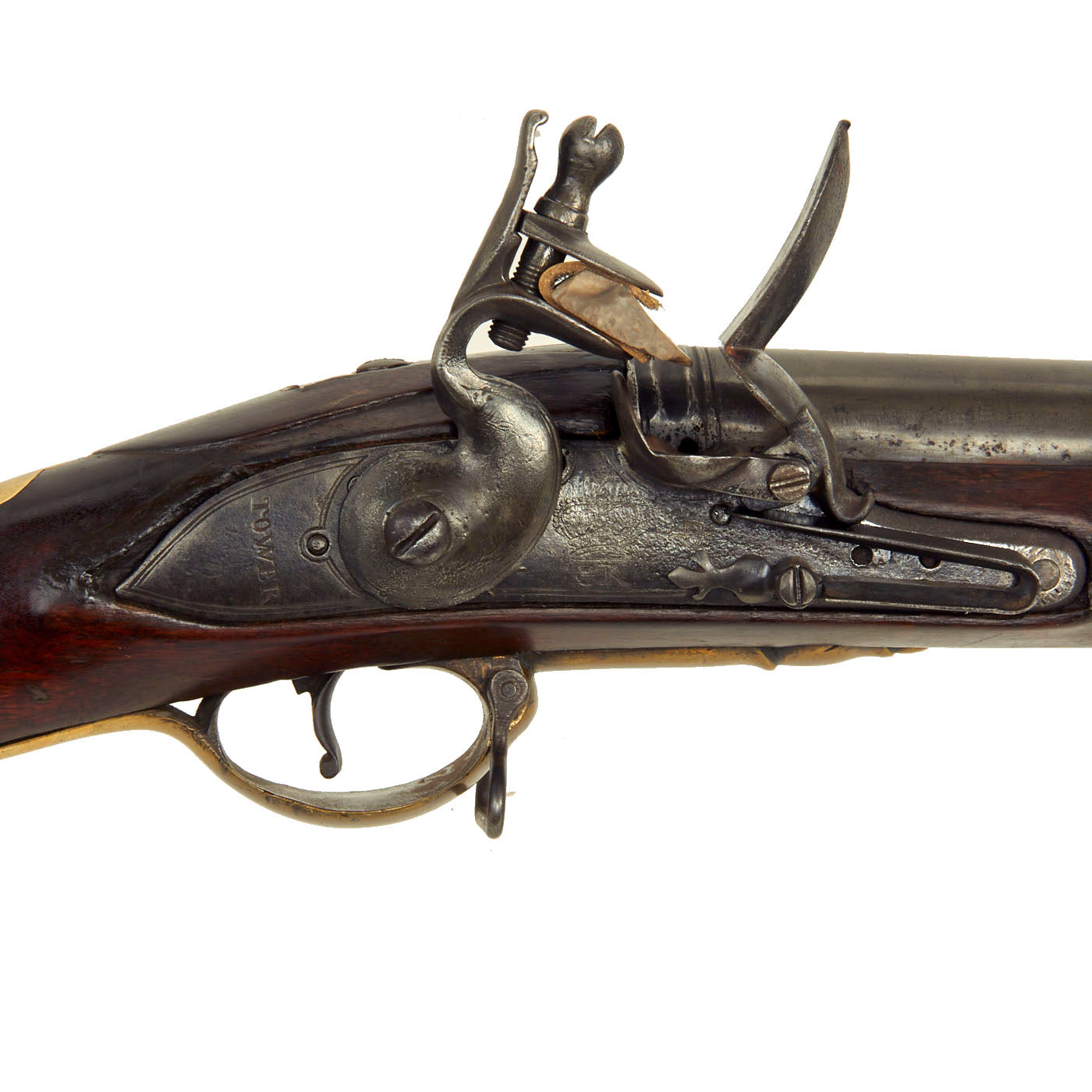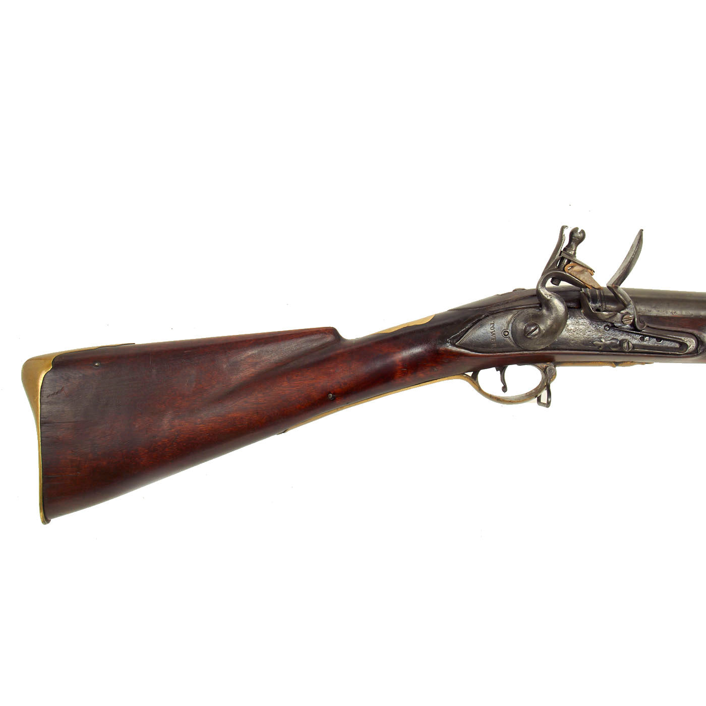 This example has a lovely walnut stock, which still retains the "bannister rail" butt stock, a feature that was basically done away with after 1807. The musket has a full 42" regulation length, .75" smoothbore iron barrel, which bears British Proof Marks, which are still mostly clear. They include the British CROWN / GR / Broad Arrow and a partial CROWN / CROSSED SCEPTERS, indicating Pre-1813 military inspection at the Ordnance Proof house on Tower Wharf close to the Tower of London. The stock is fitted with the correct FOUR ramrod pipes and correct all brass mounts. The barrel marked on the top with 22'ND REG'T of F'T, for issue to the 22nd Regiment of Foot.