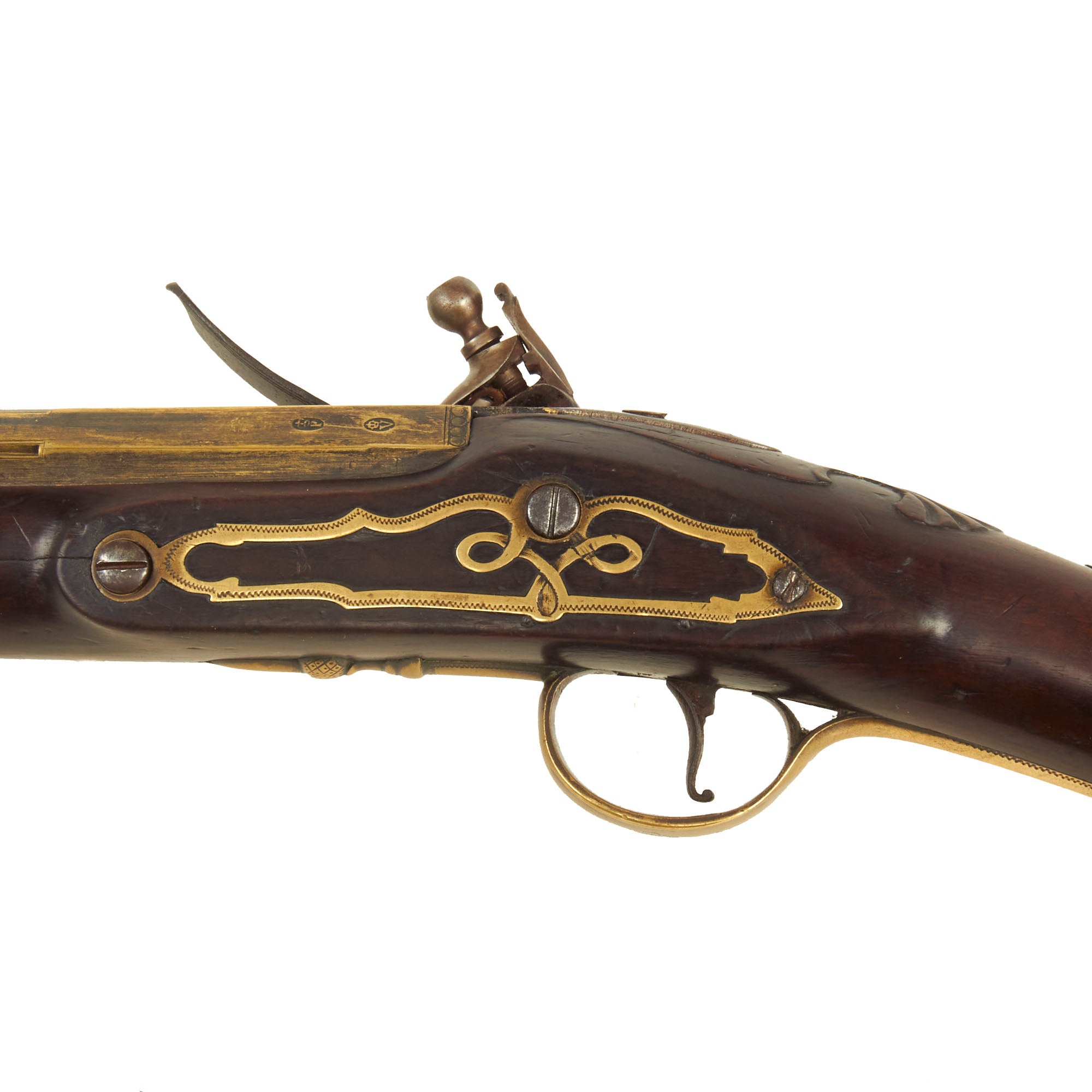 Thi blunderbuss was probably made around 1770, and the brass barrel and fittings suggest naval use, however we cannot find any naval markings on the gun. Measuring 30 3/4" in overall length with a sturdy 15 1/4" Brass Cannon style barrel, these were originally intended for self defense but soon adopted by all the Coaching lines in England and the Continent as easy to handle and very effective to deter wrong doers. The fittings are lovely, with an open brass side plate with line engraving and a lovely "knot" design, and the trigger guard is lovely as well, showing an "acorn" finial on the front. The brass butt plate is well engraved, and there is also a lovely brass escutcheon on the back of the wrist.