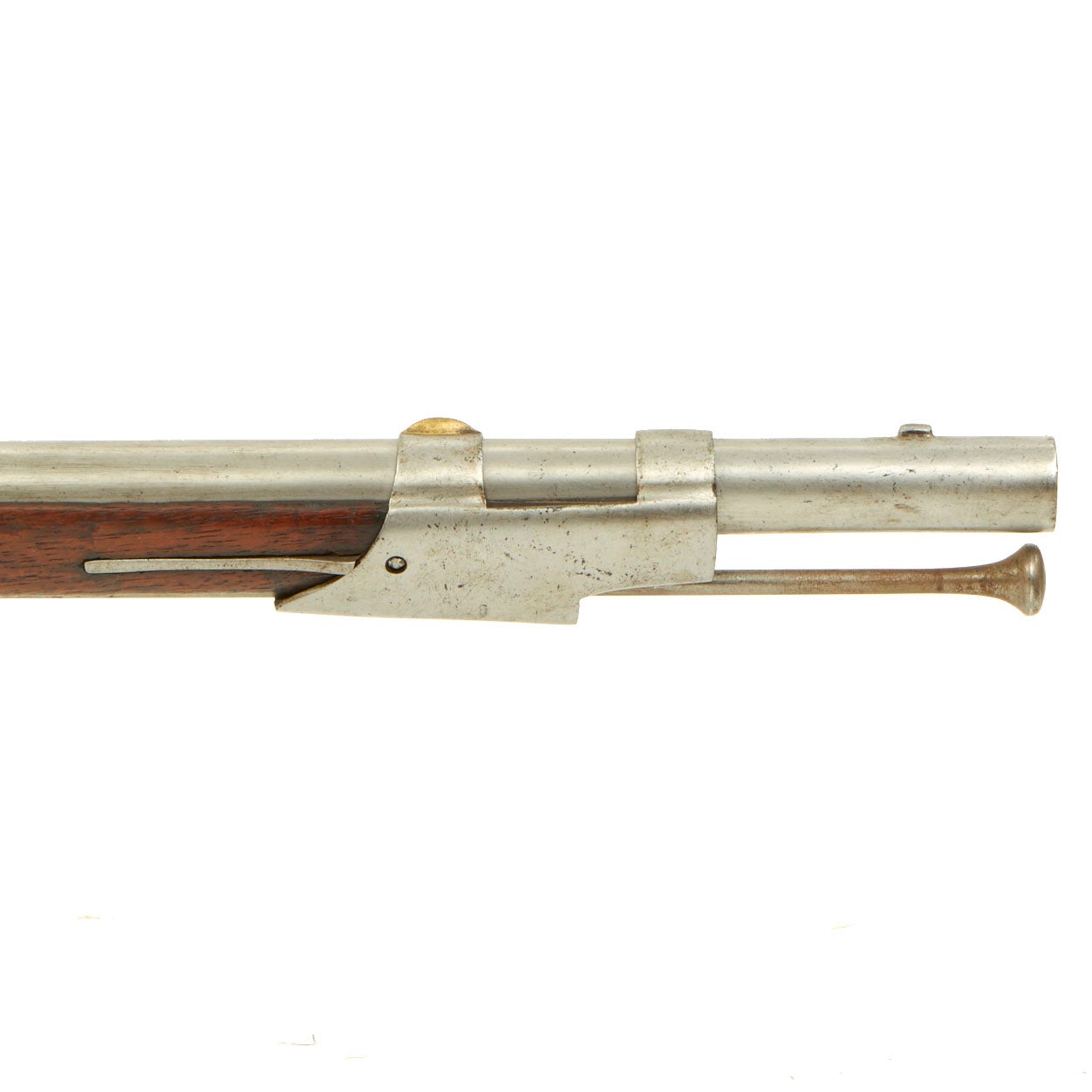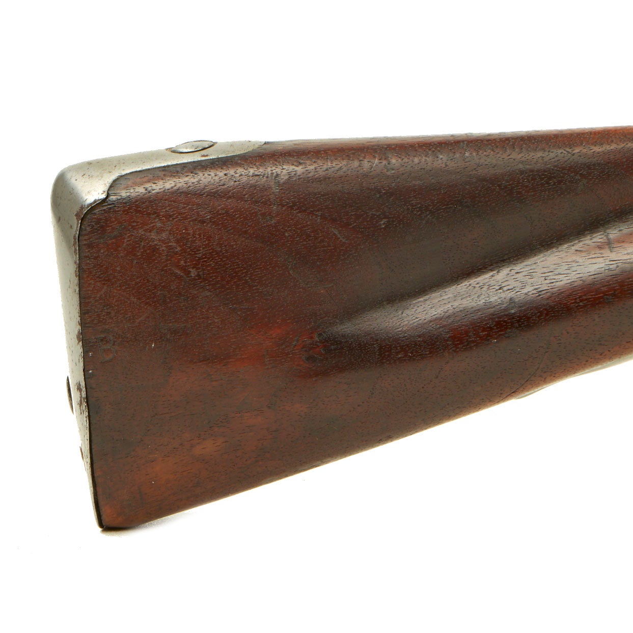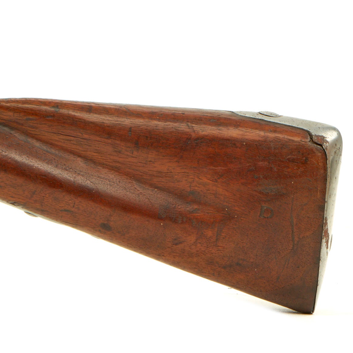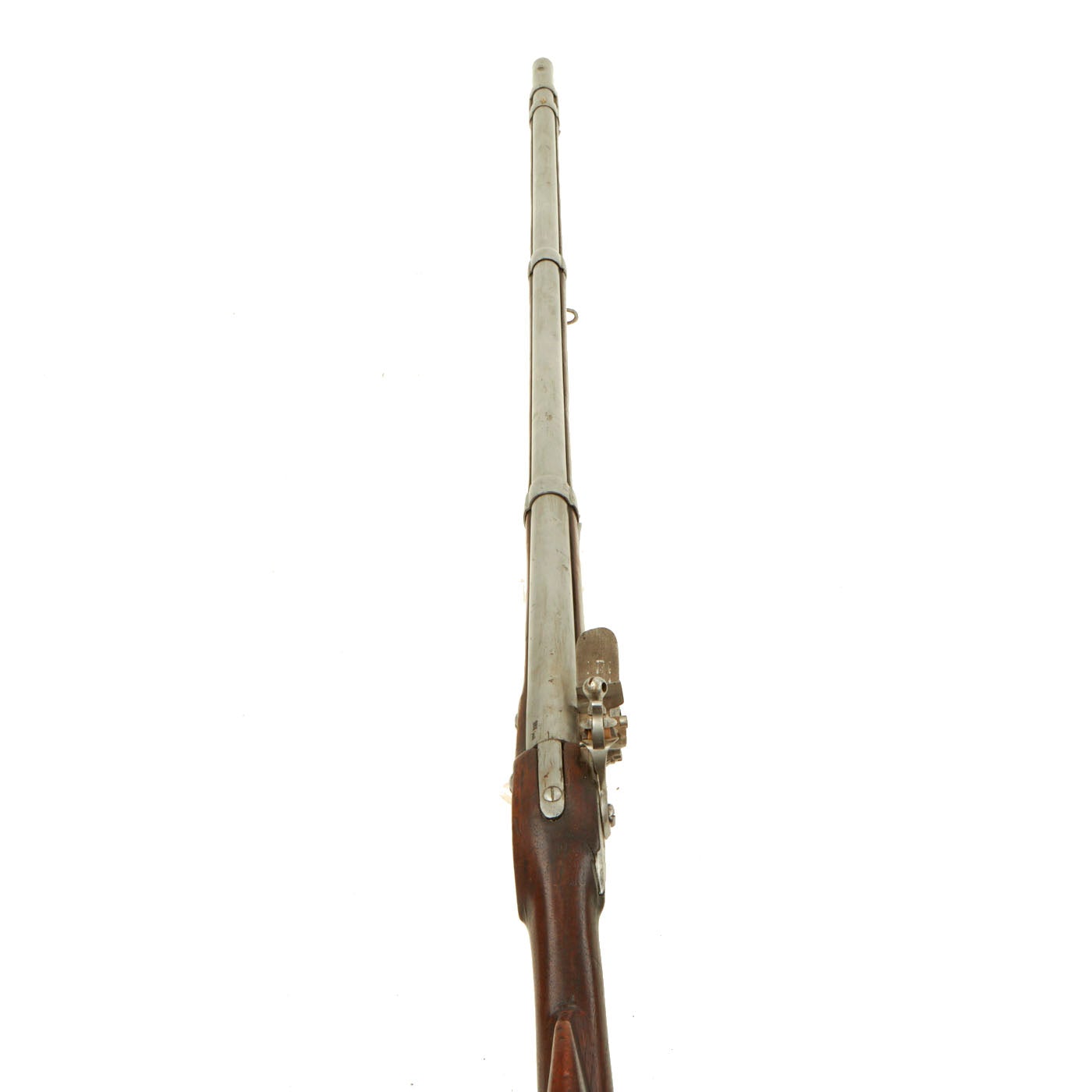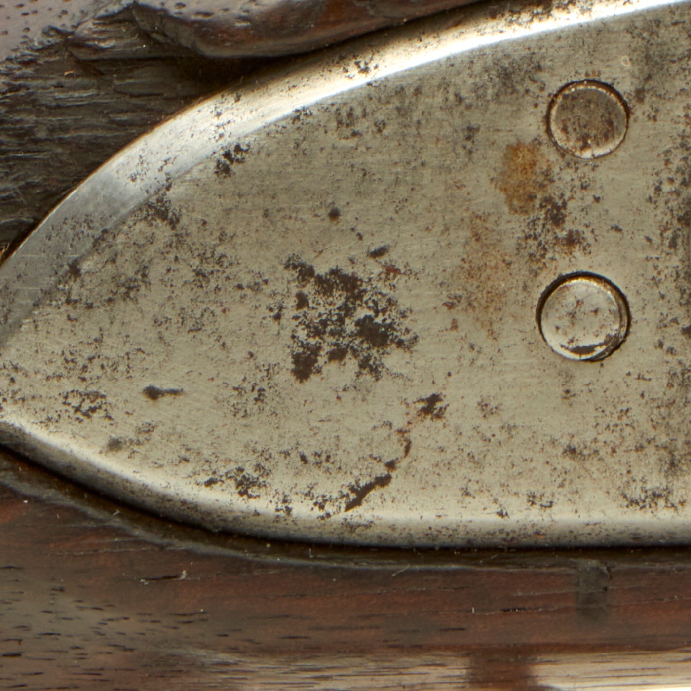 Differing from the Brown Bess not only using all steel mounts the barrel is secured by three-barrel bands and not pins. Very good used overall condition this musket comes with a later model "button top" style ramrod. The stock has very little in the way of damage or repairs, and has a lovely red brown color. The metalwork is still polished bright steel, as originally issued, though there is some staining and wear from years of cleaning. The lock is functional, but the tumbler is a bit worn, so a strong trigger pull can cause it to fire at half cock.