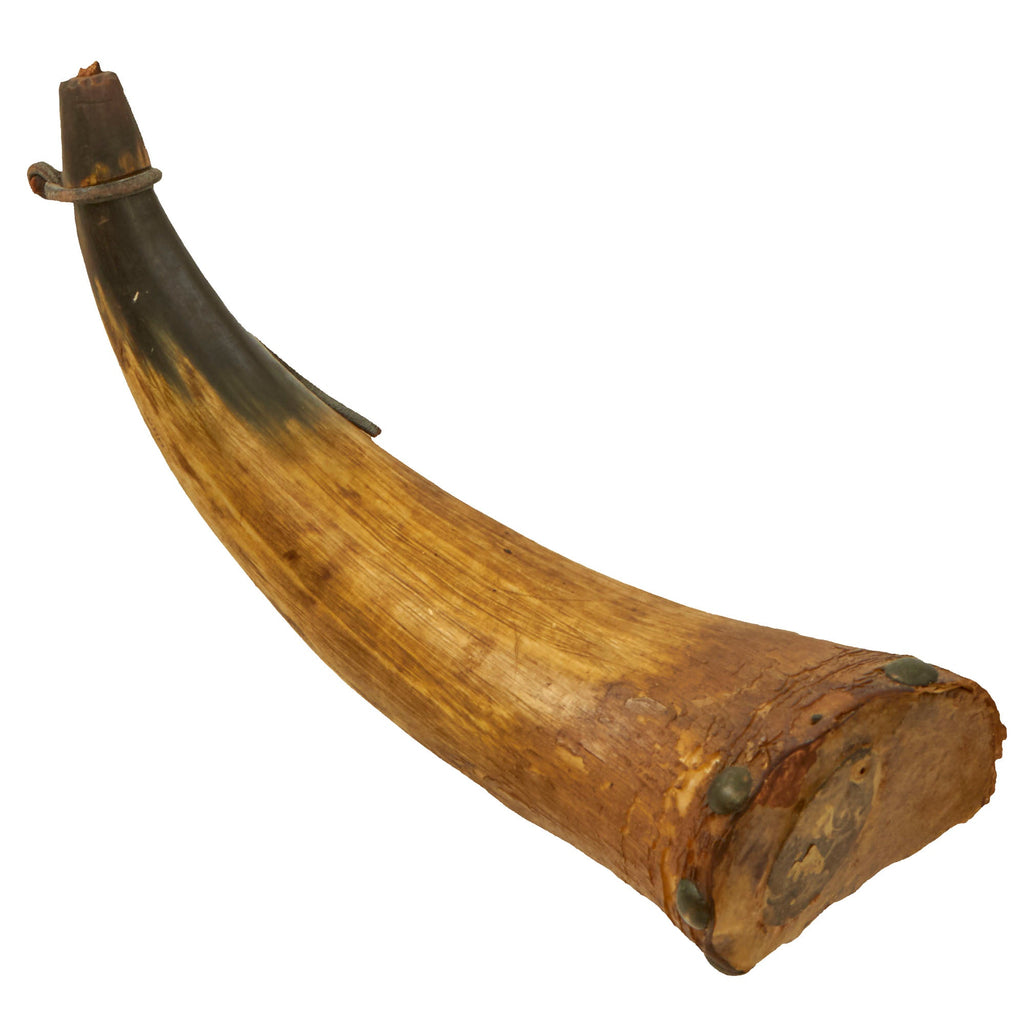 Original Item. Only One Available. This is a gorgeous example of an Early American powder horn with a retained wooden plug and riveted construction. Part of the original leather carrying strap is still attached to the throat. The bottom of the horn has 8 tacks holding the butt in, with lovely stars engraved around them. There is a strange 19th century tag reading 24 on the butt, and appears to have been sealed with something.The throat retains a long and thin plug, and there is actually a bit of powder still in the horn. Given how difficult it is to remove the plug, we believe it’s possible the powder could be period, but we have no way of knowing for sure. The horn measures 9¼” long.A very nice horn from Early America. Ready for further research and display.