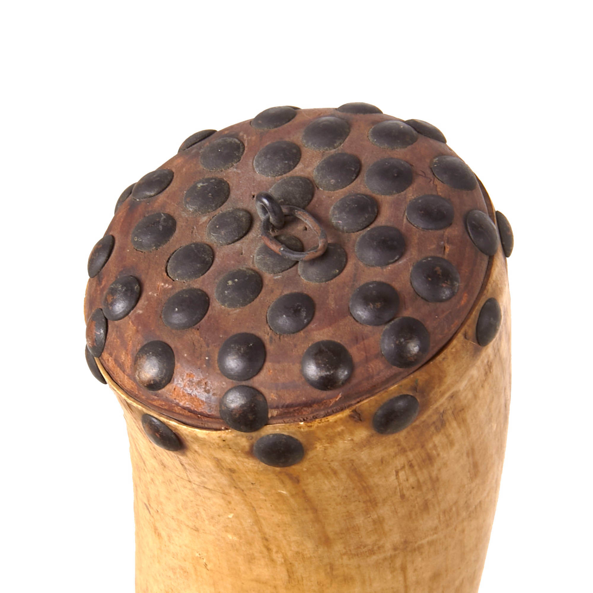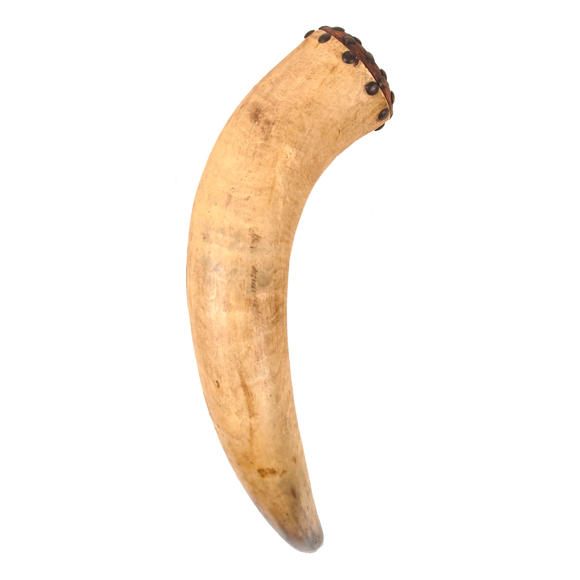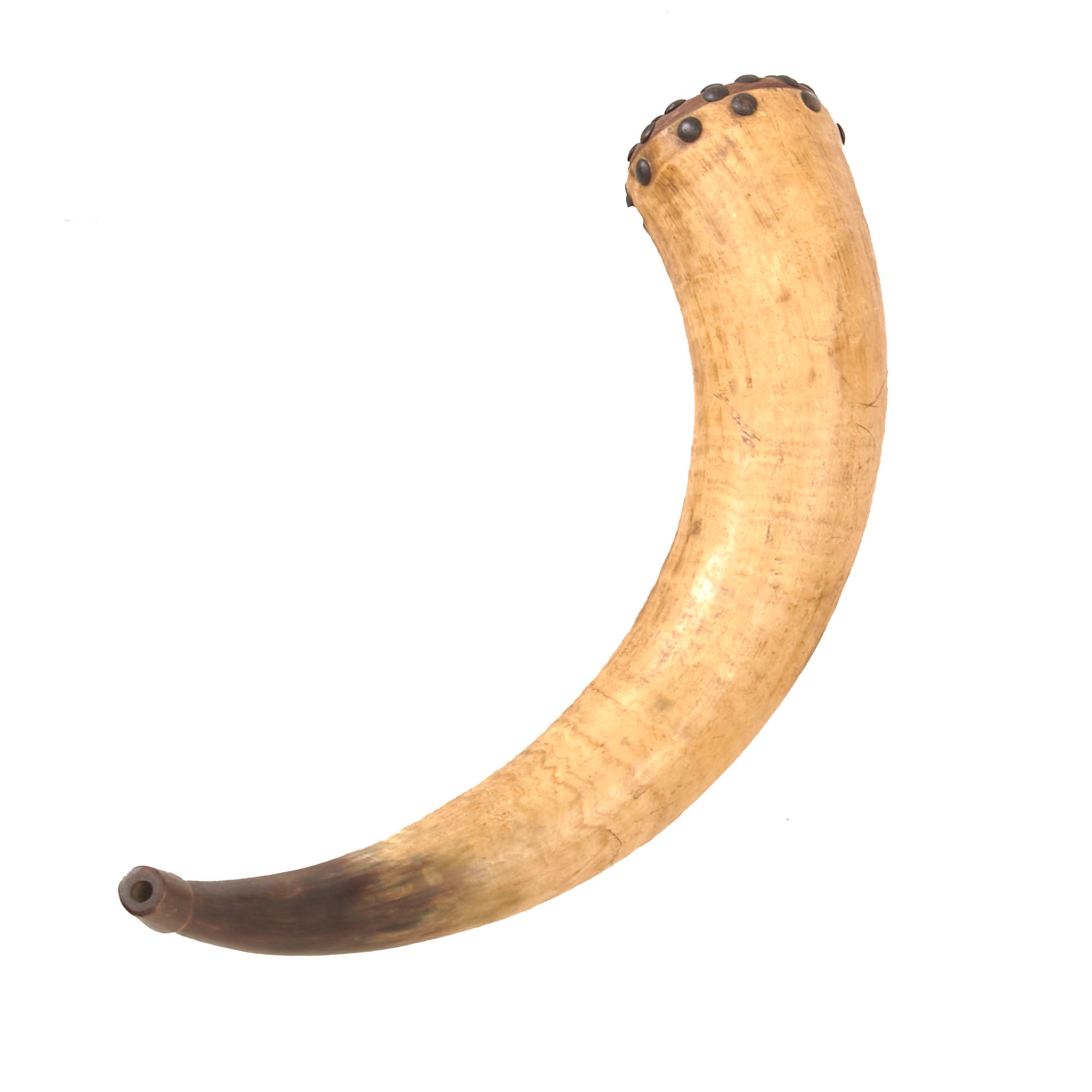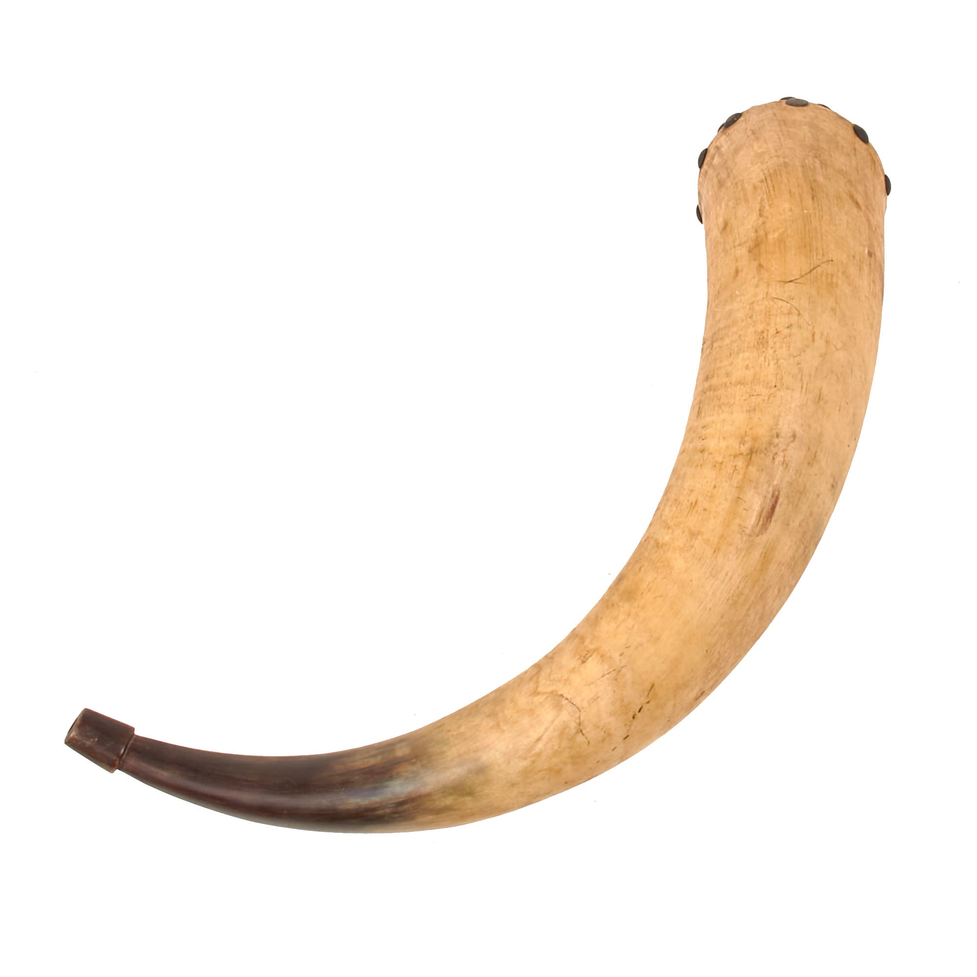 Original Item. Only One Available. This is a gorgeous example of an Early American powder horn with lovely tack construction as well as a retained suspension ring. The trim of the horn is affixed with 10 tacks holding the wooden bottom in place, and an additional 40 tacks in the wood itself. The horn measures roughly 13” long.