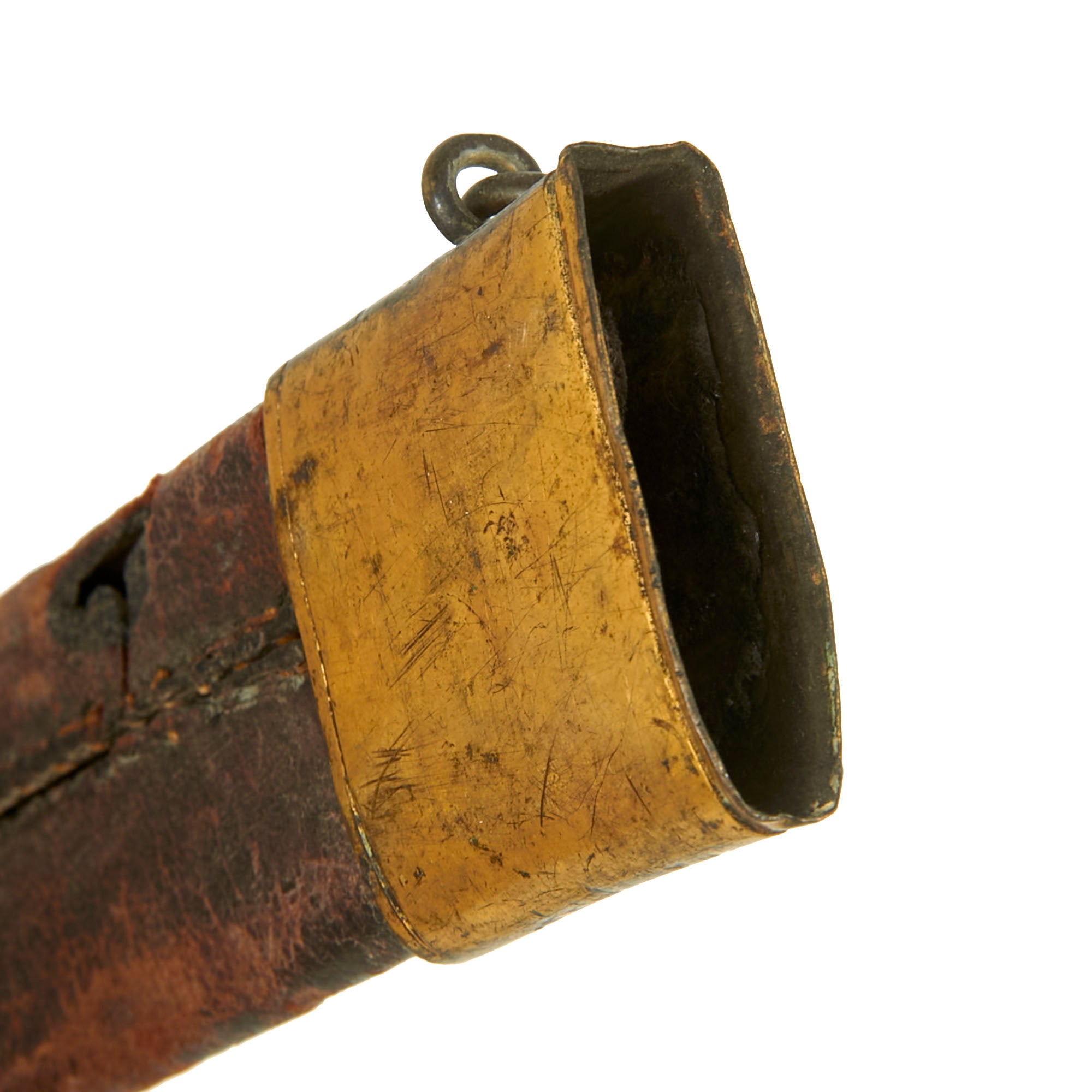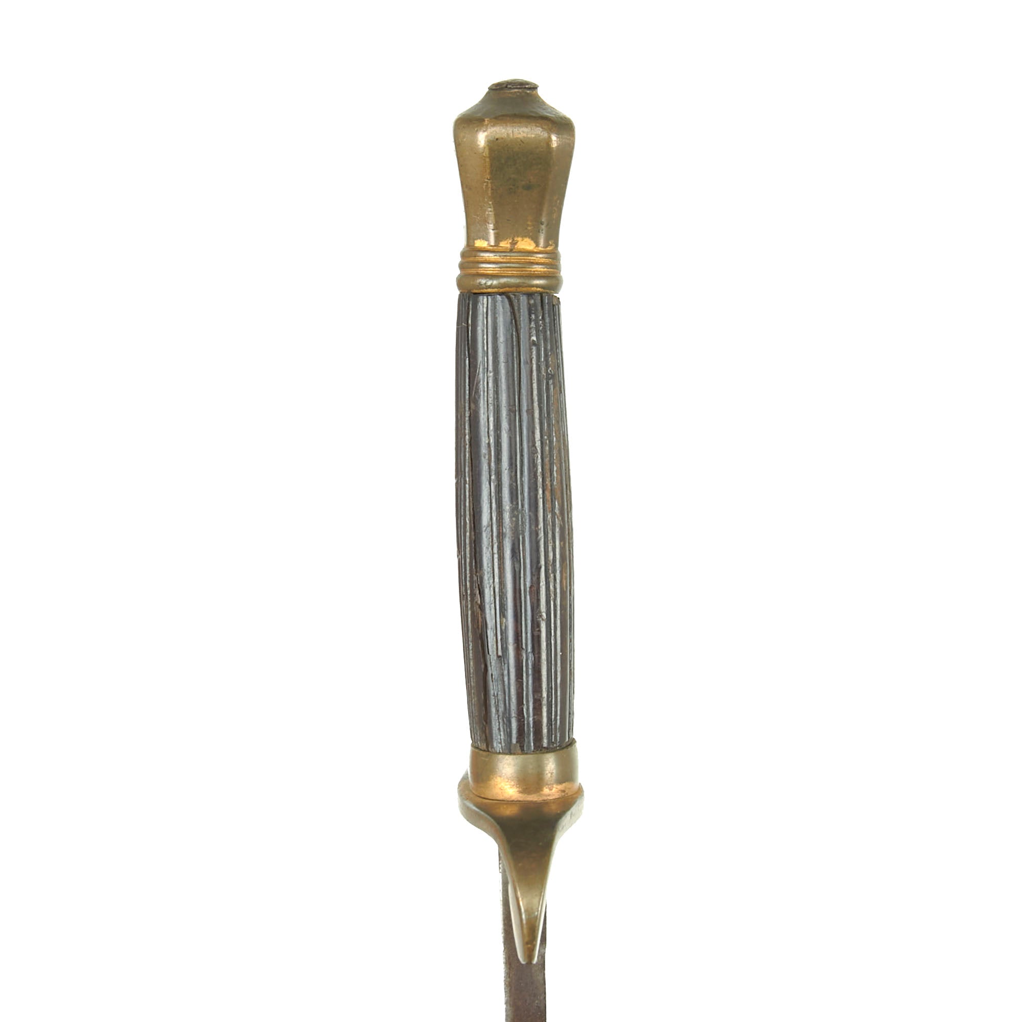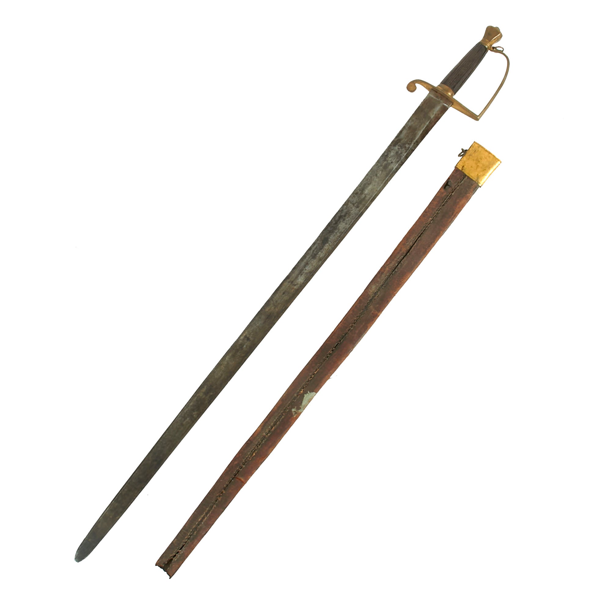 The original partial leather scabbard measures 25⅜”, and retains its gilded brass throat. The throat is crudely etched with the name S. Parsons EPE, but we couldn’t find much with this information, making for a great research project. The leather of the scabbard is heavily crazed and the stitching on the reverse is mostly gone with only a bit intact. Regardless, this scabbard is in fair display condition and complements the sword very well. To find any sword from this period with its original scabbard is next-to-impossible.