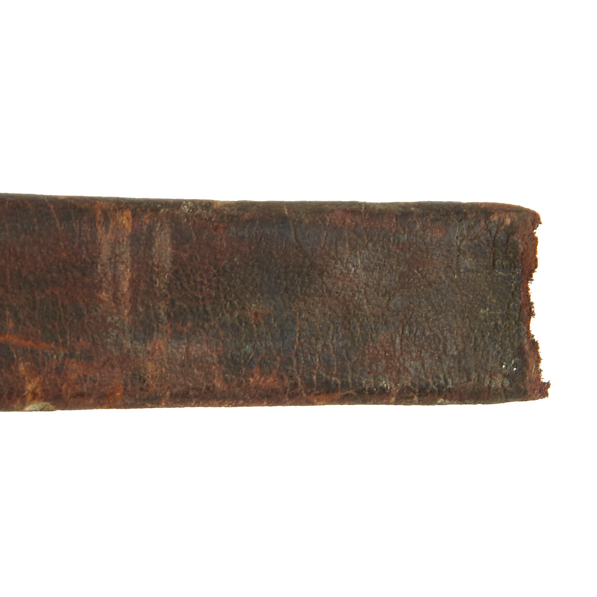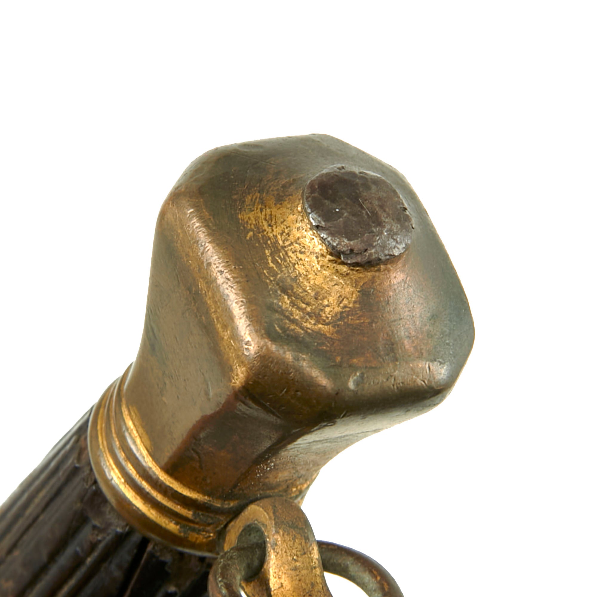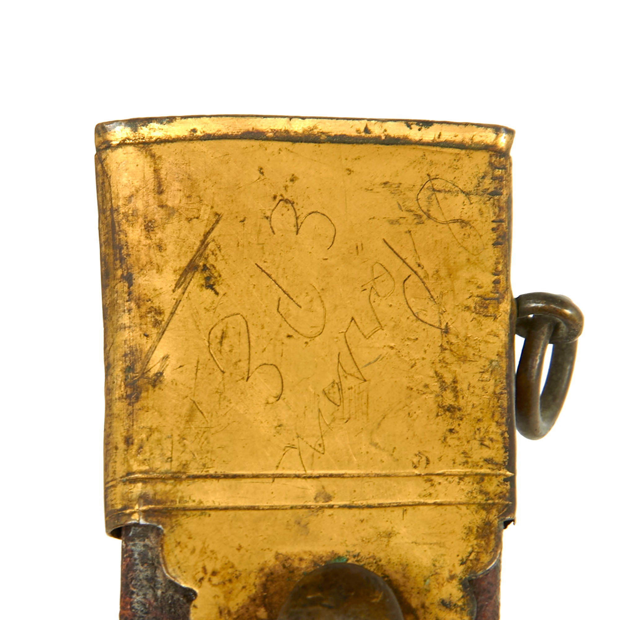 The original partial leather scabbard measures 25⅜”, and retains its gilded brass throat. The throat is crudely etched with the name S. Parsons EPE, but we couldn’t find much with this information, making for a great research project. The leather of the scabbard is heavily crazed and the stitching on the reverse is mostly gone with only a bit intact. Regardless, this scabbard is in fair display condition and complements the sword very well. To find any sword from this period with its original scabbard is next-to-impossible.