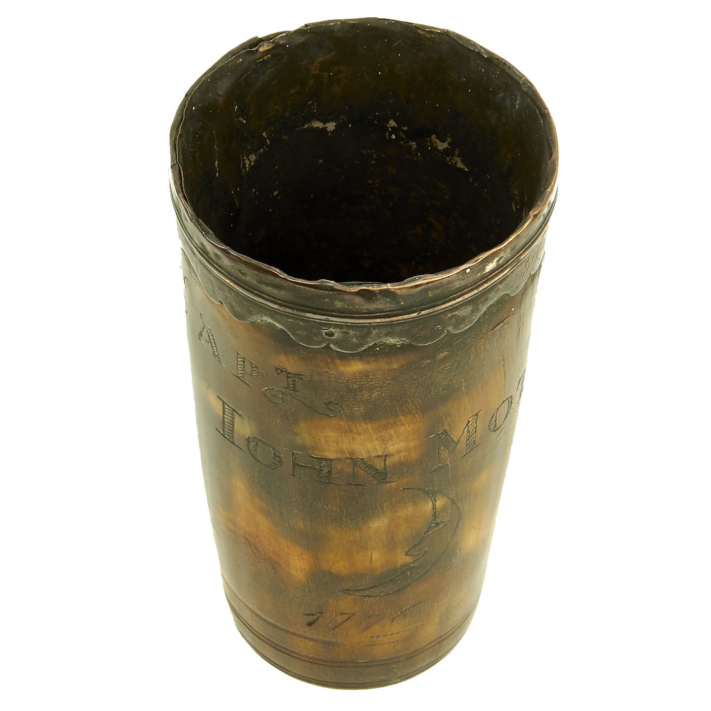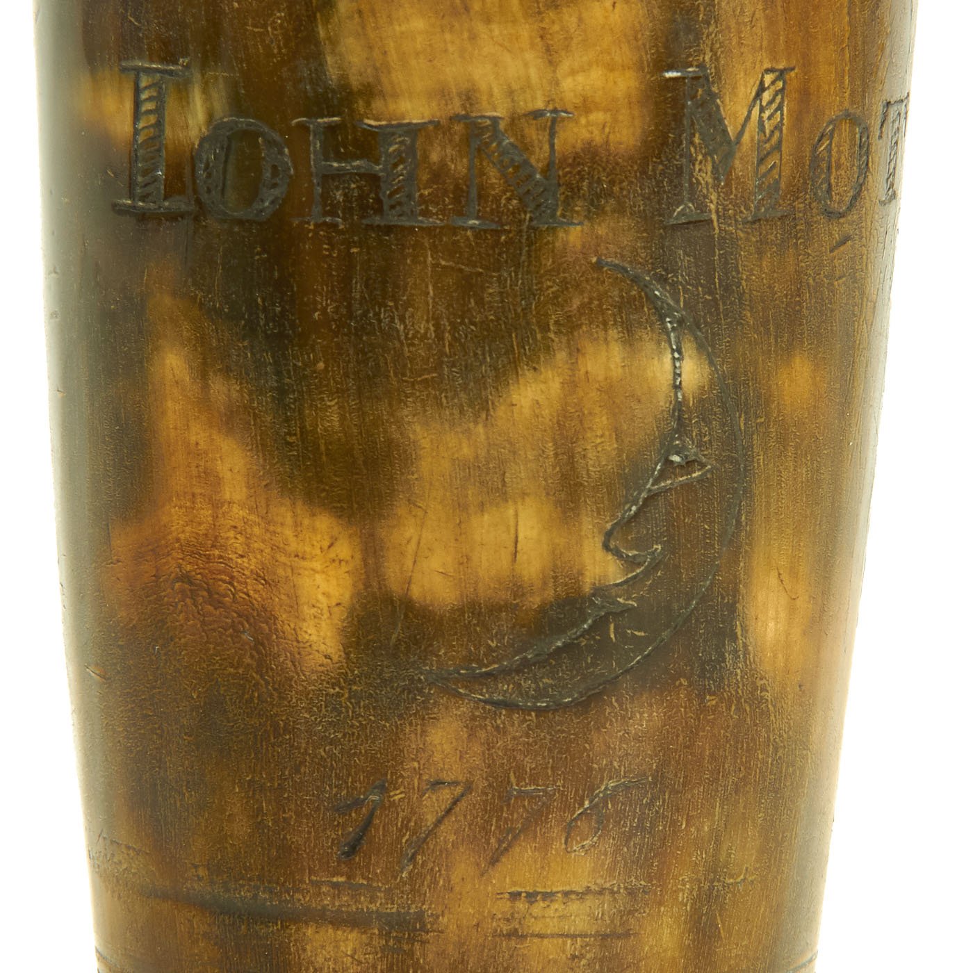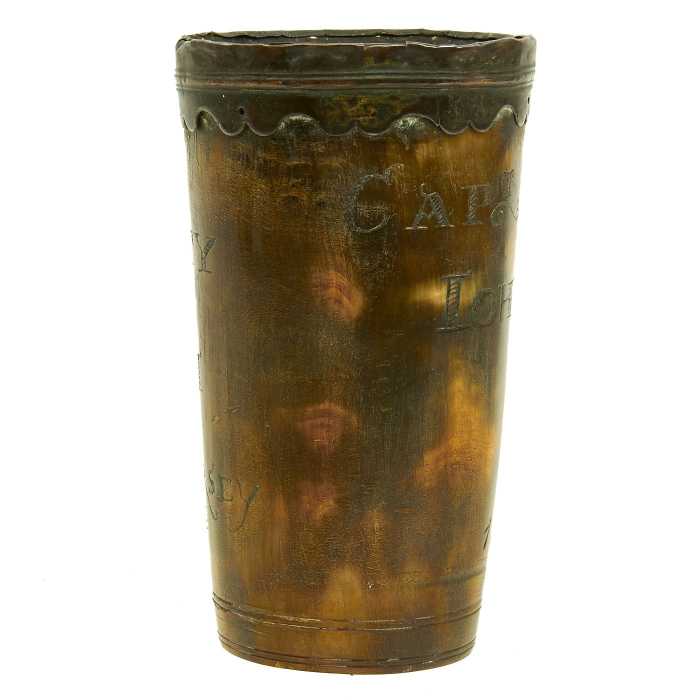 This is a very nice 18th Century Horn Beaker drinking vessel, standing just 5" tall and 3" across the drinking rim. The beaker is lined with metal, which appears to be silver, or possibly silver plated brass, with a very pleasing silver top edge around the rim. It looks somewhat like a portion of Cow Horn as in a Powder Horn but the point cut off. A lovely dark honey color that I think takes eons to mature on which has some lovely engraving in two locations on the side. The first reads: