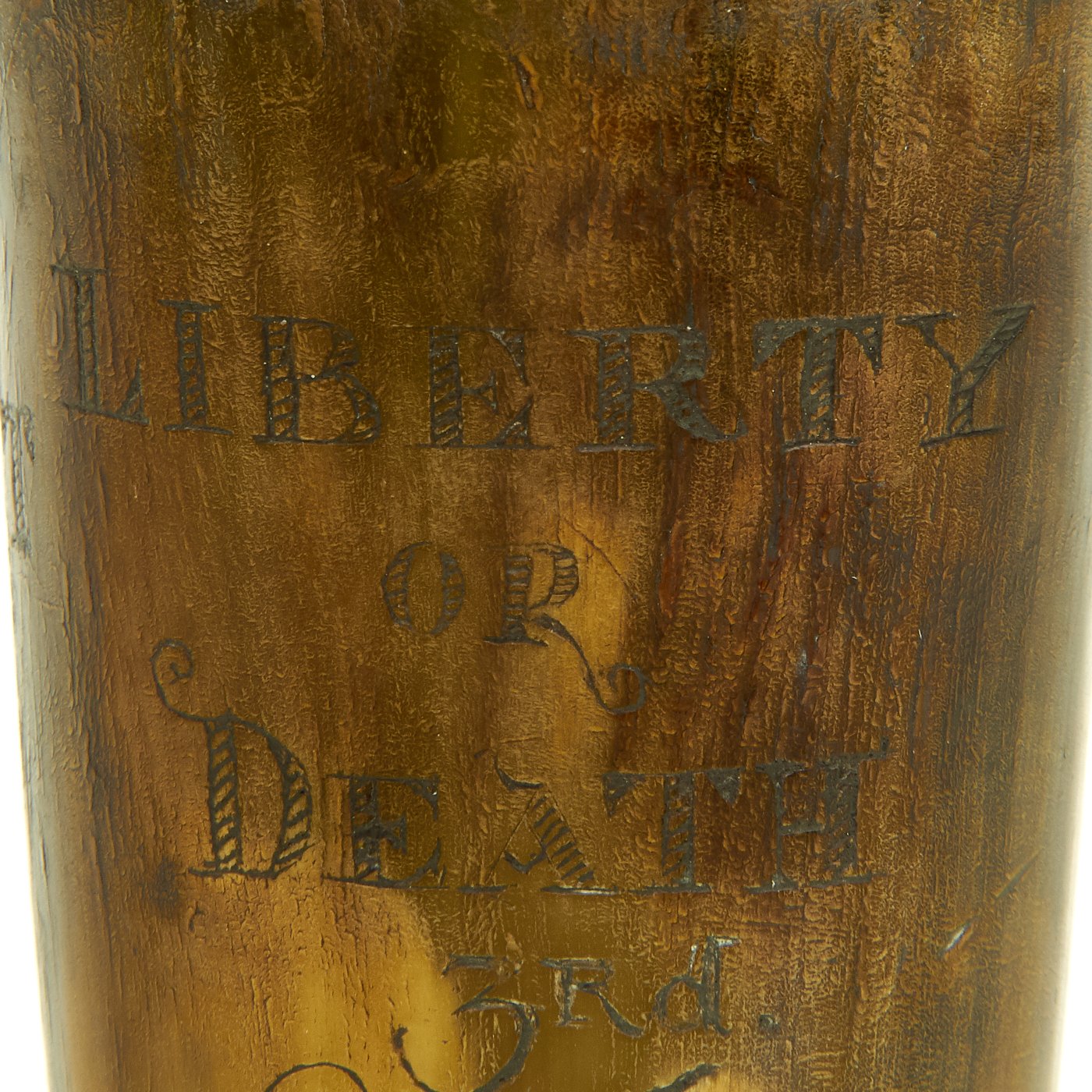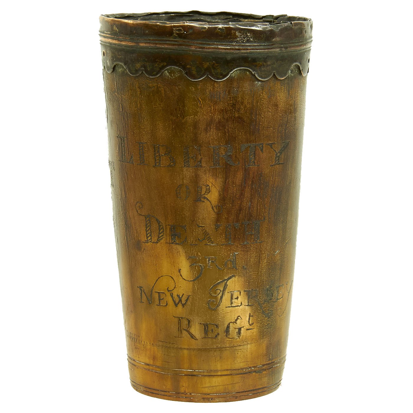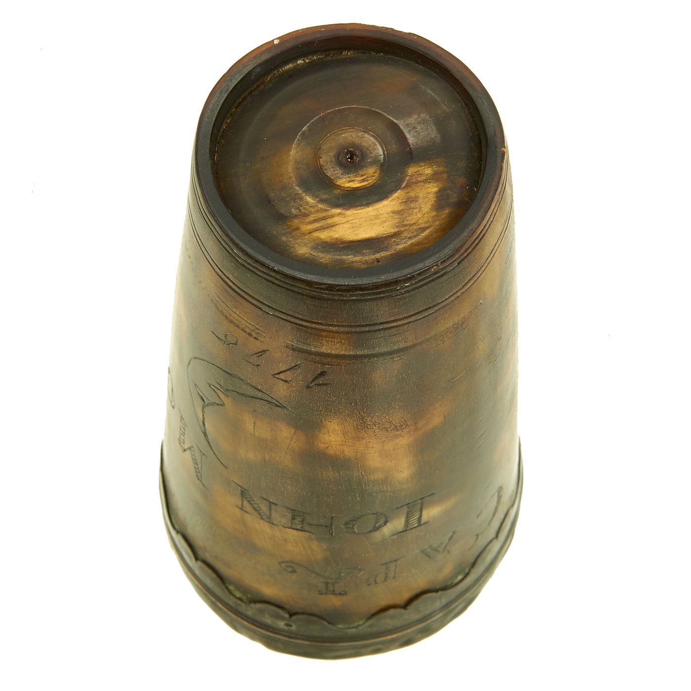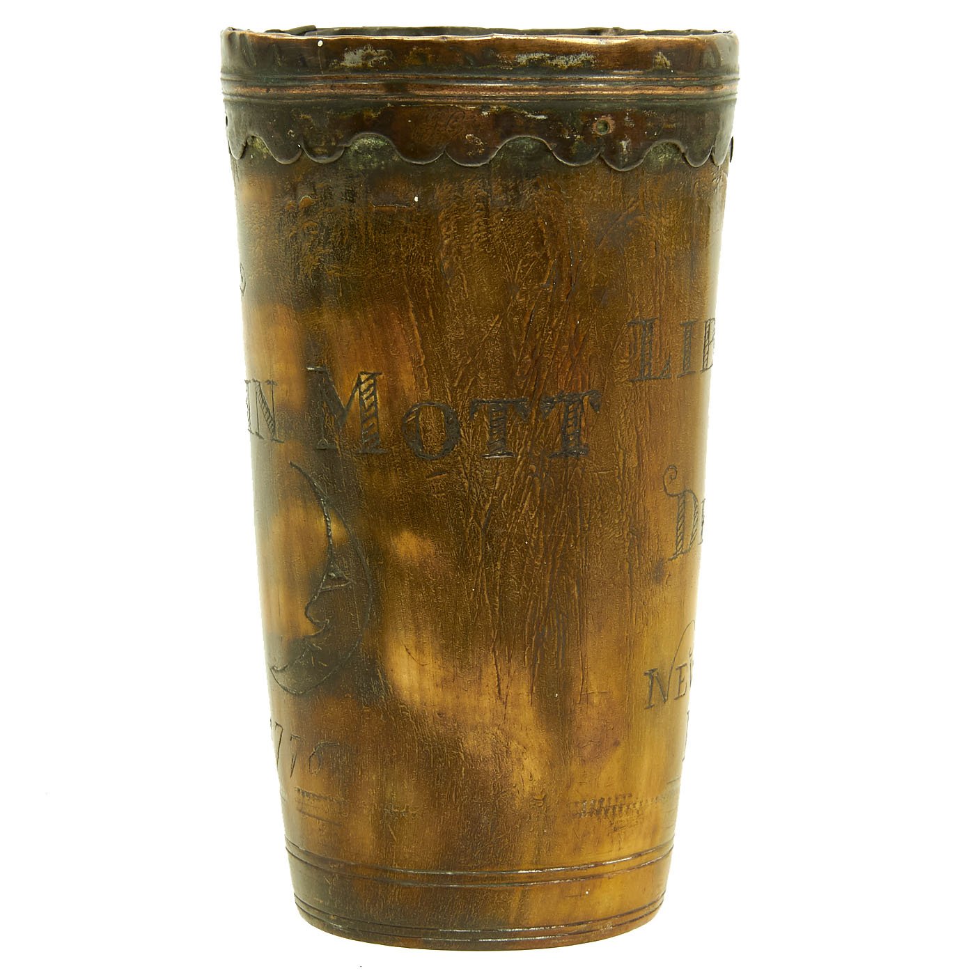 This is a very nice 18th Century Horn Beaker drinking vessel, standing just 5" tall and 3" across the drinking rim. The beaker is lined with metal, which appears to be silver, or possibly silver plated brass, with a very pleasing silver top edge around the rim. It looks somewhat like a portion of Cow Horn as in a Powder Horn but the point cut off. A lovely dark honey color that I think takes eons to mature on which has some lovely engraving in two locations on the side. The first reads: