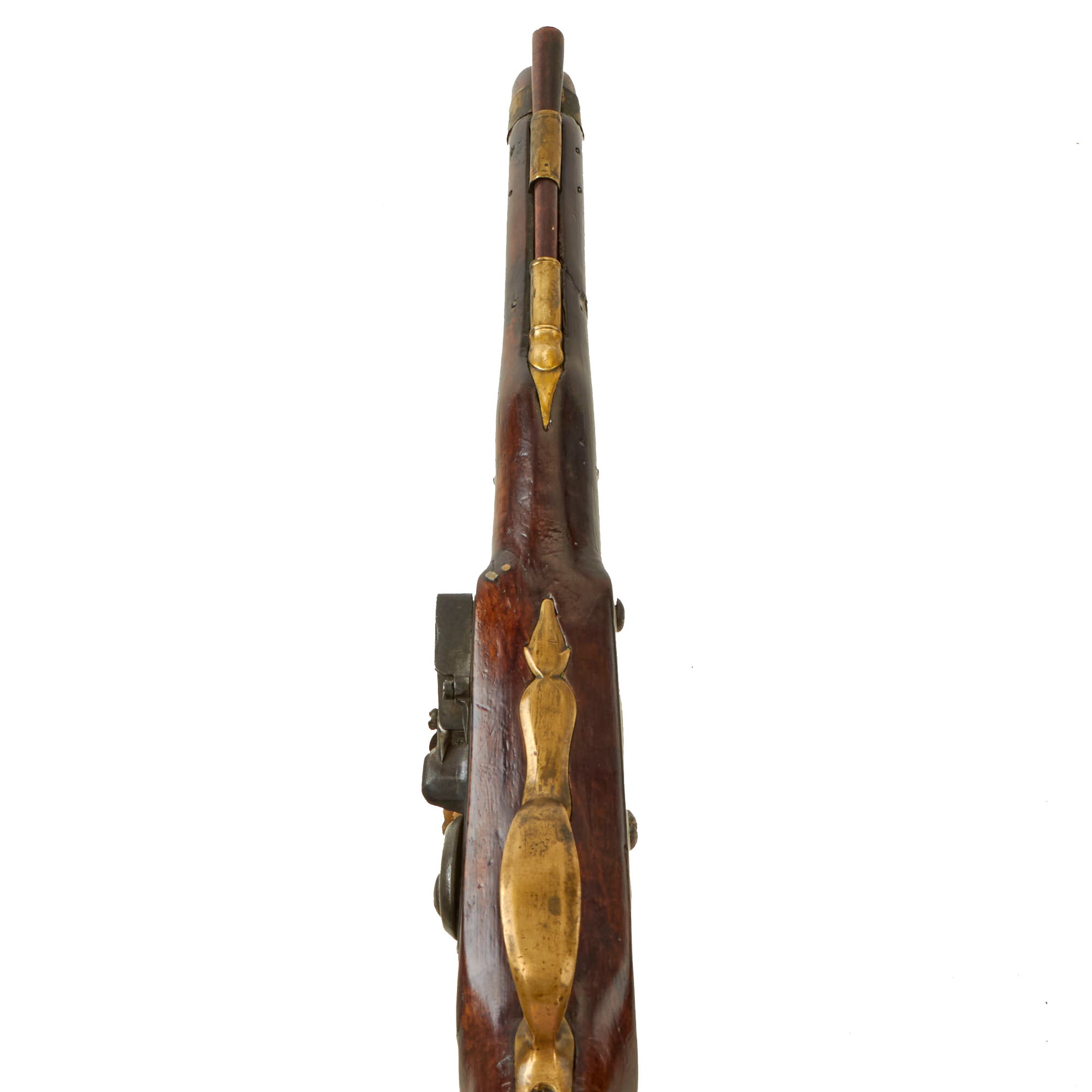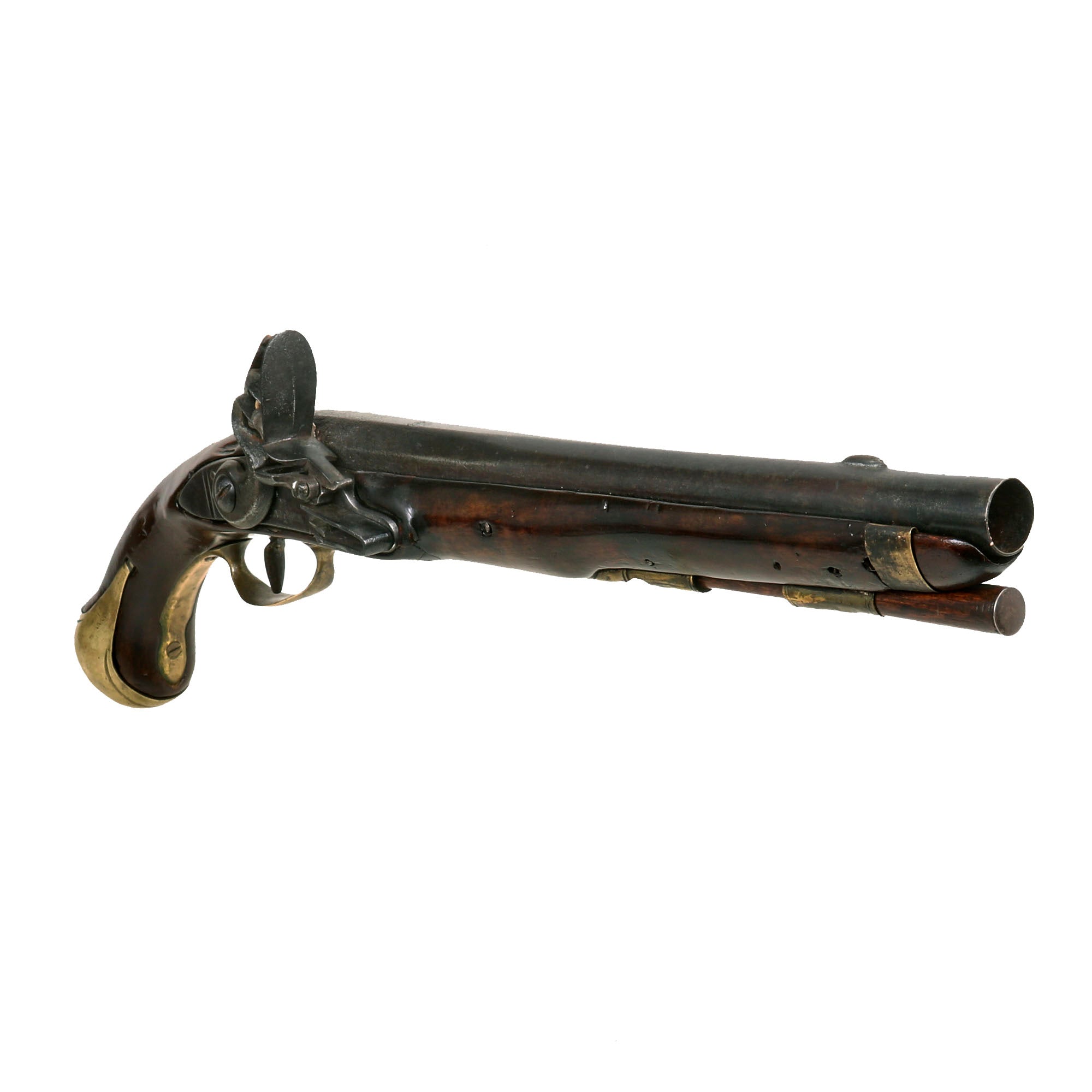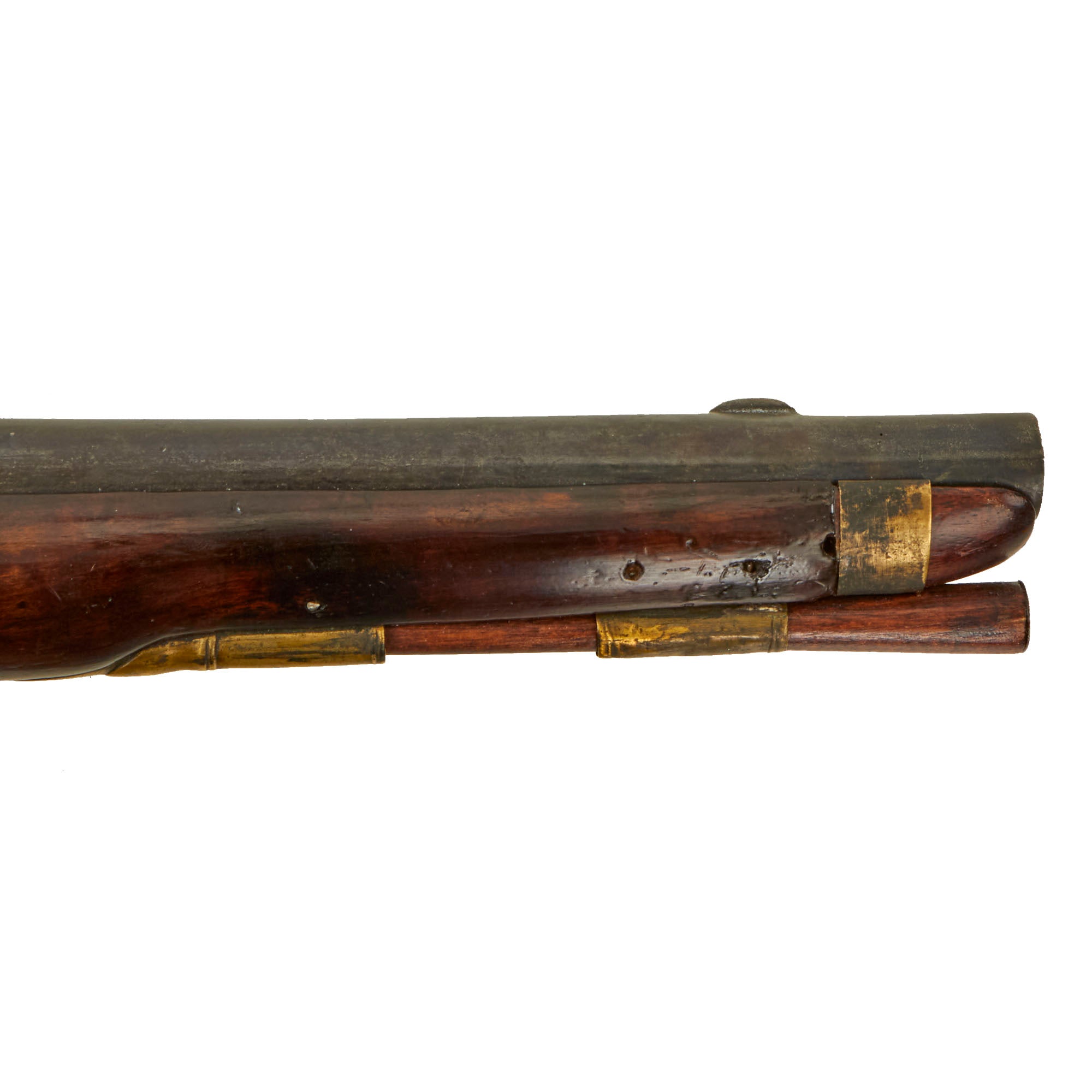 The ram-rod on the pistol appears original and still works well. There appear to be some old repairs to the wood on the front side of the lockplate, but they also appear period. The stock has scattered marks from use and a repaired brick with some losses on the left side of the forestock, towards the muzzle.