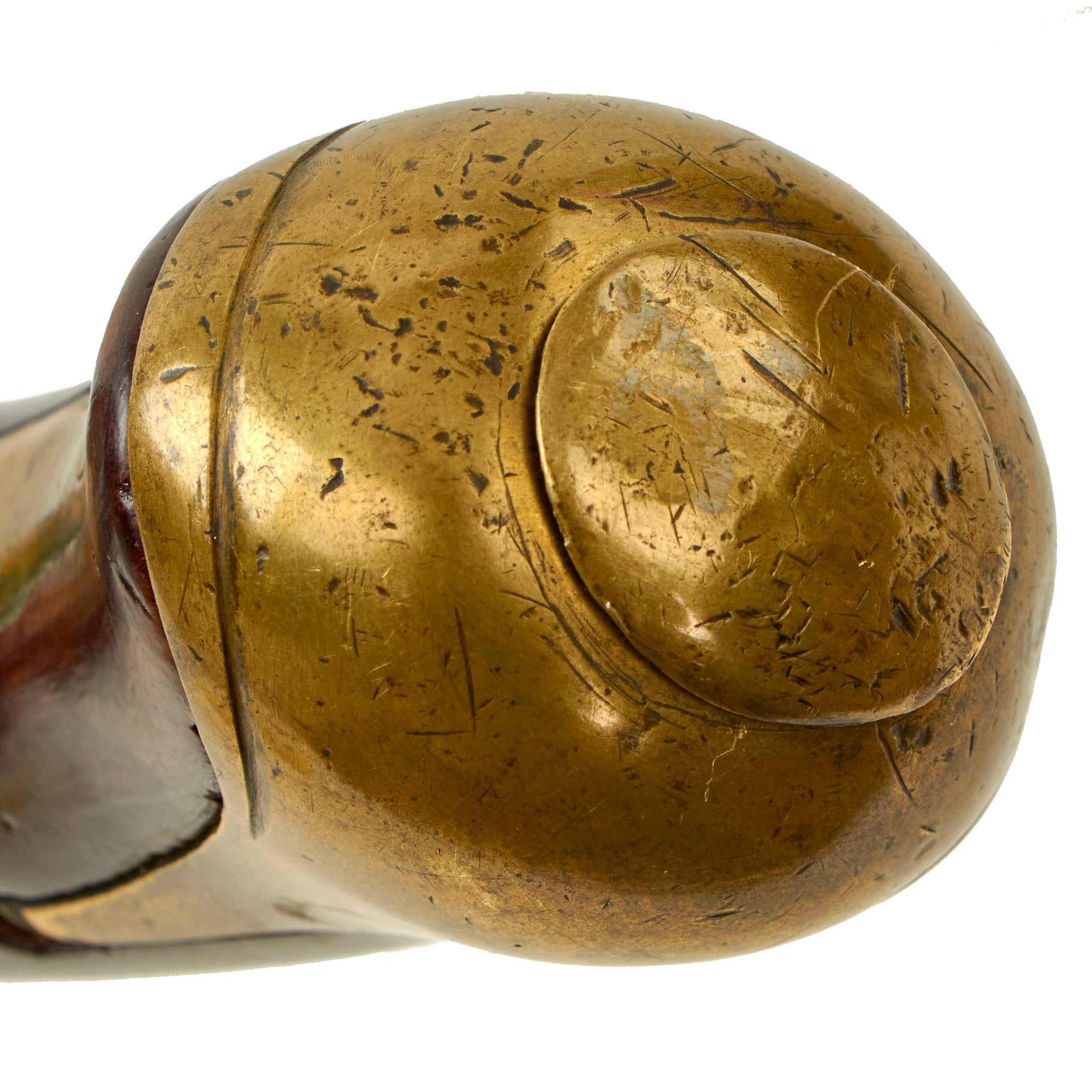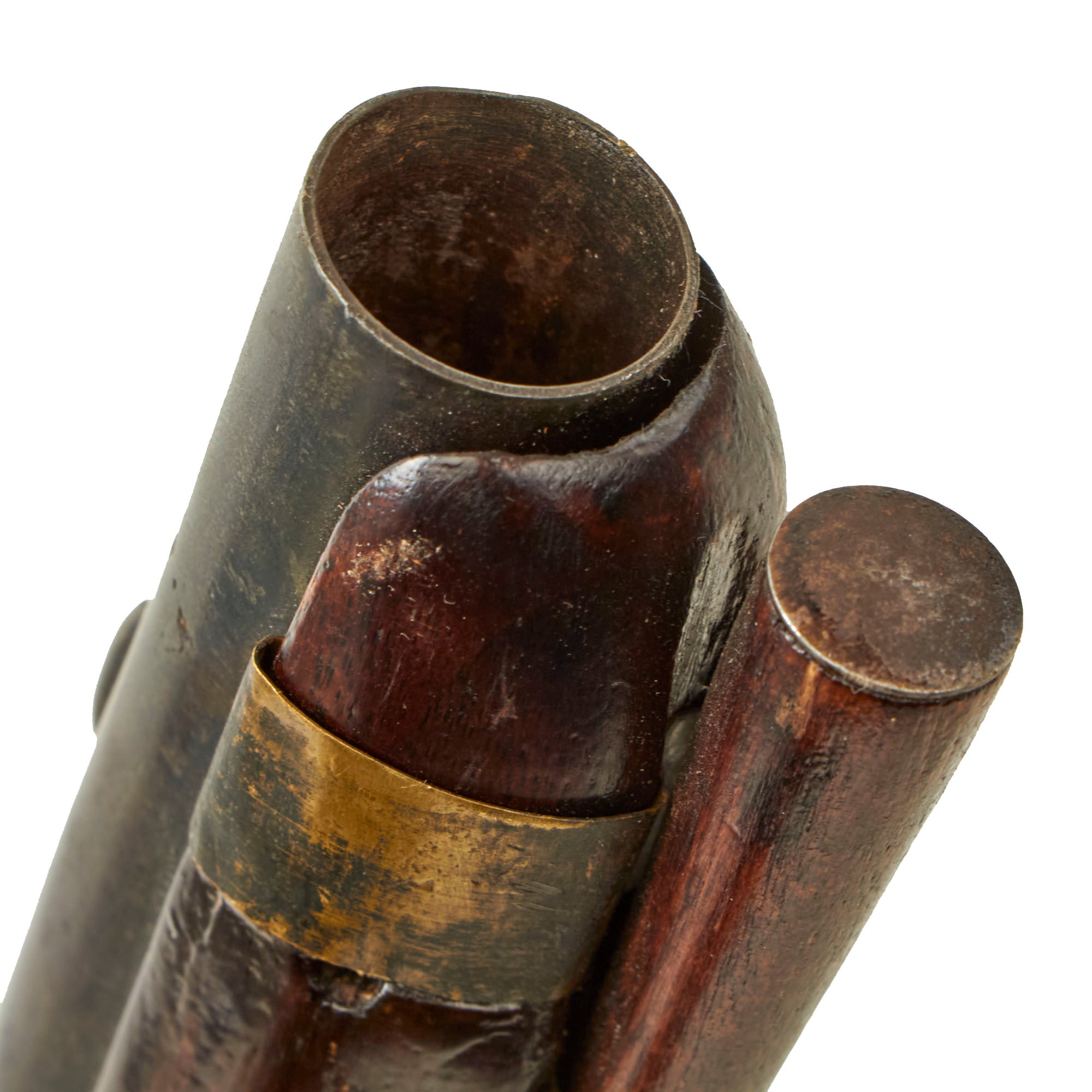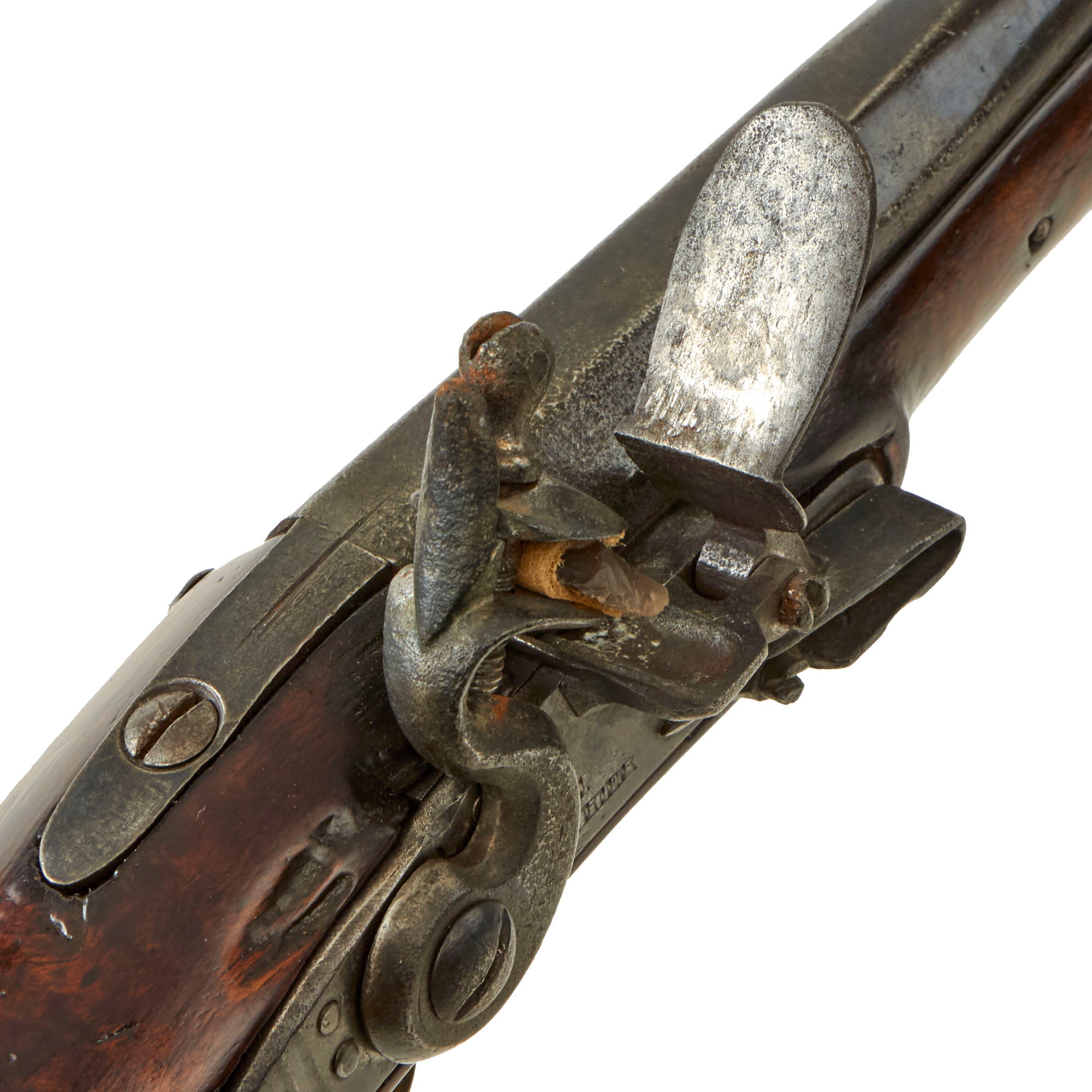The ram-rod on the pistol appears original and still works well. There appear to be some old repairs to the wood on the front side of the lockplate, but they also appear period. The stock has scattered marks from use and a repaired brick with some losses on the left side of the forestock, towards the muzzle.