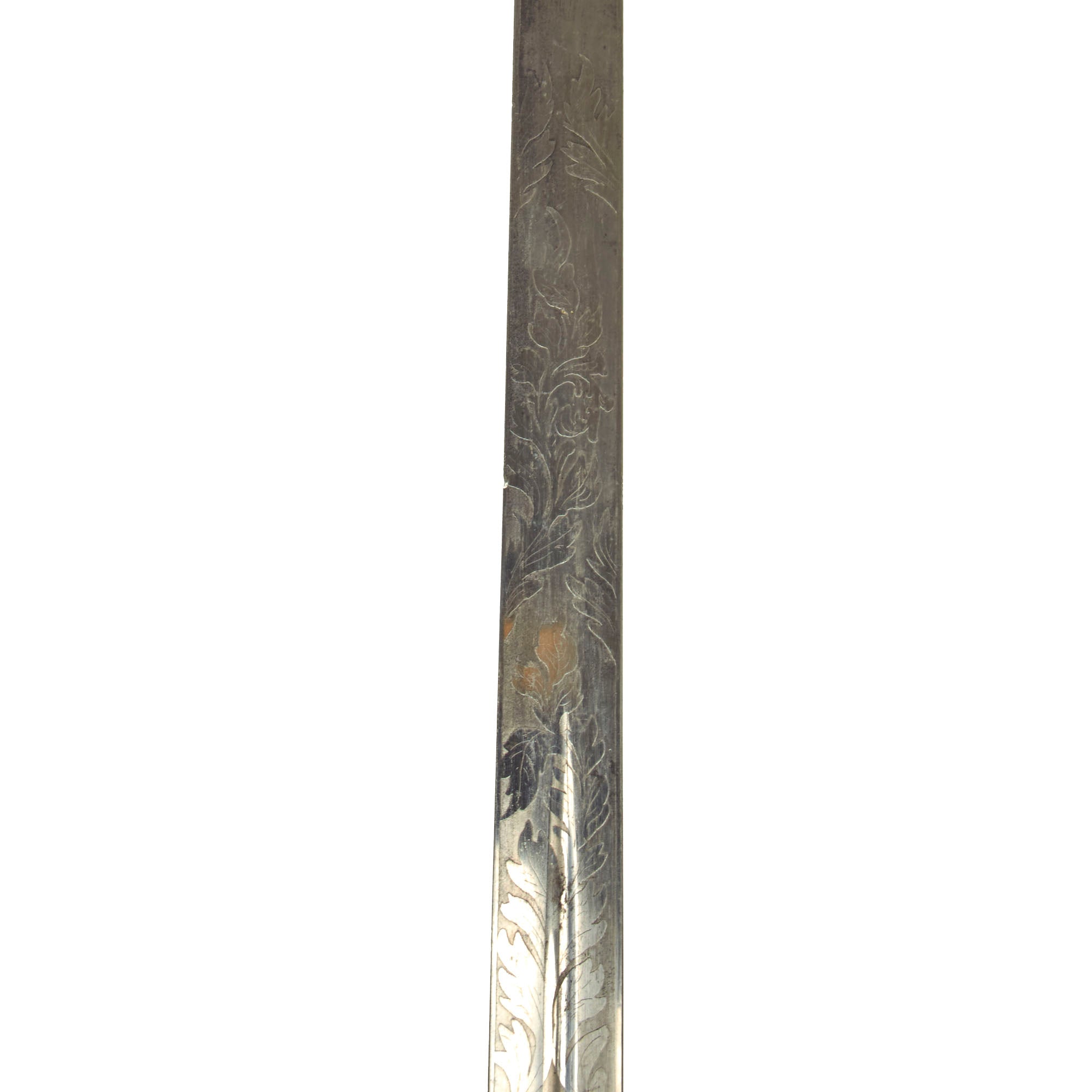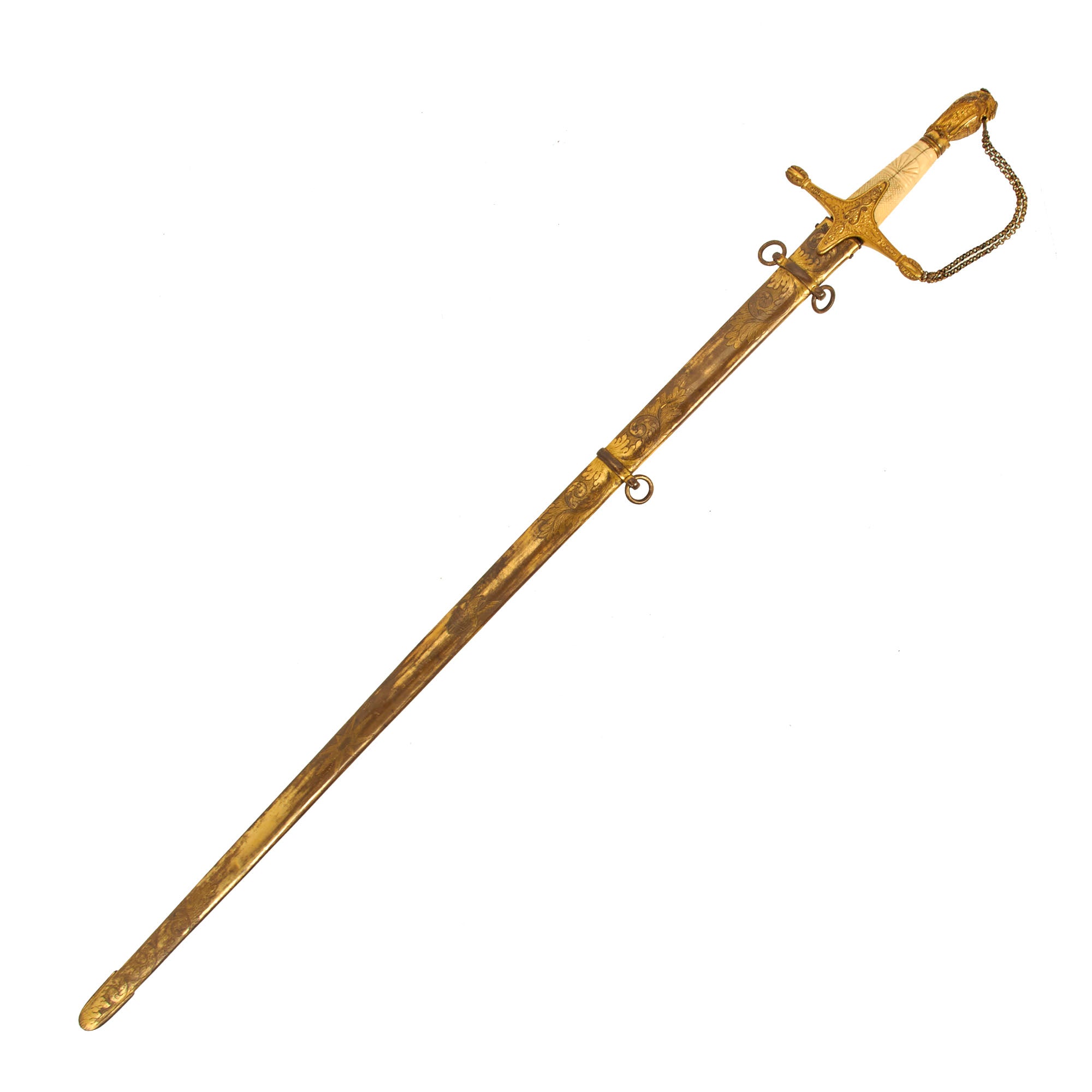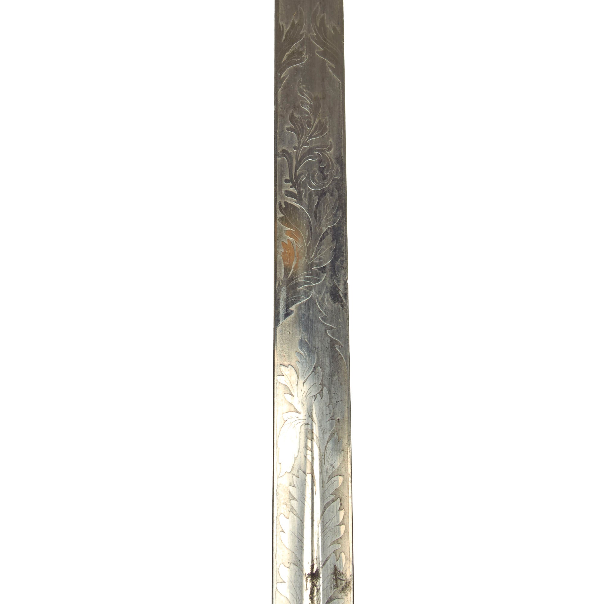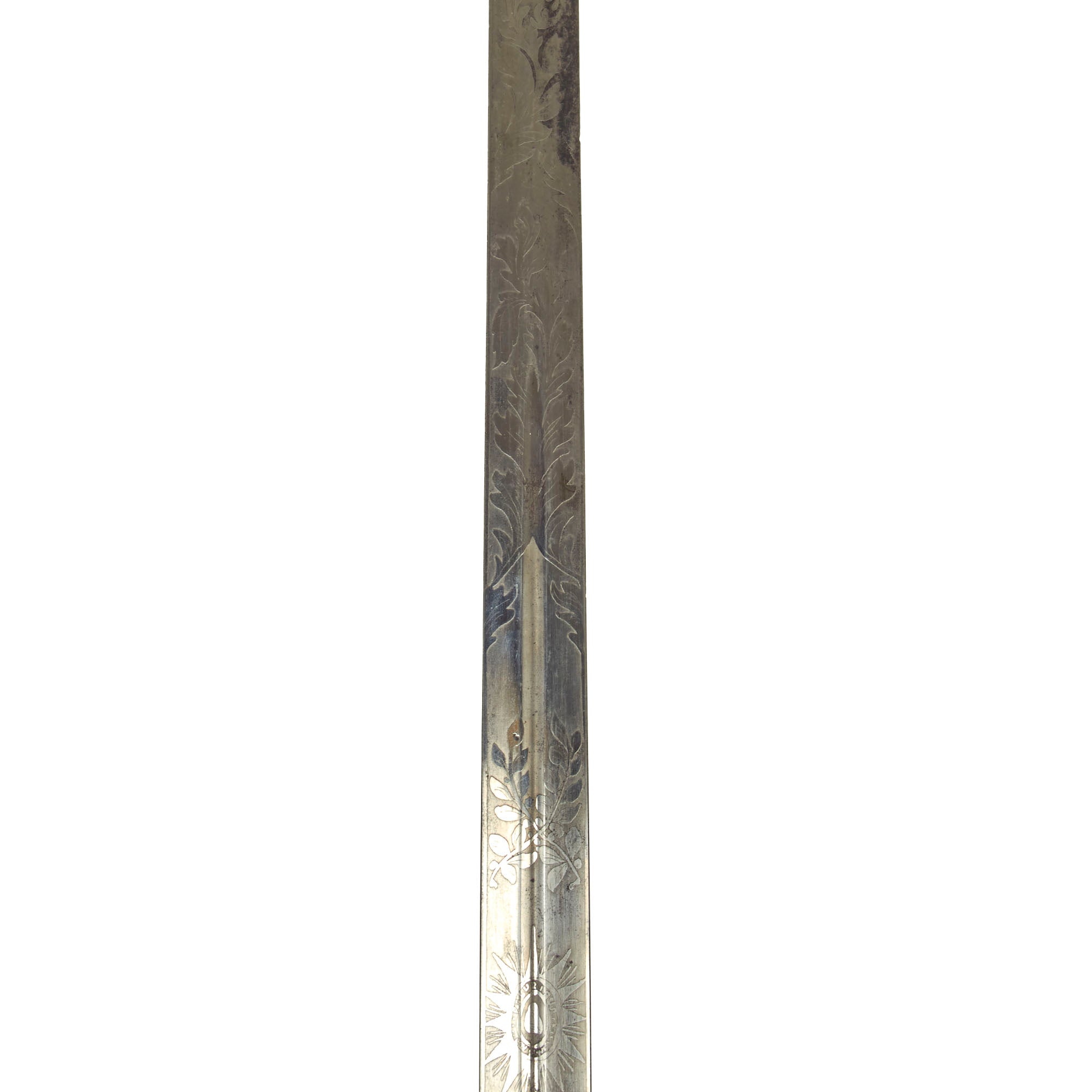 The blade is believed to be an 1834 pattern with a double-edge and thin central fuller that runs about a third of the blade The steel still retains some of its original shine, with good edge and point, and lightly frosted etching is somewhat Patriotic in nature.